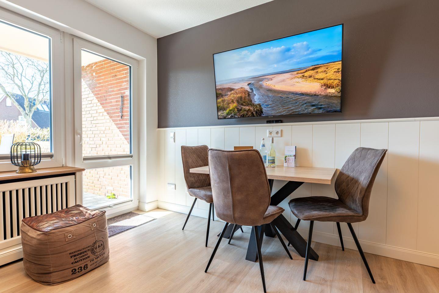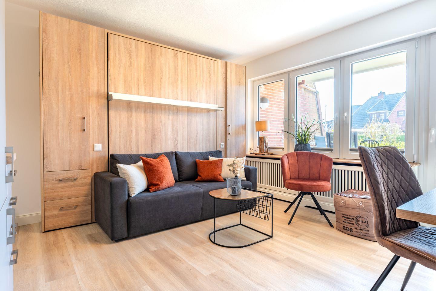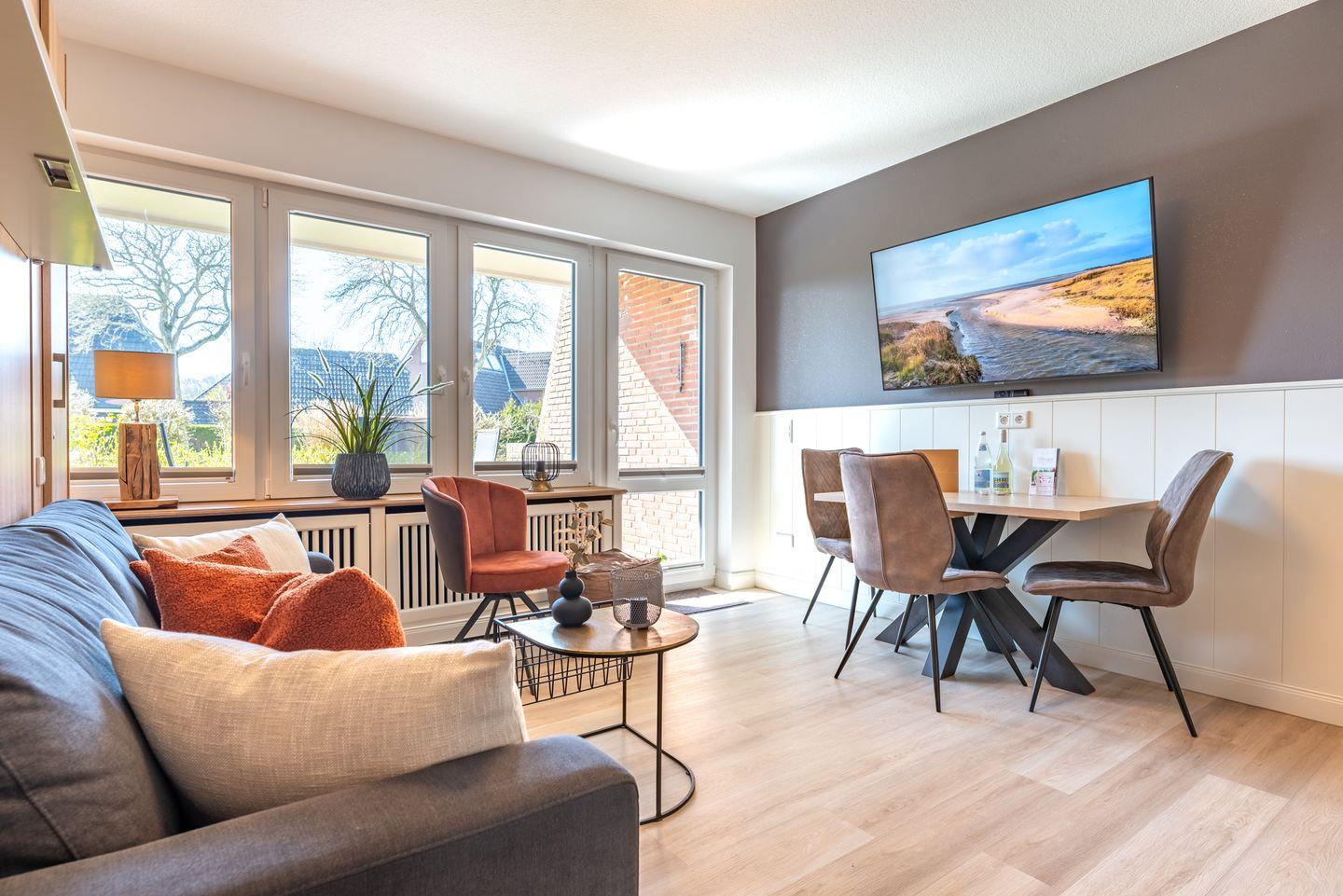 Die Wohnung erstreckt sich über 38 m² und bietet ausreichend Platz für bis zu drei Personen. Im Erdgeschoss gelegen, erreichen Sie die Wohnung bequem und mit viel Tageslicht durch die großen Fenster, die für eine helle und freundliche Atmosphäre sorgen. Die Ausstattung ist modern und wurde im Jahr 2022 vollkommen renoviert, sodass Sie in einem ansprechenden Ambiente entspannen können. Bei einer Tasse Kaffee oder einem Glas Wein genießen Sie den Ausblick und die frische Meeresbrise. Gartenmöbel und ein Sonnenschirm garantieren, dass Sie auch im Freien komfortabel entspannen können.