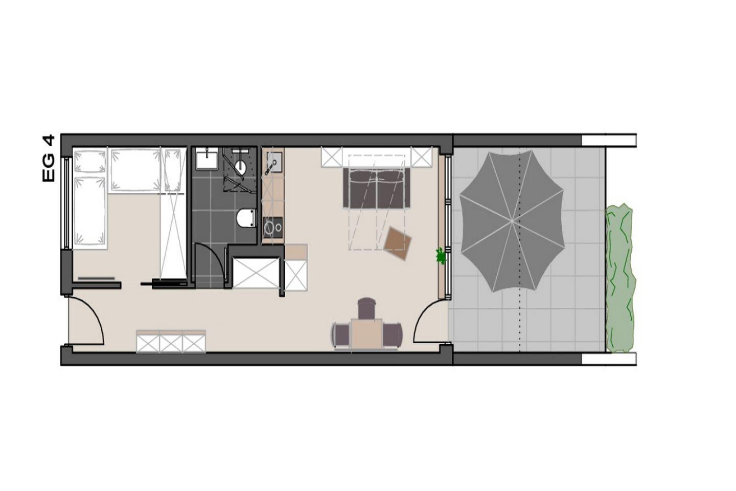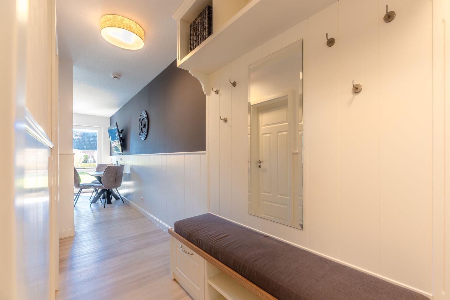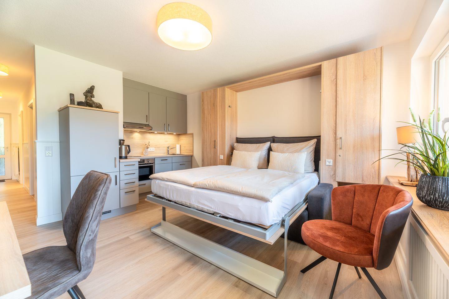 Die Wohnung erstreckt sich über 38 m² und bietet ausreichend Platz für bis zu drei Personen. Im Erdgeschoss gelegen, erreichen Sie die Wohnung bequem und mit viel Tageslicht durch die großen Fenster, die für eine helle und freundliche Atmosphäre sorgen. Die Ausstattung ist modern und wurde im Jahr 2022 vollkommen renoviert, sodass Sie in einem ansprechenden Ambiente entspannen können. Bei einer Tasse Kaffee oder einem Glas Wein genießen Sie den Ausblick und die frische Meeresbrise. Gartenmöbel und ein Sonnenschirm garantieren, dass Sie auch im Freien komfortabel entspannen können.