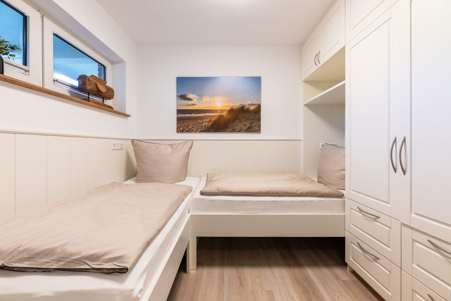 Die Matratzengröße beträgt je 90 x 200 cm, die Kopfkissen messen 80 x 80 cm, und die Bettdecken haben die Maße 135 x 200 cm. Für das Schrankbett 180 x 200 cm als Matratzengröße.