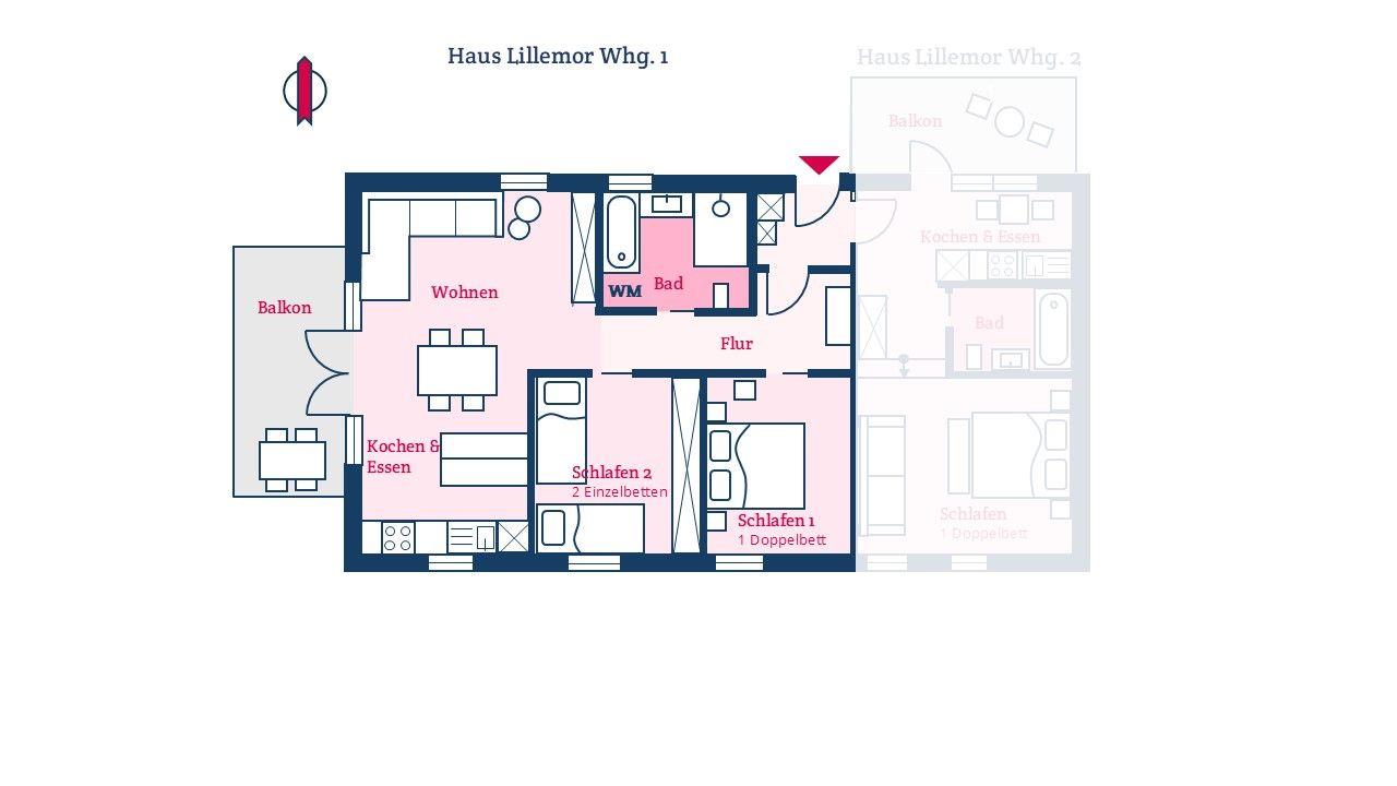 Die exklusive Ferienwohnung 1 im Haus Lillemor verfügt über 2 Schlafzimmer und 1 Bad und bietet somit komfortabel Platz für bis zu 4 Personen zuzüglich Kleinkinderaufbettung.