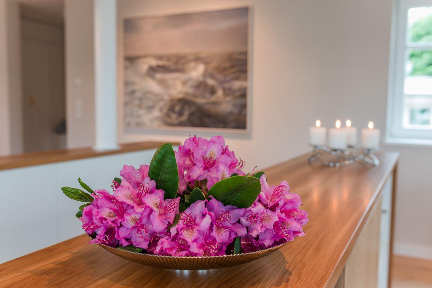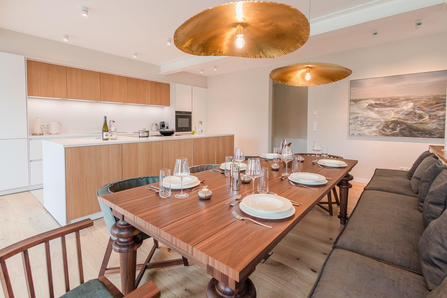 Im Erdgeschoss erwartet Sie ein großzügiger Wohn- und Essbereich mit offener, voll ausgestatteter Küche – das Herzstück der Wohnung. Hier werden Urlaubsmomente geschaffen, die in Erinnerung bleiben. Große Fensterflächen eröffnen den Blick in den eigenen, liebevoll angelegten Garten und sorgen für eine helle, einladende Atmosphäre.