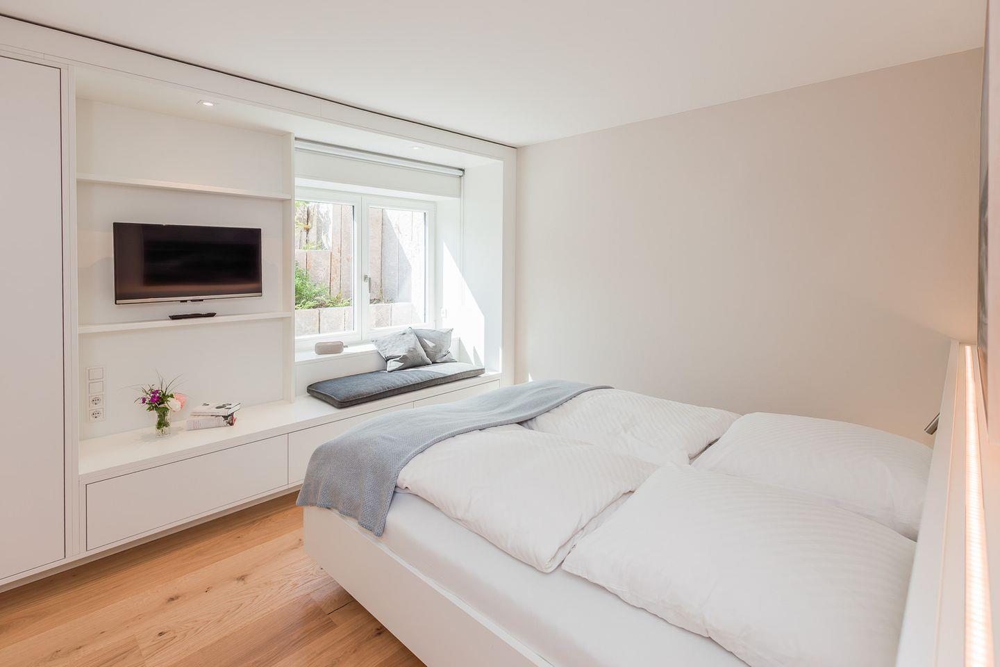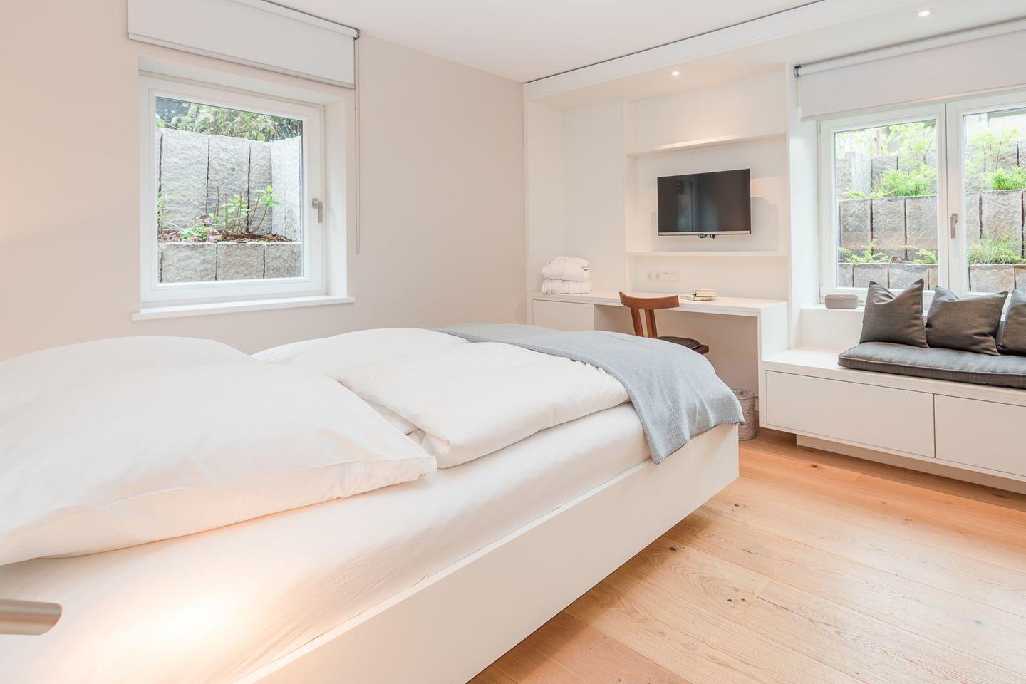Das Souterrain beherbergt drei komfortable Schlafzimmer, jeweils mit Doppelbett, Smart-TV und eigenem Bad. Ein Vollbad mit Badewanne und Dusche sowie zwei weitere moderne Duschbäder stehen zur Verfügung. Große, abgeschrägte Flächen des Außenbereichs lassen viel Tageslicht herein und schaffen ein angenehmes Raumgefühl, auch auf der unteren Ebene.