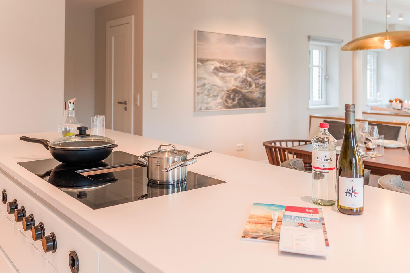 Bei Begrüßung erwartet Sie neben einer Flasche Wein und Wasser ein Präsentkorb im Einkaufswert in Höhe von 75 €, der ausschließlich Produkte der Insel Föhr in Abhängigkeit der Jahreszeiten und Verfügbarkeiten bereithält, individuell für Sie zusammengestellt.