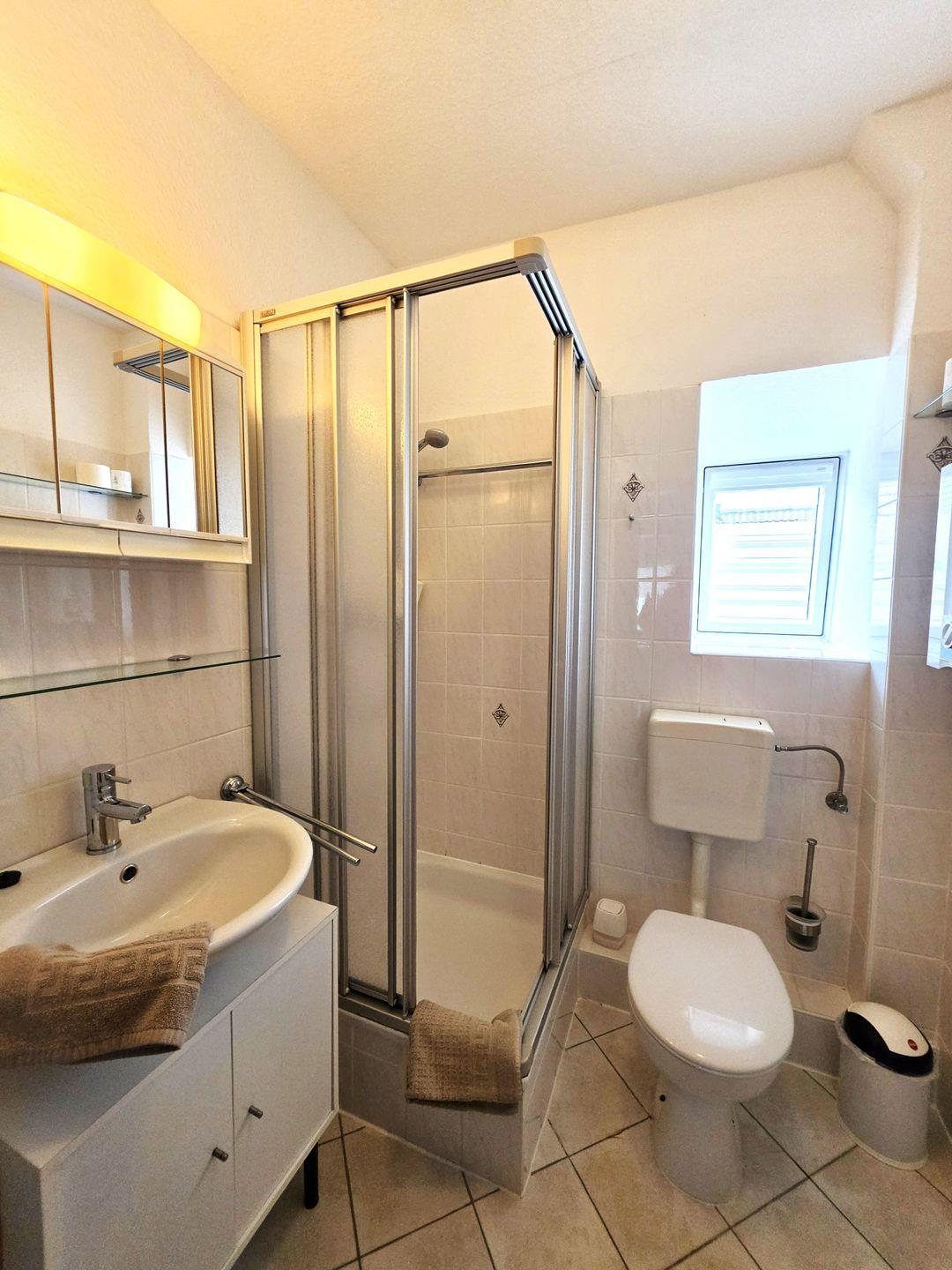 Das Badezimmer ist mit WC, Waschbecken, Spiegel und einer Dusche ausgestattet.