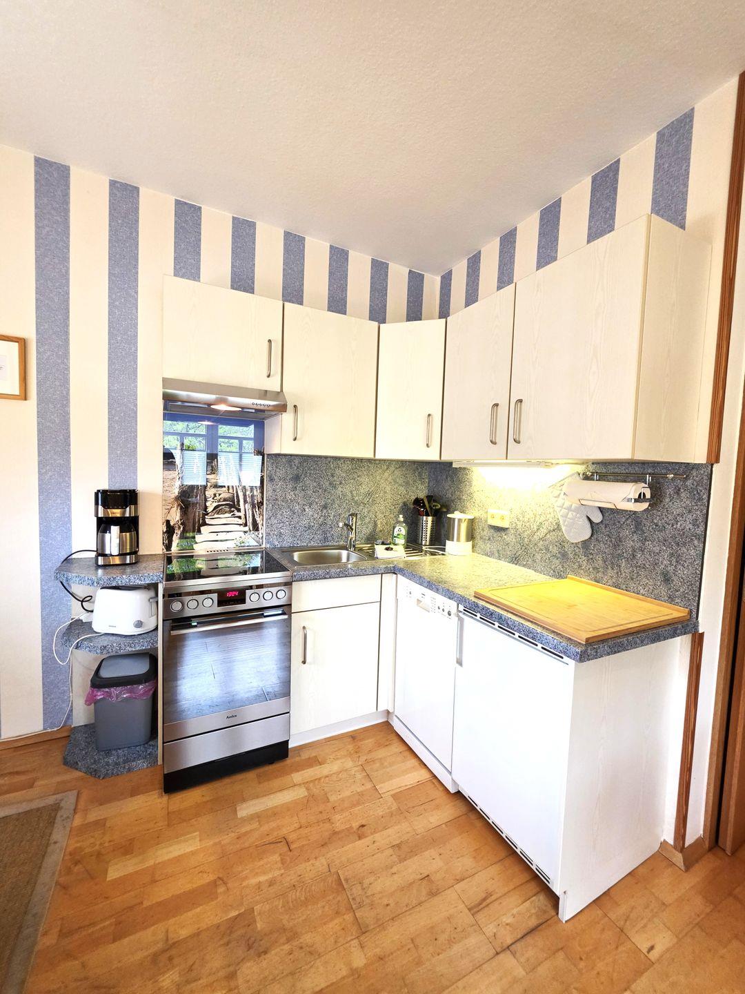 Der Wohnbereich ist mit offen gestalteter Küche angelegt und verfügt über einen Essbereich mit Esstisch. Für Ihre Selbstversorgung steht eine vollständig ausgestattete Küche bereit, inklusive 4-Platten-Herd, Backofen, Kühlschrank mit Gefrierfach im Kühlschrank, Spülmaschine sowie Küchenutensilien. Ergänzt wird die Ausstattung durch Kaffeemaschine, Wasserkocher und Toaster. Für entspannte Stunden stehen ein Sofa, TV und Radio zur Verfügung; WLAN/Internet ist vorhanden.