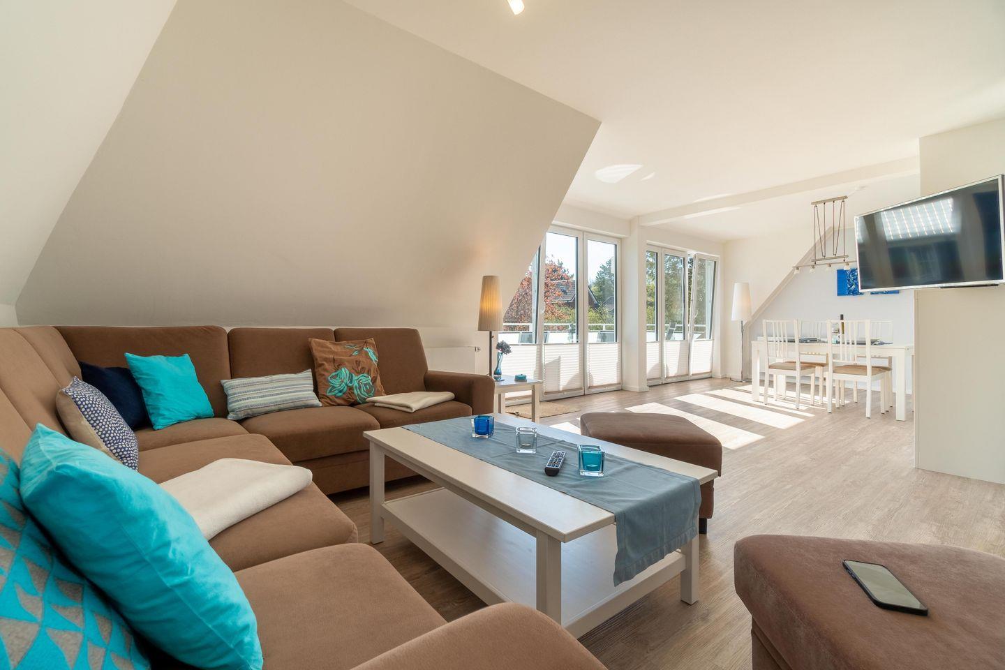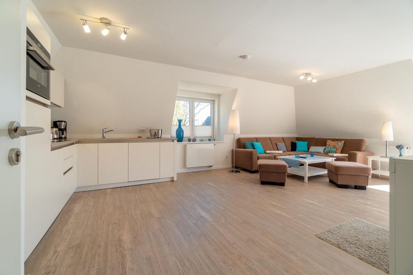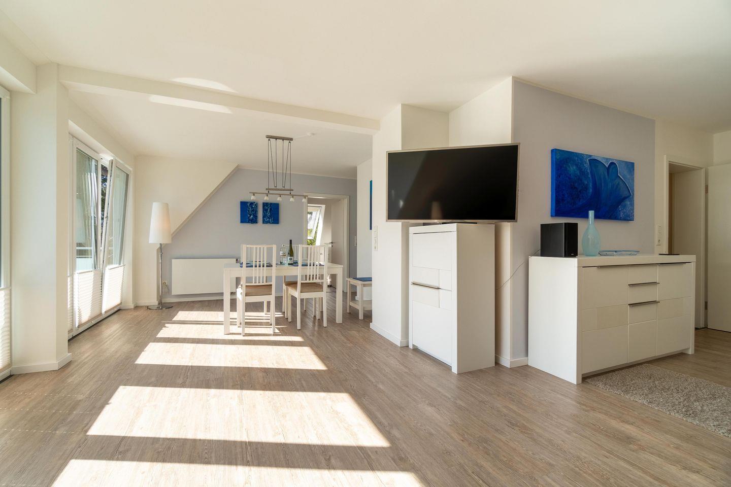 Die Ferienwohnung 3 überzeugt durch den großen, kombinierte Wohn-Essbereich mit der komplett ausgestatteten, integrierten Küche. Von hier aus haben Sie auch einen direkten Zugang auf den Balkon. 2 Schlafzimmer sowie 2 mit Fußbodenheizung versehene Duschbäder ergänzen das Wohlfühlklima. Die moderne Ausstattung der Wohnung wird Sie überzeugen, ebenso wie der große Smart-TV im Wohnbereich. Ein Flachbildfernseher ist auch in einem der beiden Schlafzimmer vorhanden.