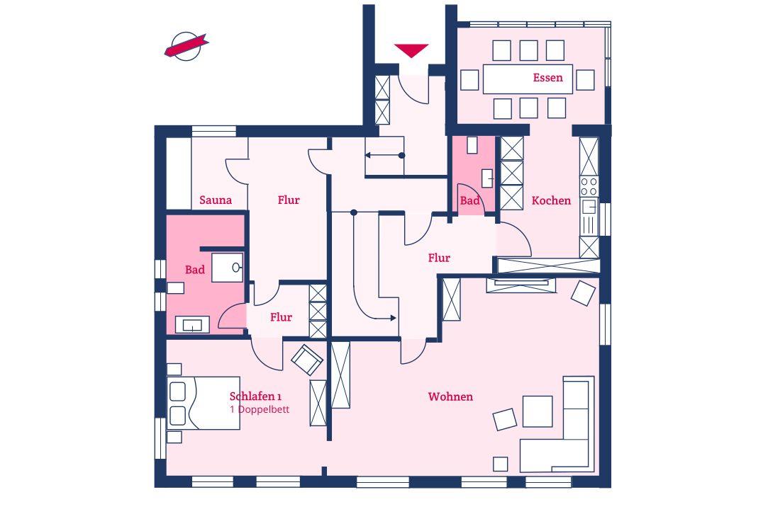 In der Stadtvilla findet eine komplette Familie mit bis zu 10 Erwachsenen komfortabel Platz! Durch den Flur gelangen Sie, am Gäste-WC vorbei, in die seperate Küche. An die Küche grenzt das Esszimmer an, welches für bis zu 10 Personen Platz bietet. Hier lassen sich gemeinsame Mahlzeiten genießen, Spieleabende verbringen oder einfach nur beim Frühstück die Zeitung lesen. Der Wohnbereich ist mit einem 65 Zoll Smart-TV ausgestattet. Trotz Innenstadtlage werden Sie hier eine erholsame Zeit zusammen mit der Familie genießen und mal wieder so richtig die Seele baumeln lassen. Im Erdgeschoss befindet sich ebenfalls die hauseigene Sauna und das erste der fünf Schlafzimmer mit angrenzendem Duschbad inklusive einer Waschmaschine und einem Trockner. In diesem Schlafzimmer gibt es auch einen BluRay-Player.