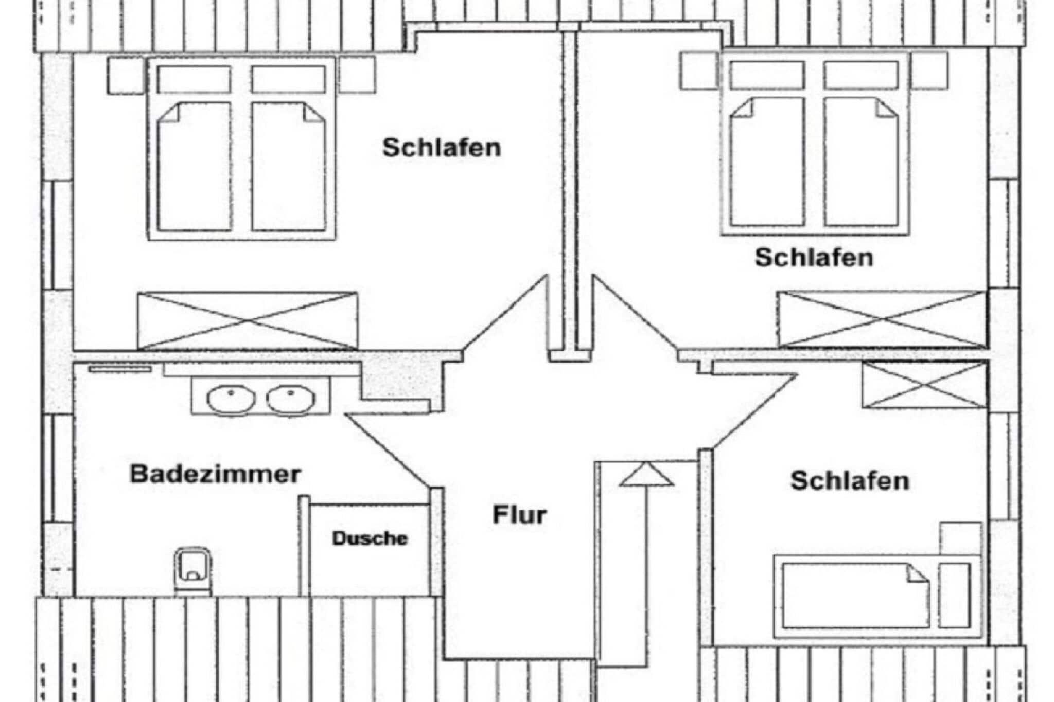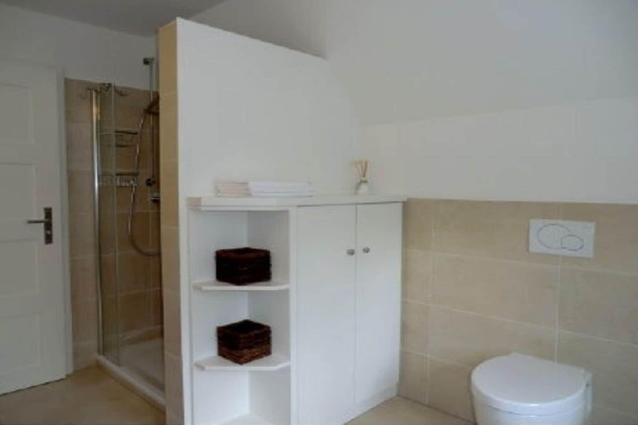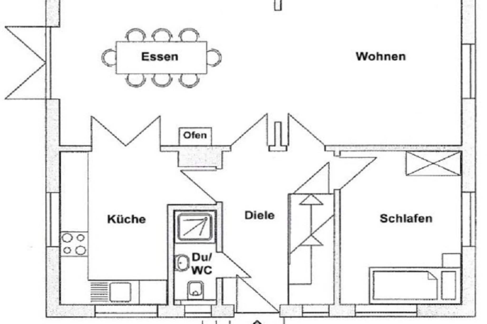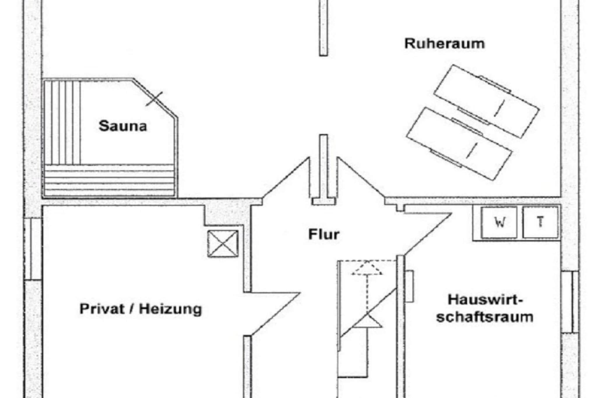 Stueetage med entré og garderobe, gæstetoilet med bruser, moderne og fuldt udstyret køkken med adgang til den store spisestue med brændeovn, adgang til haven og stuen, soveværelse med enkeltseng. Loftrum med åbent arbejdsområde og internetforbindelse (via DSL-kabel), rummeligt brusebad/toilet, to soveværelser med dobbeltsenge og et yderligere soveværelse med enkeltseng. Fuld kælder: Sauna med adgang til afslapnings-/legerum, bryggers med Miele-hvidevarer (vaskemaskine og tørretumbler).