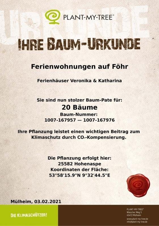 Wir spenden jährlich über PLANT-MY-TREE 20 Bäume und beziehen ausschliesslich Ökostrom für die Ferienhäuser.