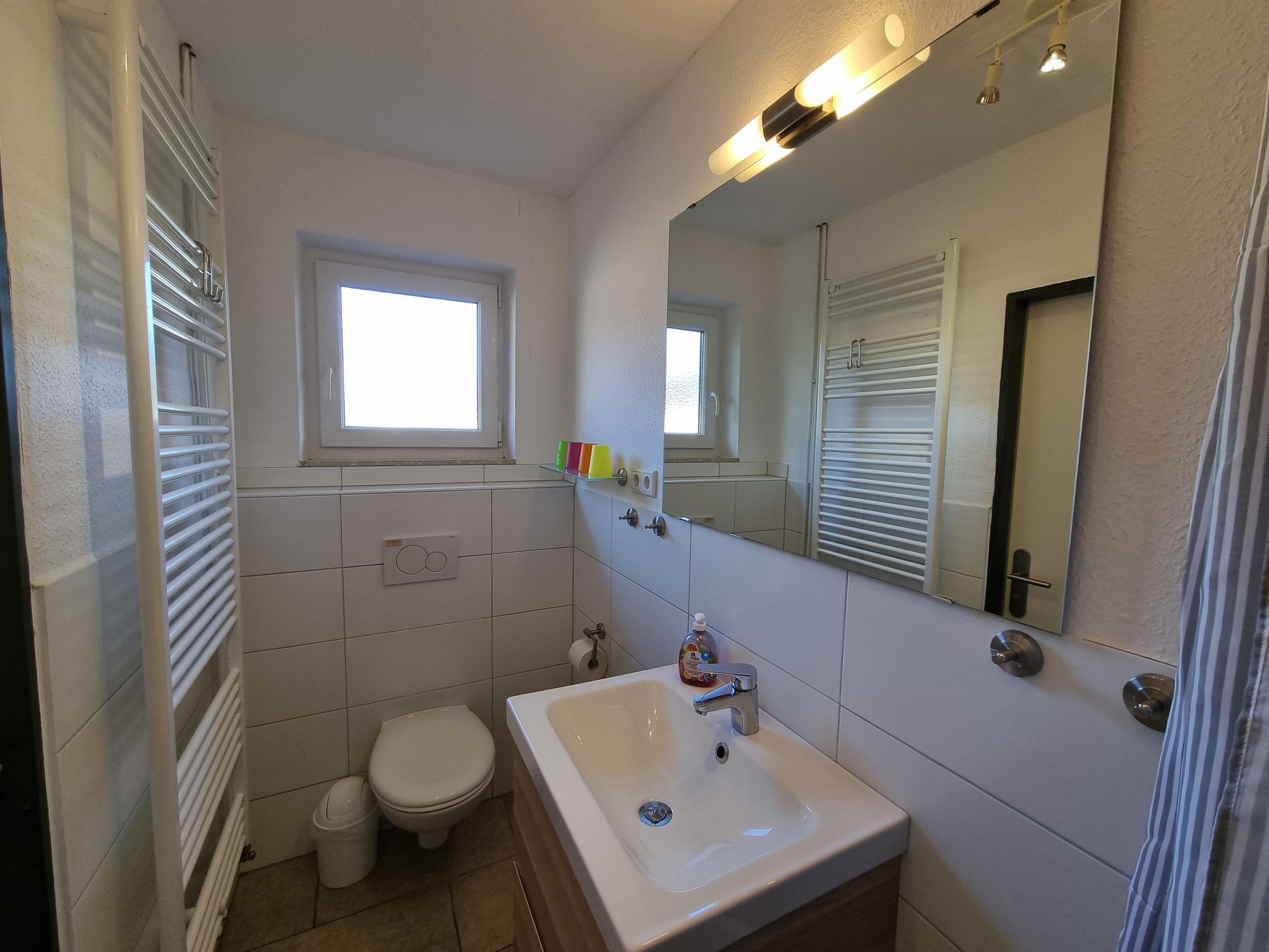 Das Badezimmer verfügt über WC, Waschbecken, Dusche und einen Föhn.