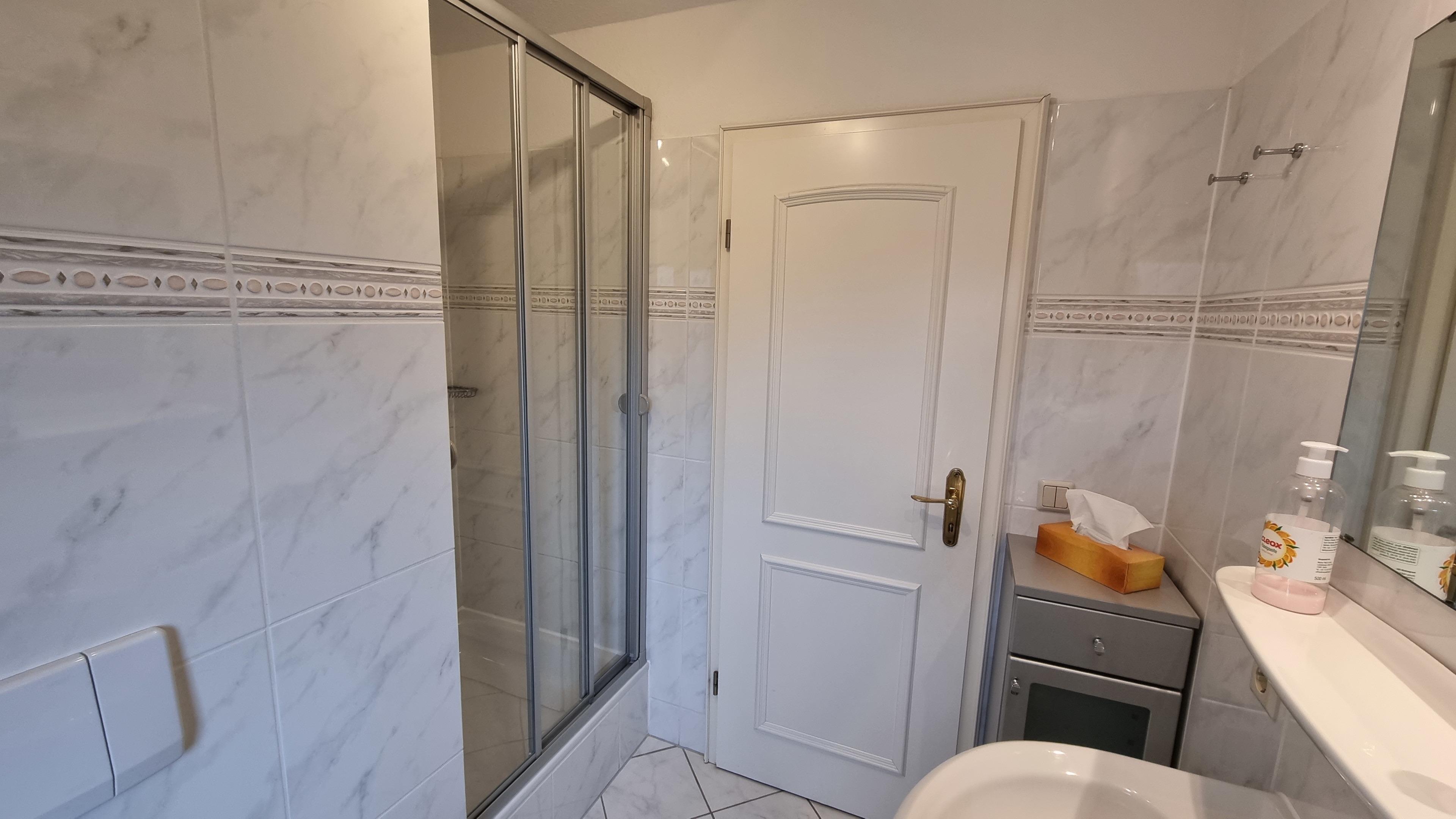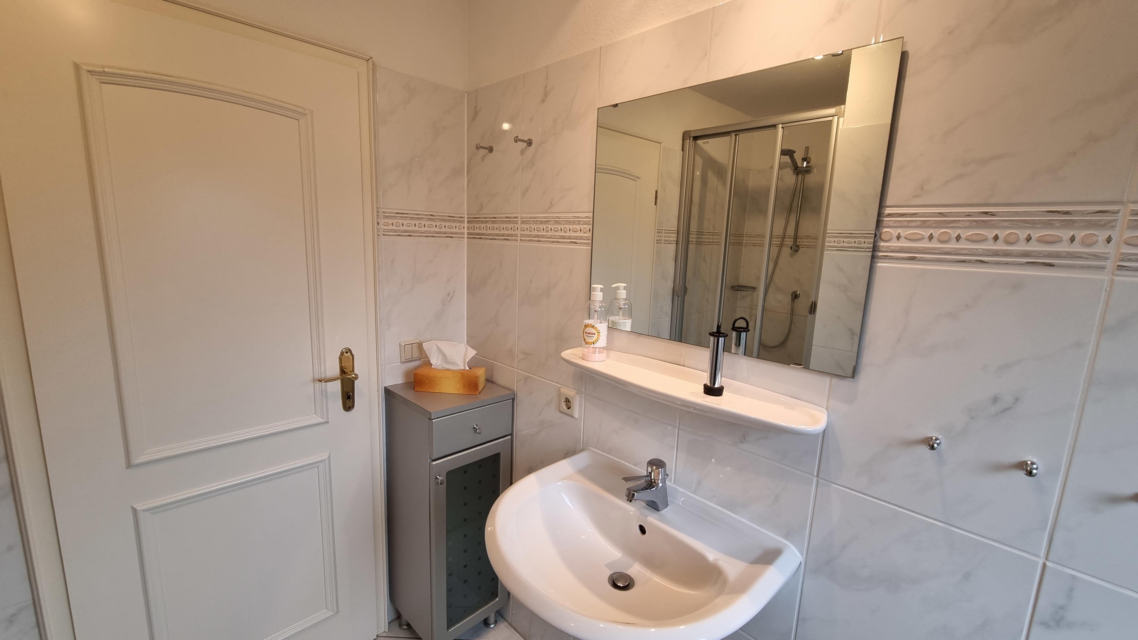 Im Badezimmer befinden sich WC, Waschbecken, Dusche sowie ein Föhn.