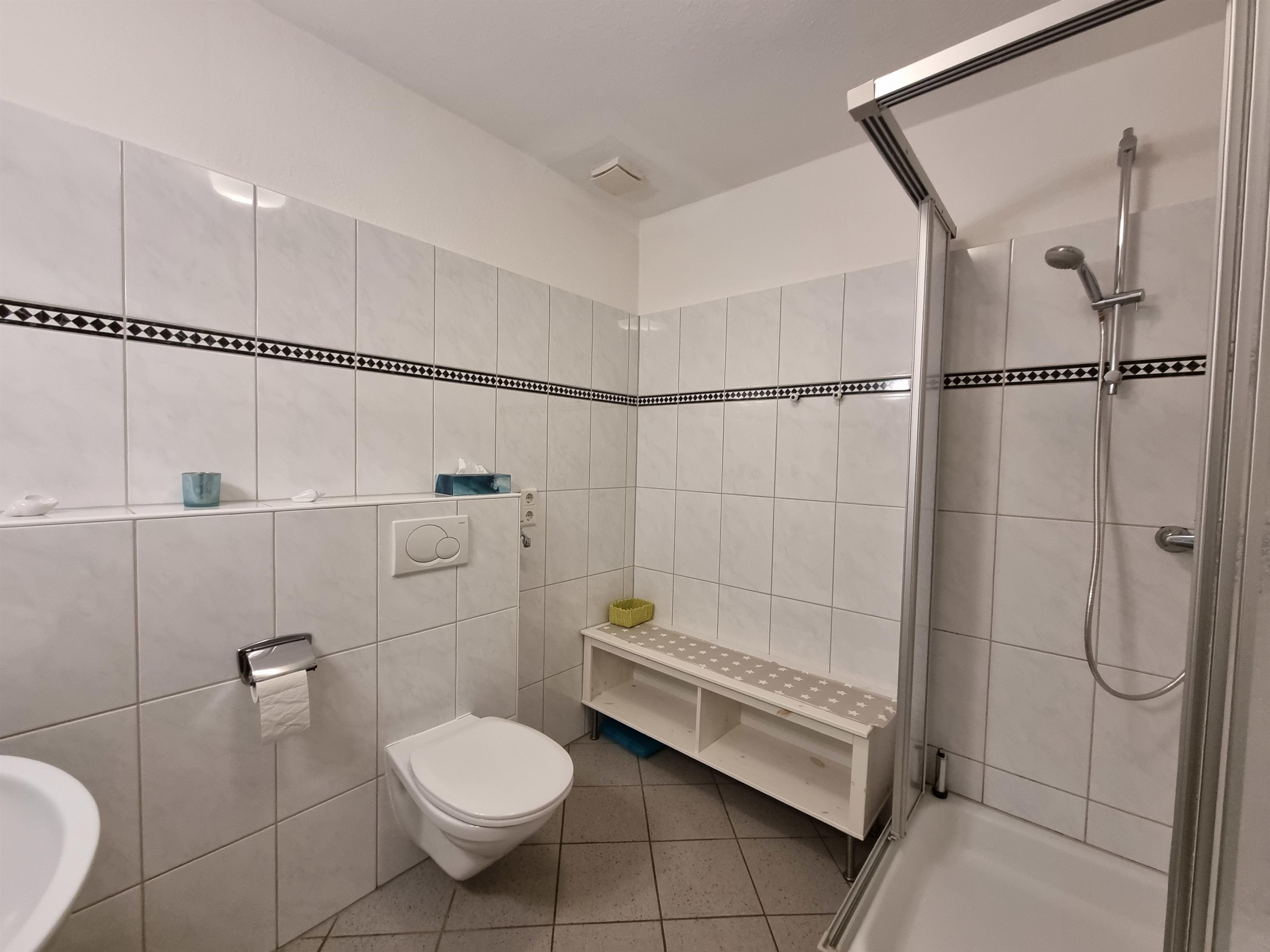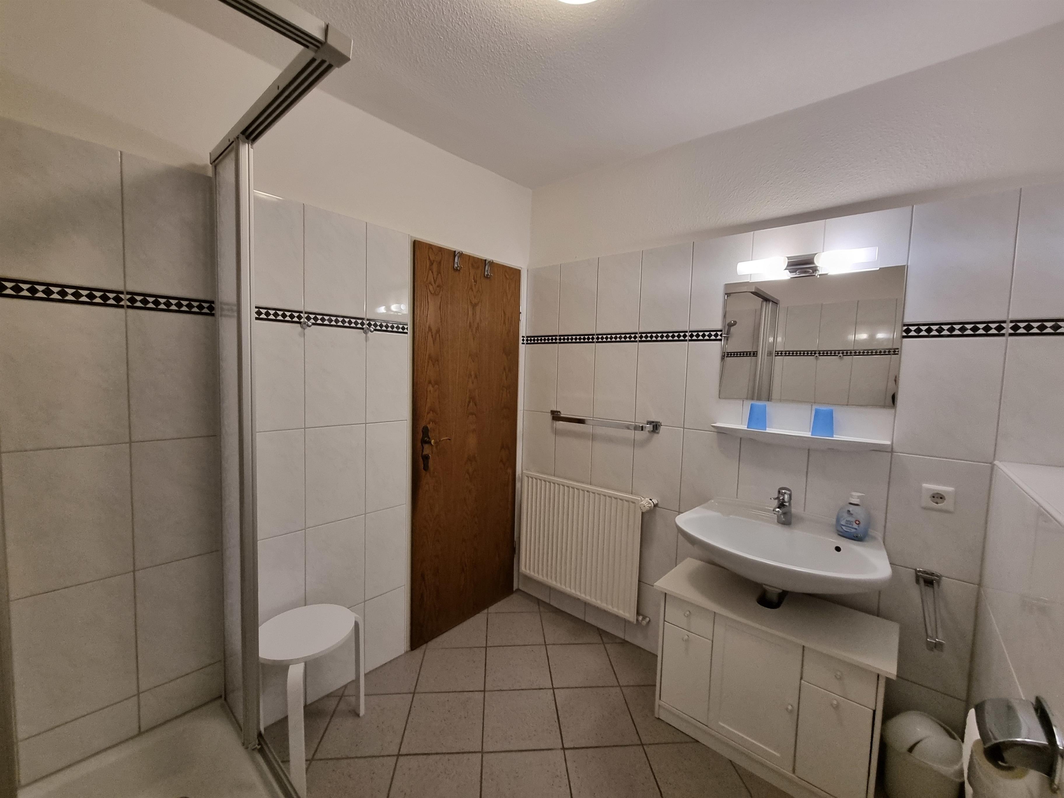 Im Badezimmer befinden sich Dusche, WC, Waschbecken sowie ein Föhn.