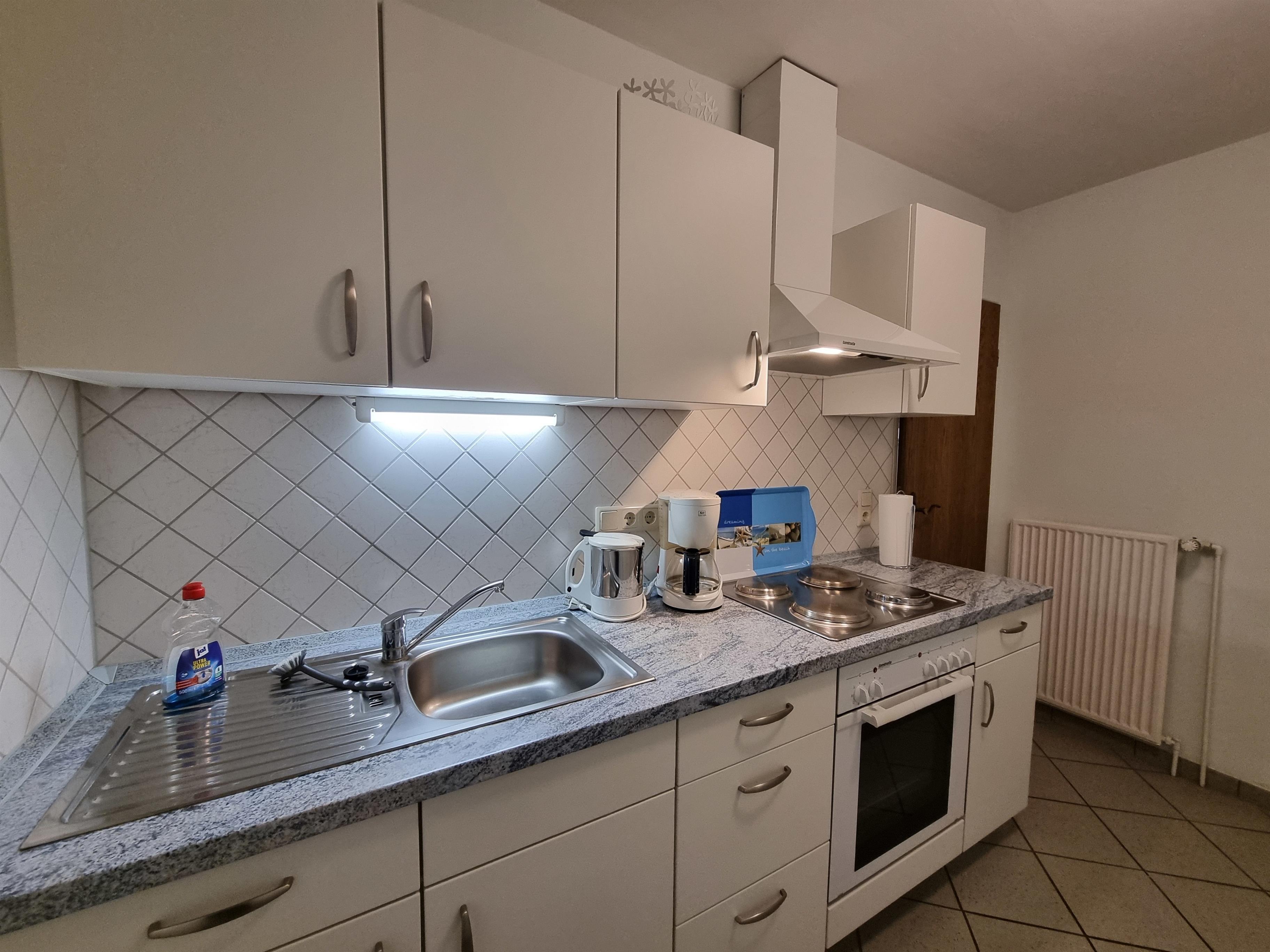 Die Wohnung verfügt über eine separate Küche, in der Sie alles finden, was Sie zum Kochen benötigen, darunter einen Backofen sowie einen Kühlschrank mit Gefrierfach.