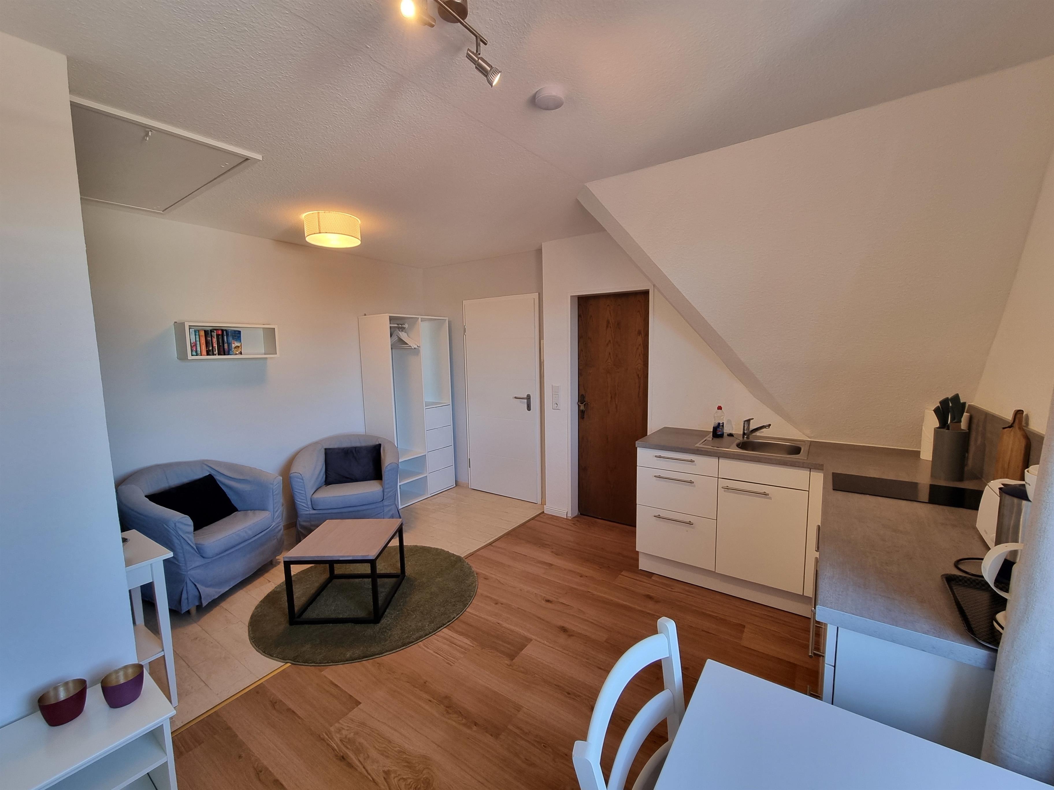 Die Wohnung verfügt über eine kleine Küchenzeile mit Herd sowie einem Kühlschrank und bietet damit die grundlegende Ausstattung für die Selbstverpflegung.