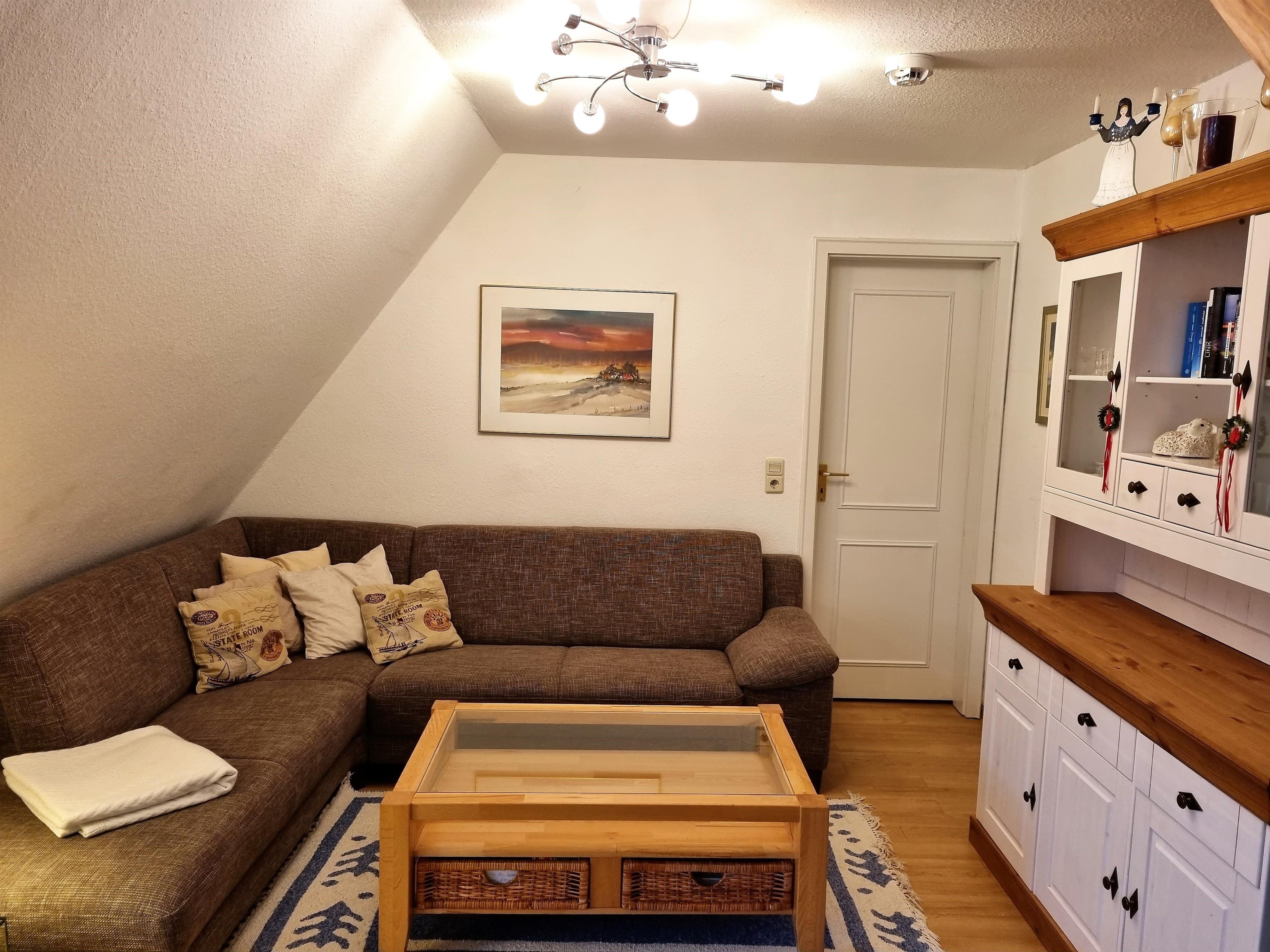 Gemütliche und urige 2-Zimmer-Ferienwohnung mit ausgebautem Spitzboden im 1. Obergeschoss in Boldixum bei Wyk auf Föhr. Die Wohnung im Reetdachhaus bietet Platz für bis zu 5 Personen, ist hundefreundlich und verfügt über Garten und Parkplatz.