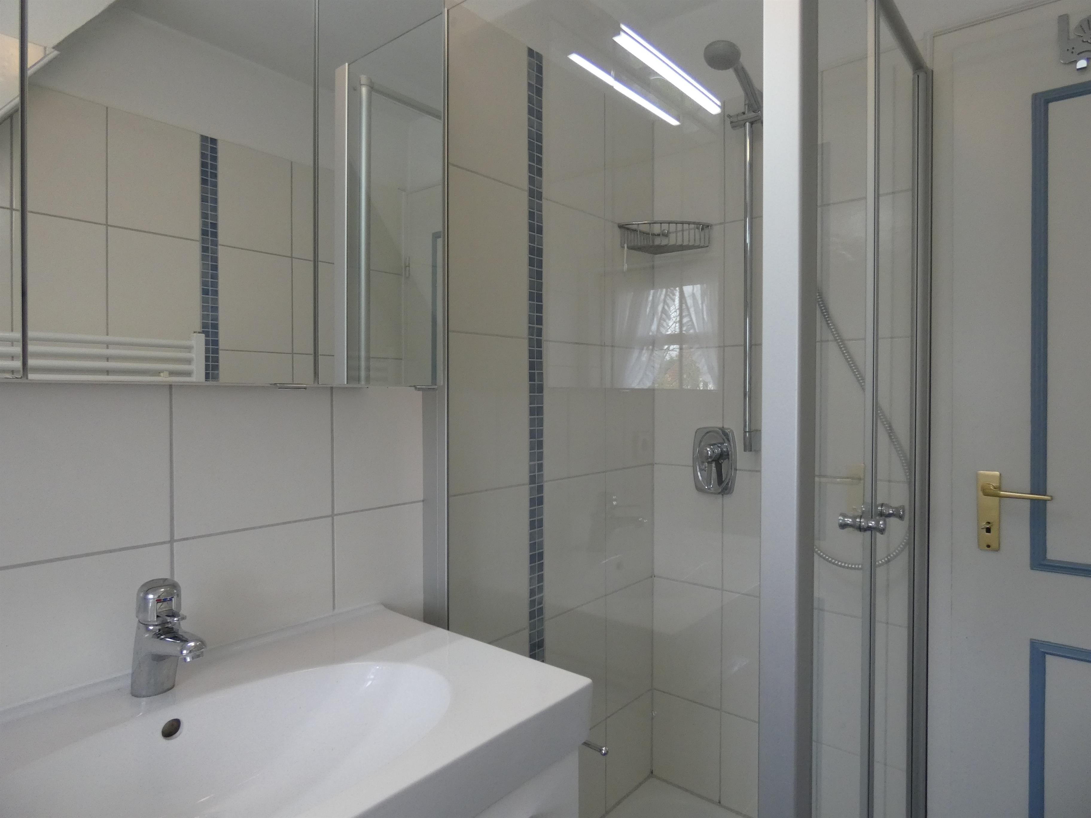 Im Badezimmer befinden sich WC, Waschbecken, Dusche sowie ein Föhn.