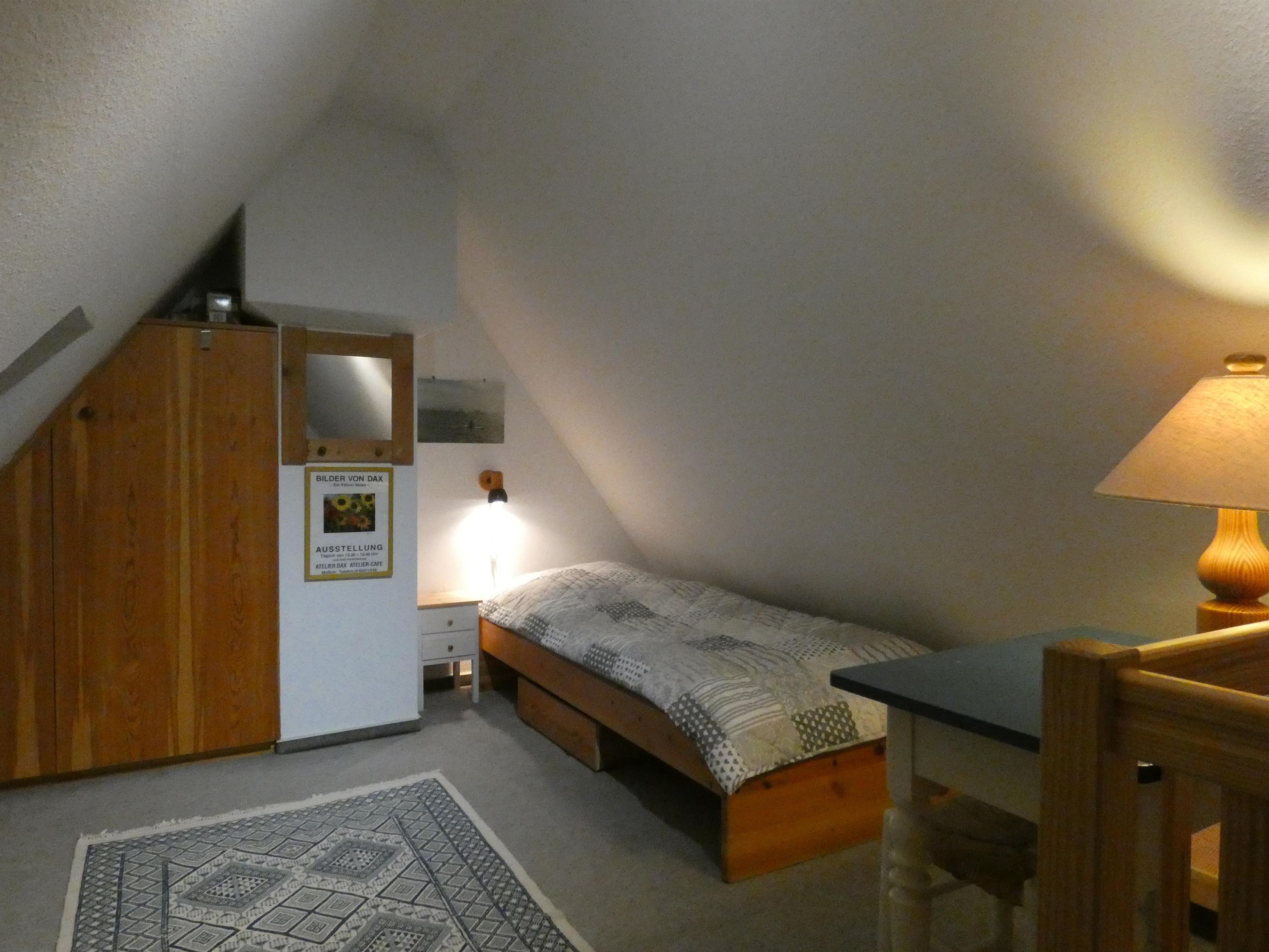 Über eine Treppe im Wohnzimmer gelangen Sie in den ausgebauten Spitzboden. Hier befinden sich drei Einzelbetten (je 0,90 × 2,00 m) sowie ein kleiner Kleiderschrank. Aufgrund der Dachschrägen ist die Raumhöhe in diesem Bereich teilweise niedriger.