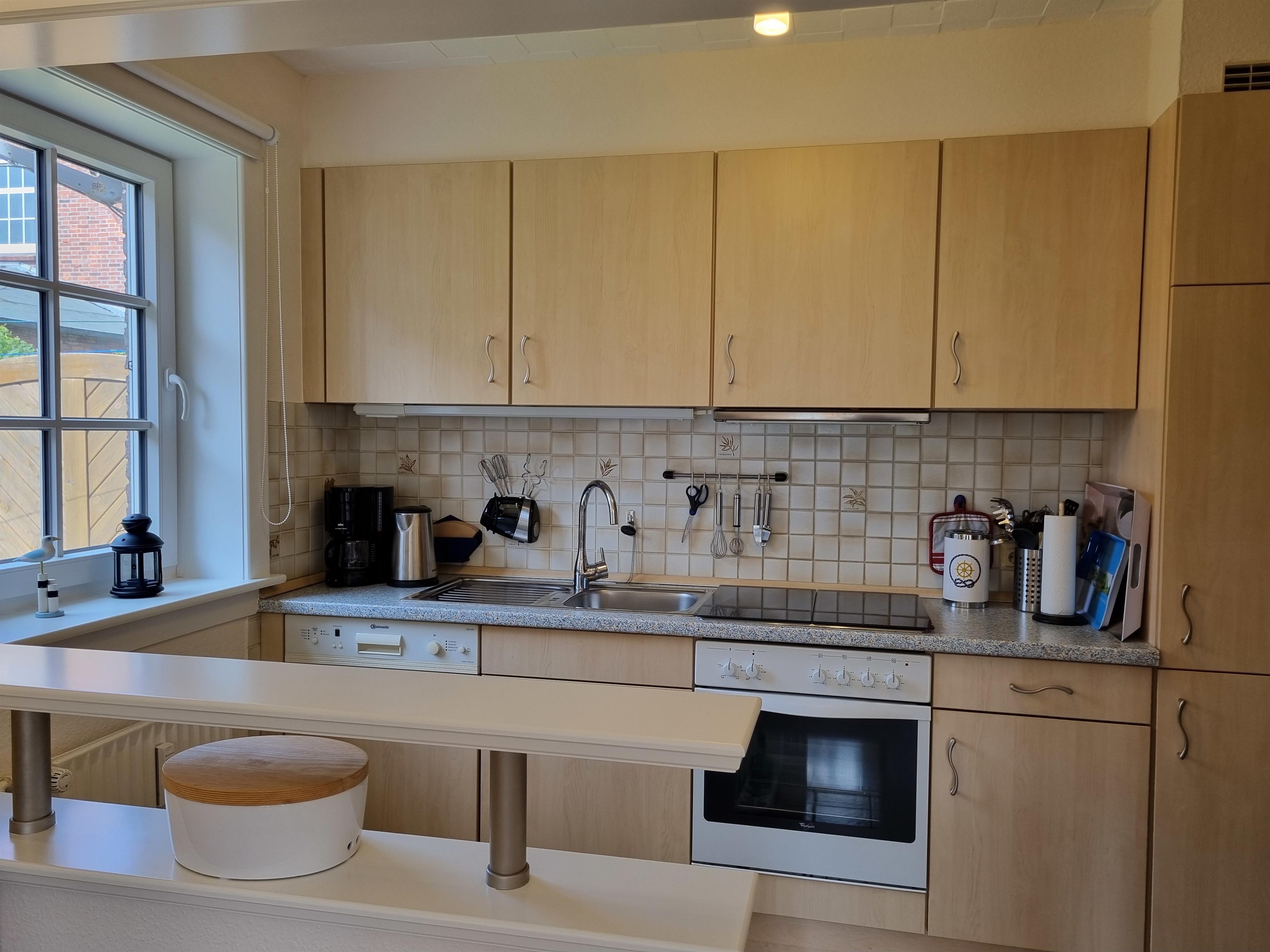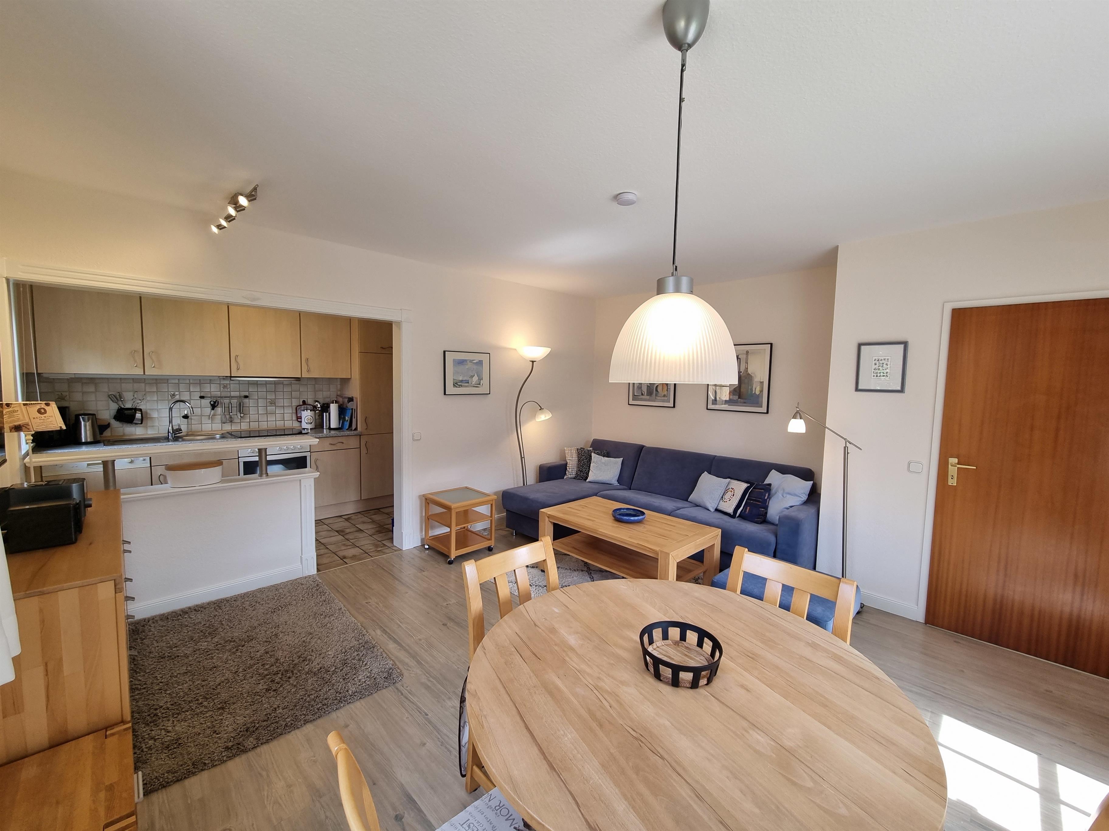 Der helle, offene Wohnbereich integriert eine moderne Einbauküche mit allem Komfort für Selbstversorger, einen gemütlichen Essbereich sowie eine behagliche Sitzecke zum Entspannen.