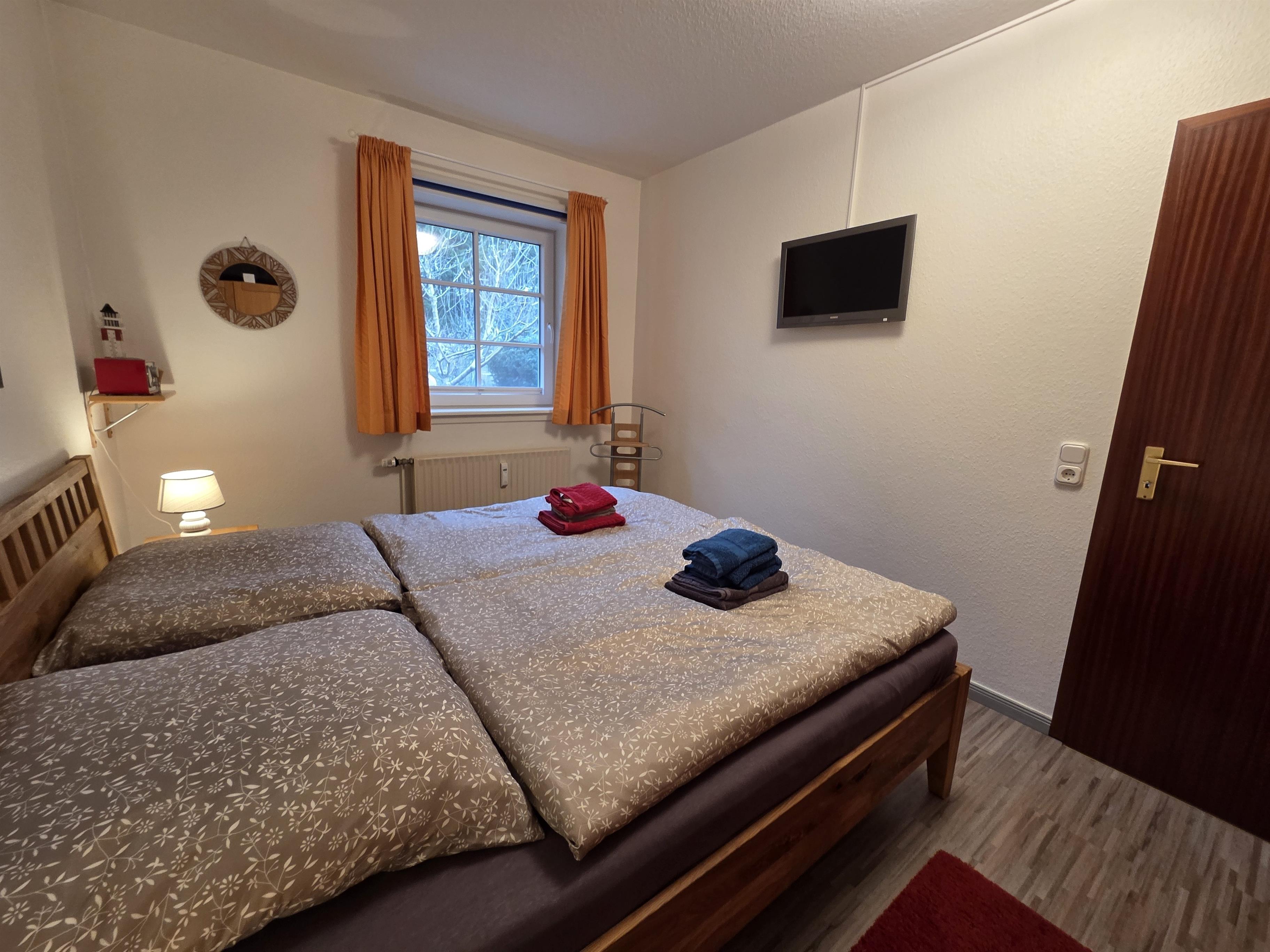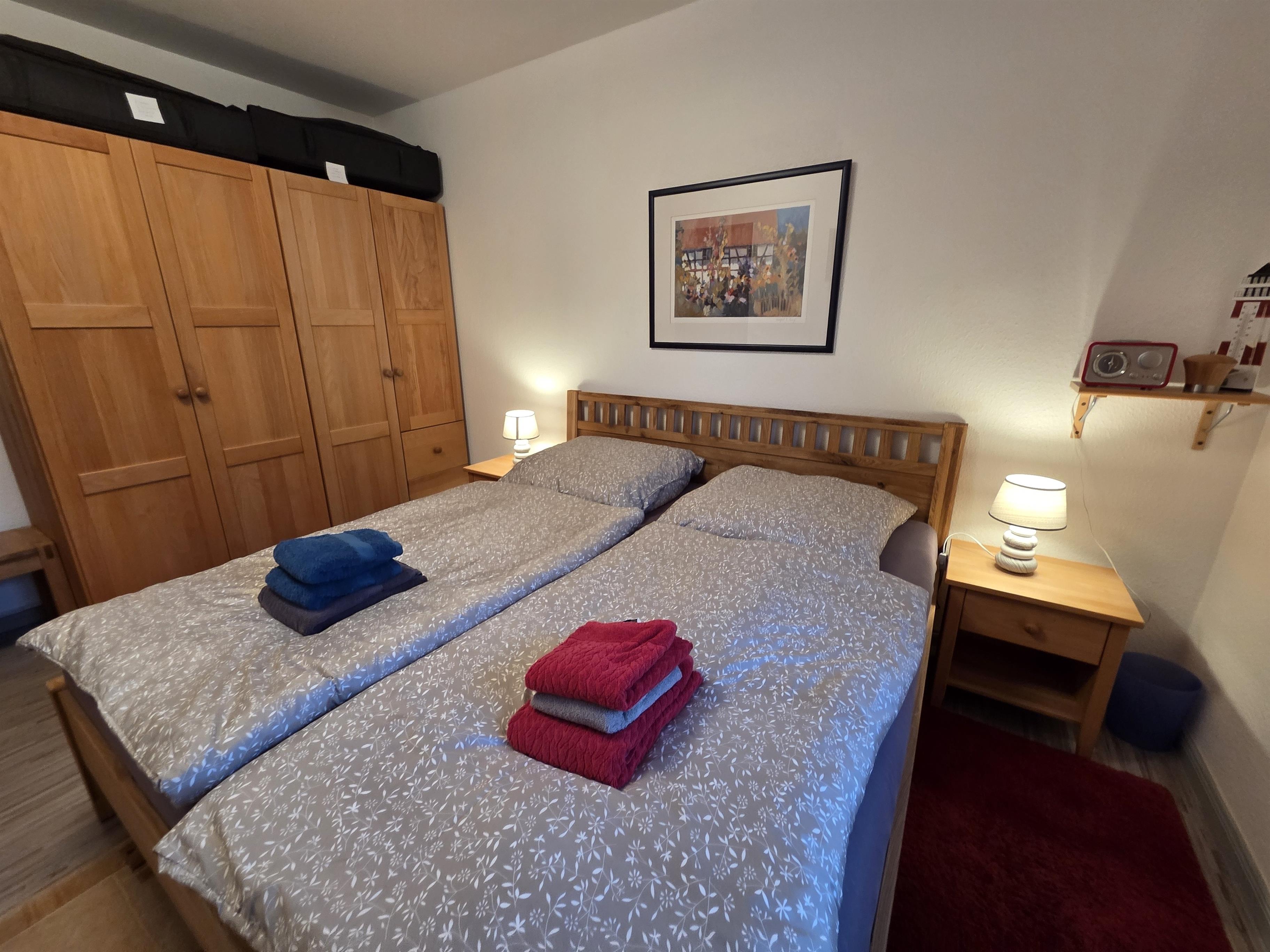Das Schlafzimmer ist mit einem Doppelbett (1,80 × 2,00 m) mit geschlossenem Fußende sowie einem geräumigen Kleiderschrank ausgestattet.
