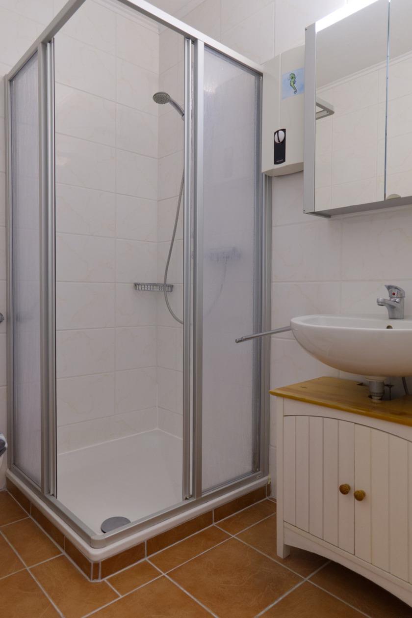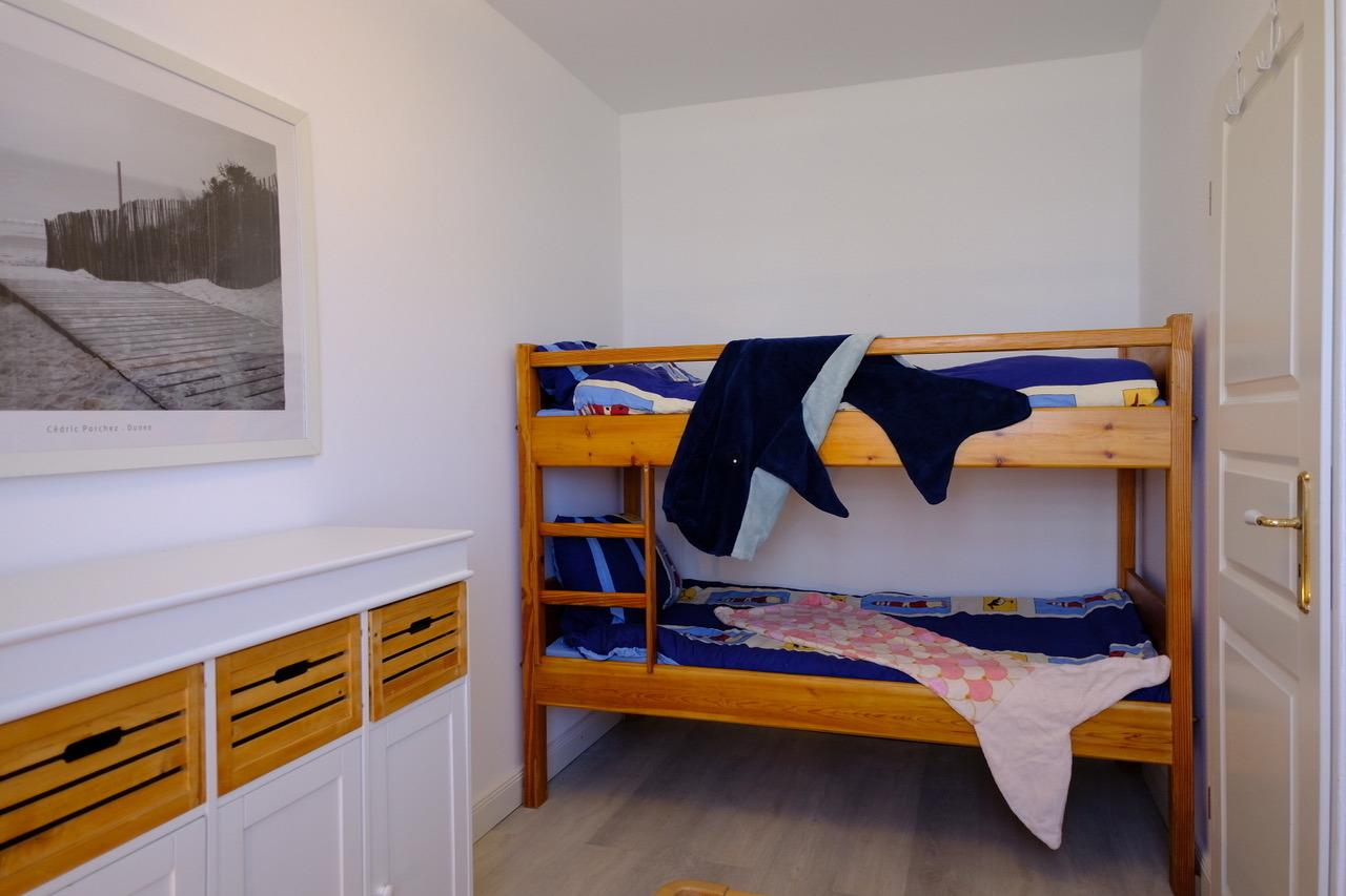 Ebenfalls im Erdgeschoss liegt ein weiteres Schlafzimmer, ausgestattet mit einem Einzelbett (1,00 × 1,90 m) sowie einem Etagenbett (0,90 × 1,80 m). Ein modernes Duschbad befindet sich ebenfalls auf dieser Etage.