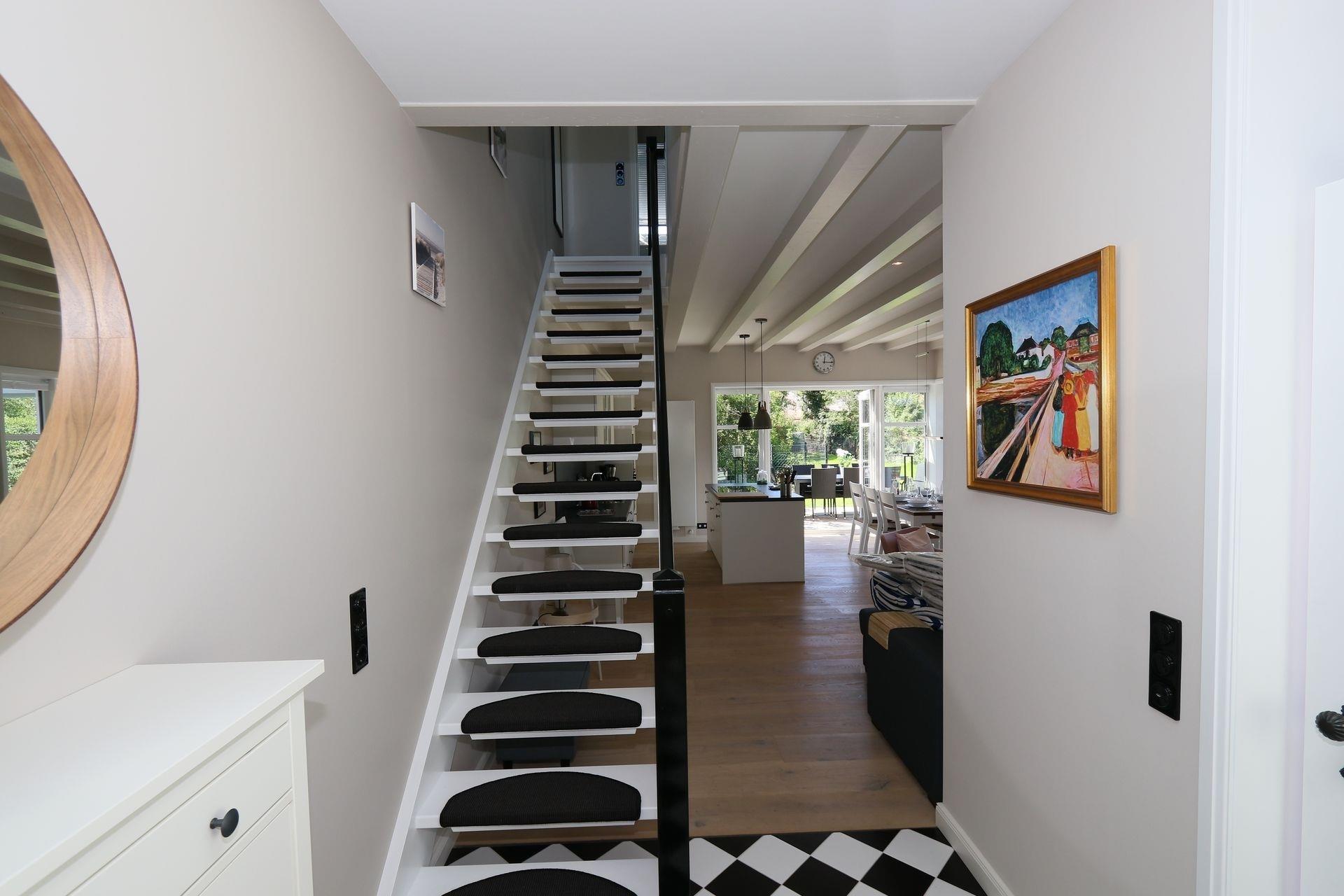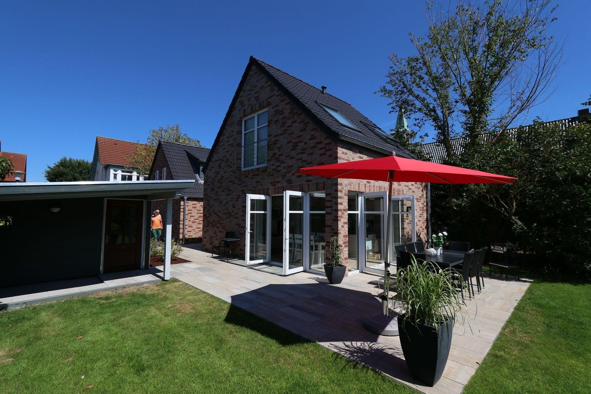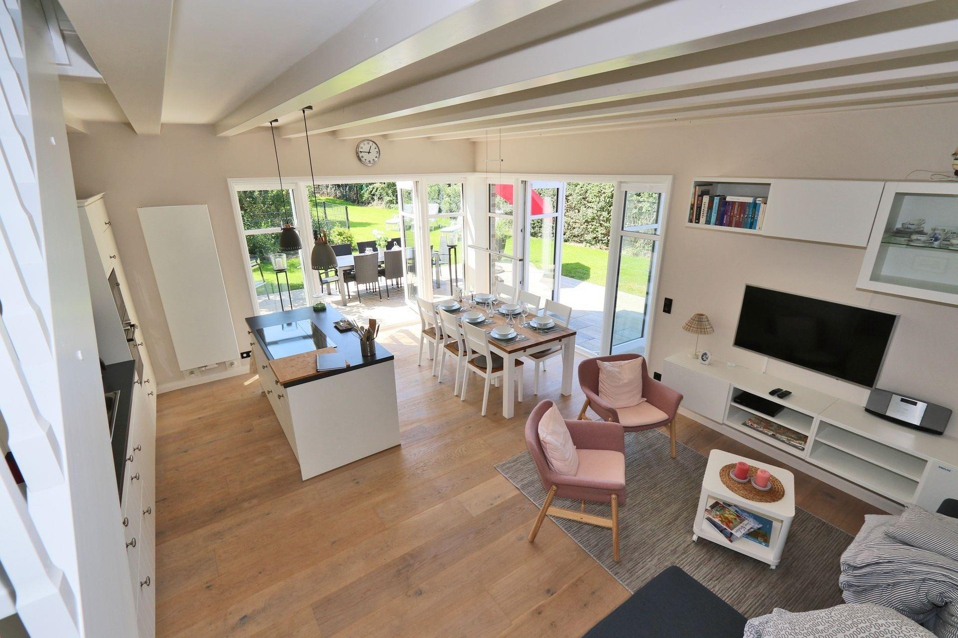 Das Ferienhaus ist ca. 130 qm groß und bietet 4 Schlafzimmer für insgesamt 7 Personen. Zwei helle freundliche Badezimmer mit Duschbereich, im Erdgeschoss barrierearm, sorgen dafür, dass es am Morgen nicht zu Wartezeiten kommt. Im großzügig und gemütlich eingerichteten Wohn-Esszimmer befindet sich die modern eingerichtete Küche, in der Sie alles finden, was für einen gelungenen Urlaub nötig ist. Von hier haben Sie Zugang zur Süd-Westterrasse und Garten mit Liegewiese. Im Erdgeschoss befindet sich ein Schlafzimmer mit Doppelbett und ein Bad. Ein Hauswirtschaftsraum mit Waschmaschine und Trockner sorgt für weiteren Komfort. Die Räumlichkeiten im Erdgeschoss sind barrierearm. Die Türen innerhalb des Erdgeschosses haben ein Durchgangsmaß von 86 cm. Der Zugang für z. B. Rollstuhlfahrer ist über die Eingangstür bei der Terrasse möglich. Das Obergeschoss bietet 2 weitere Schlafzimmer mit Doppelbett, sowie 1 Schlafzimmer mit 2 Einzelbetten. Außerdem das zweite Bad. Dieses Haus ist somit gerade für große Familien gut geeignet. Zwei PKW Stellplätze und ein abschließbares Fahrradhäuschen befinden sich auf dem Grundstück. Zwei Pkw-Stellplätze inkl. Ladestation für ein E-Auto, Elektrogrill für die Terrasse. Fußbodenheizung im Bad. Ein kleiner Hund ist gegen Gebühr willkommen.