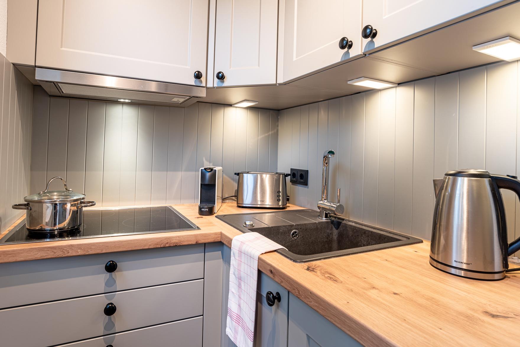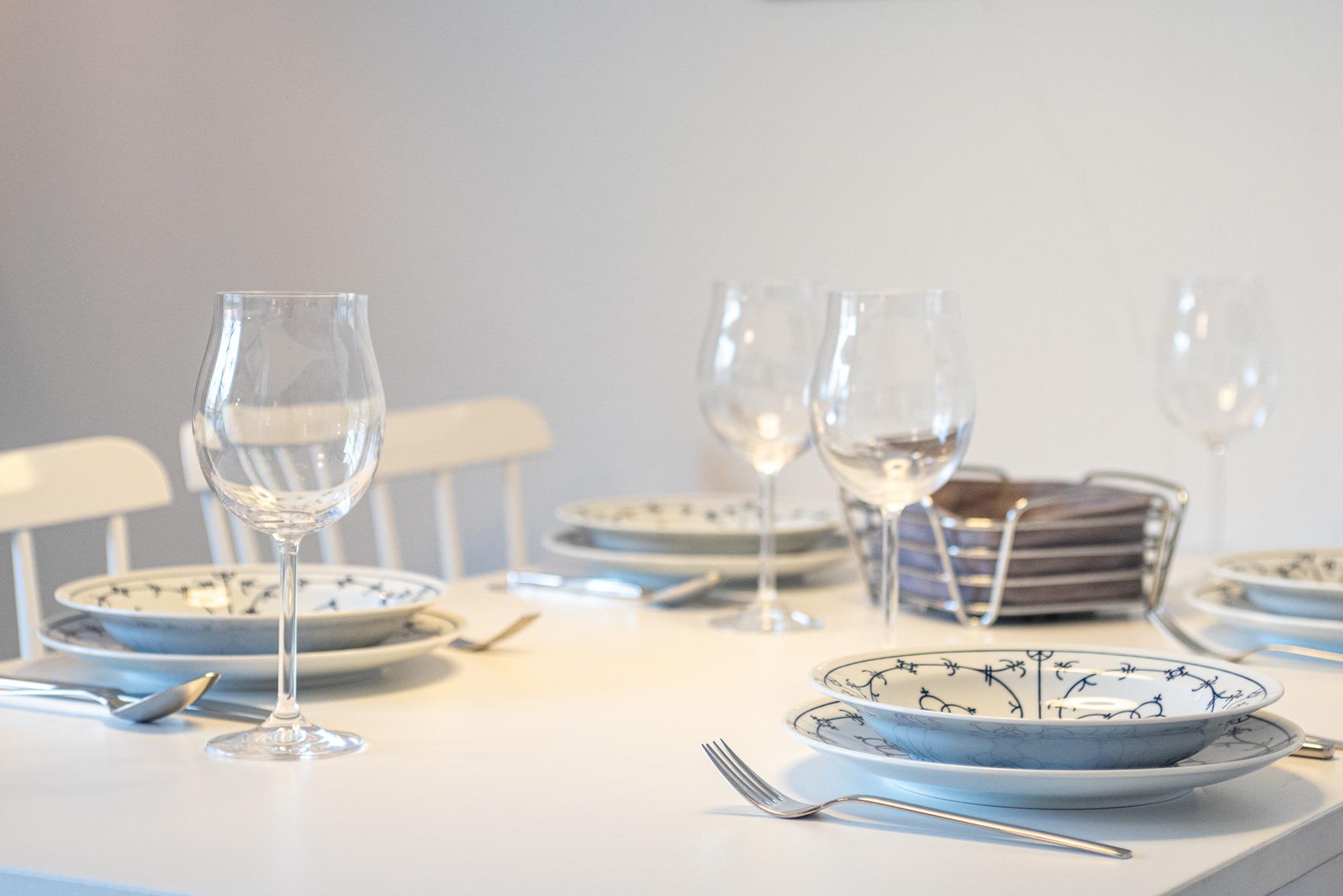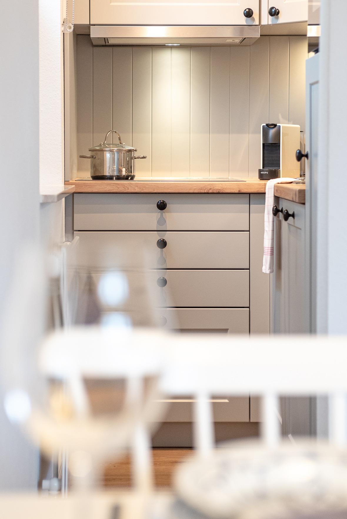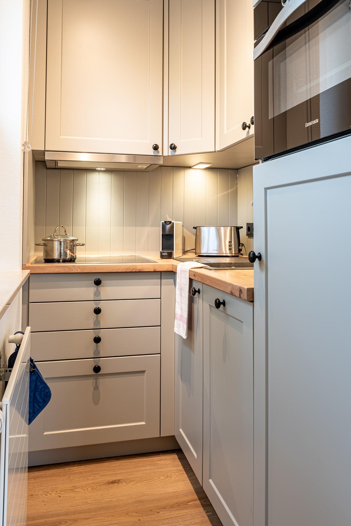Neben dem hellen Wohn- und Essbereich mit großer Couch, einem Sessel und dem Smart TV ist die hochwertige Marken-Einbauküche ein besonderes Highlight dieser geschmackvoll ausgestatteten Wohnung. Die offene Küchenzeile wartet mit allem Komfort auf Sie: hochgebauter Backofen, großer Kühlschrank mit Gefrierfach, besonders leise Spülmaschine.