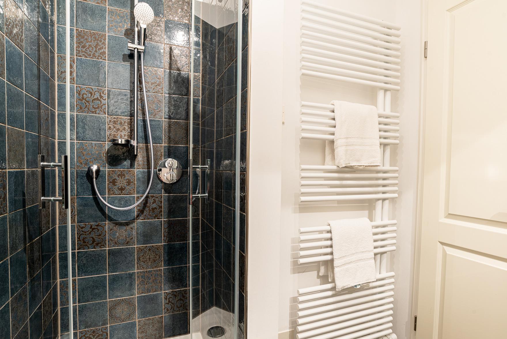 Das luxuriöse Badezimmer erwartet Sie mit geschmackvollen Fliesen aus Naturstein und einem formschönen Waschtisch mit viel Stauraum. Die Fußboden-Heizung und ein Handtuchheizkörper sorgen für wohlige Wärme.