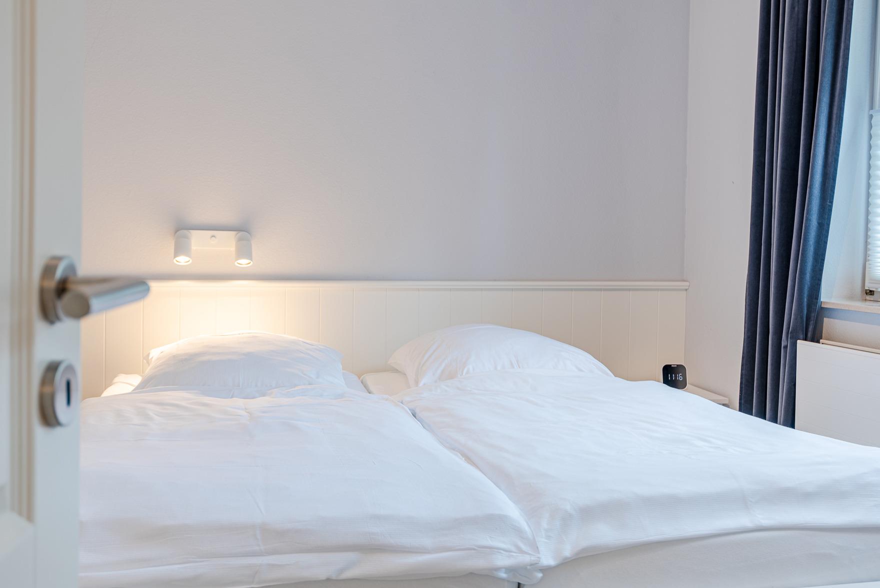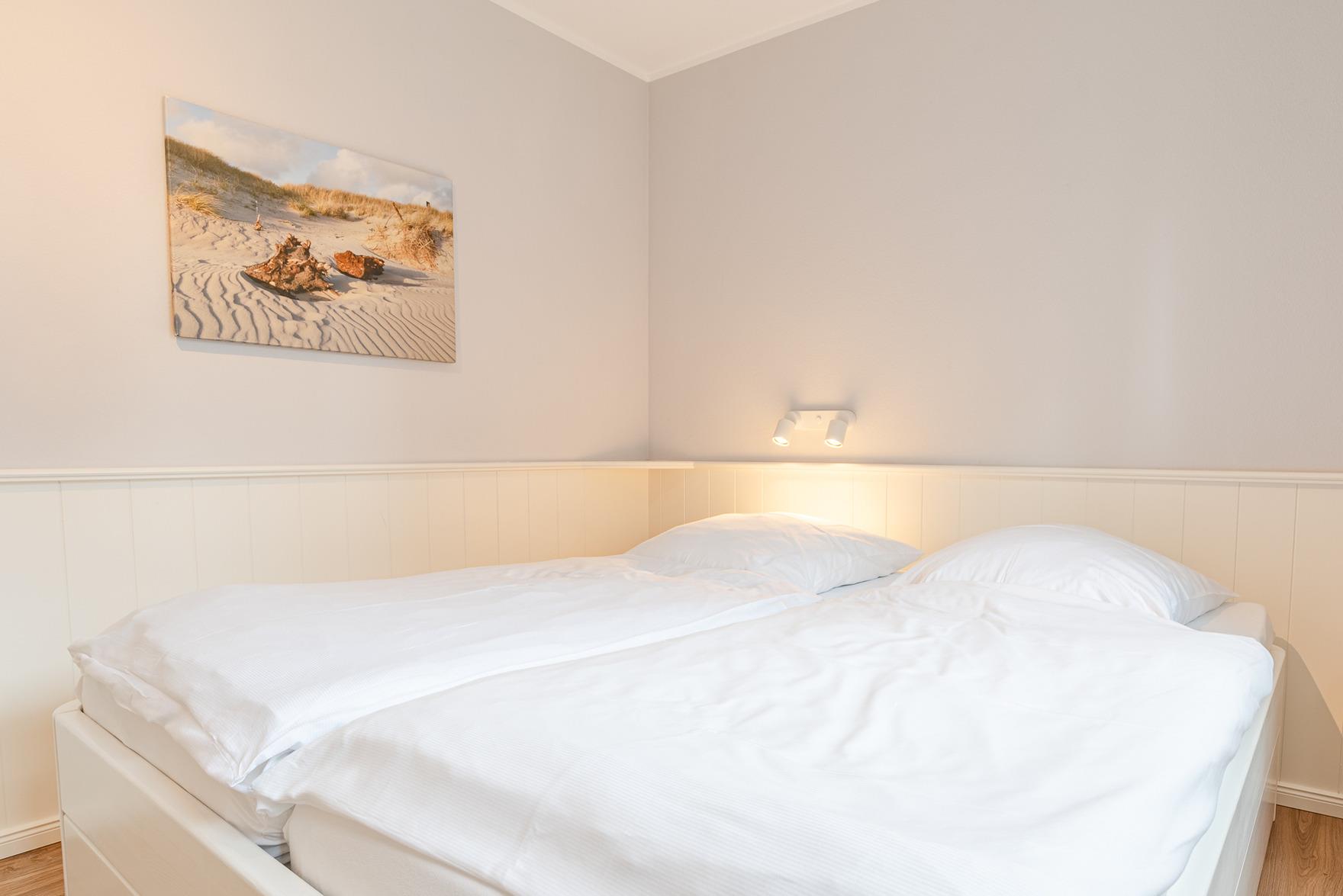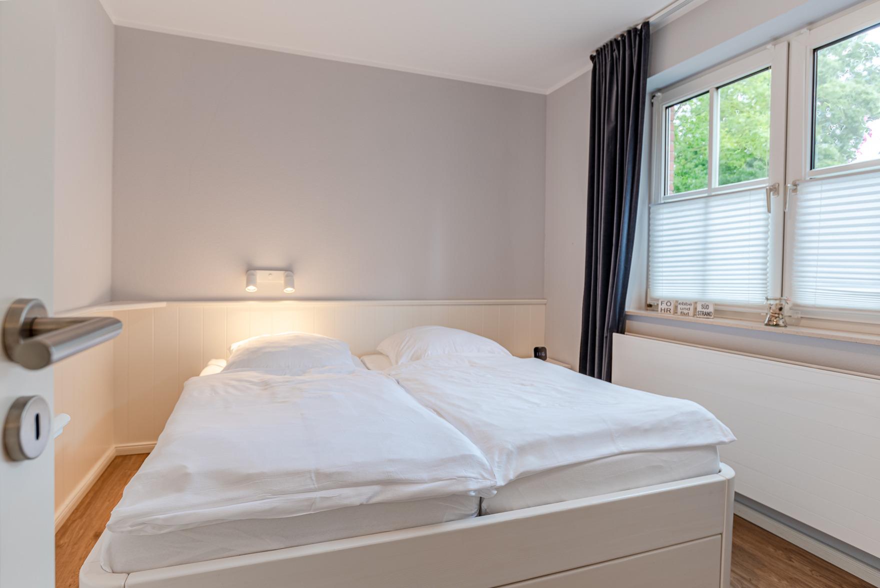 Das Schlafzimmer punktet mit weißen Premium-Massivholzmöbeln. Es ist mit einem Doppelbett (1,80 x 2,00 m) mit hochwertigen Matratzen, Allergikerbezügen, neuen Vierjahreszeiten-Bettdecken und einem geräumigen Kleiderschrank ausgestattet, ebenso wie mit stilvollen Verdunkelungsvorhängen & Plissees.