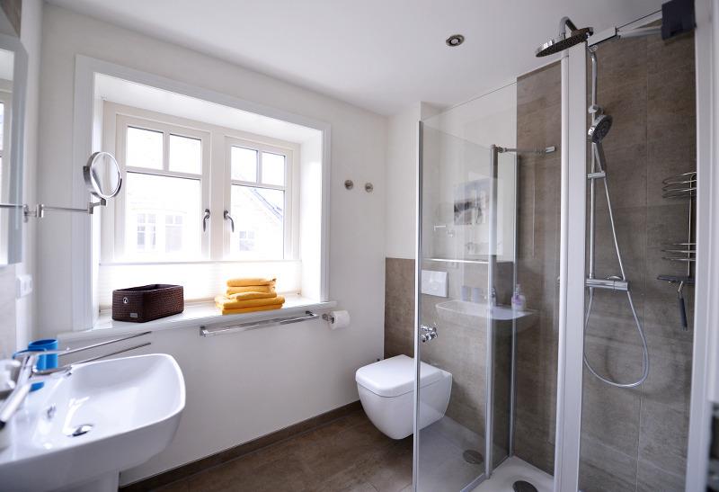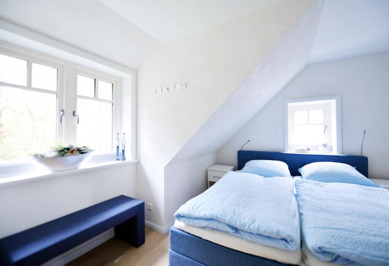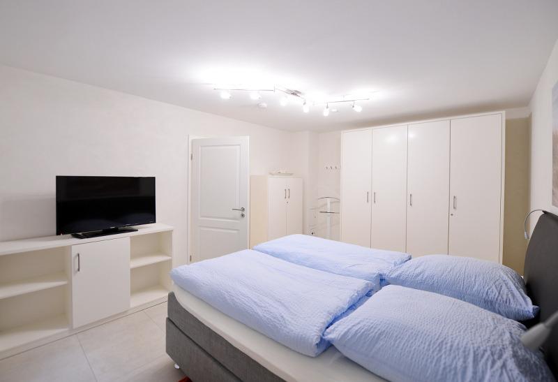 Im Obergeschoss befinden sich zwei Schlafzimmer (zweiter Fernseher im Doppelschlafzimmer) und ein Duschbad mit Toilette, im Kellergeschoss ist neben der Sauna und dem geräumigen Schlafzimmer mit Doppelbett und großem Flachbildfernseher eine weitere Dusche und ein Waschbecken. Im Erdgeschoss ist die[nbsp]Gästetoilette.