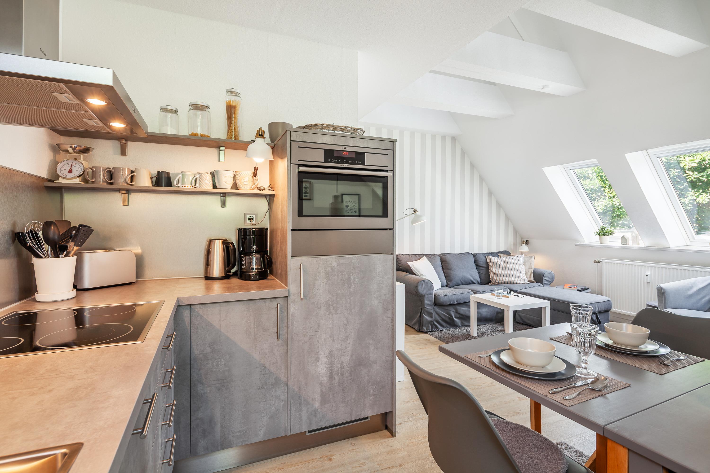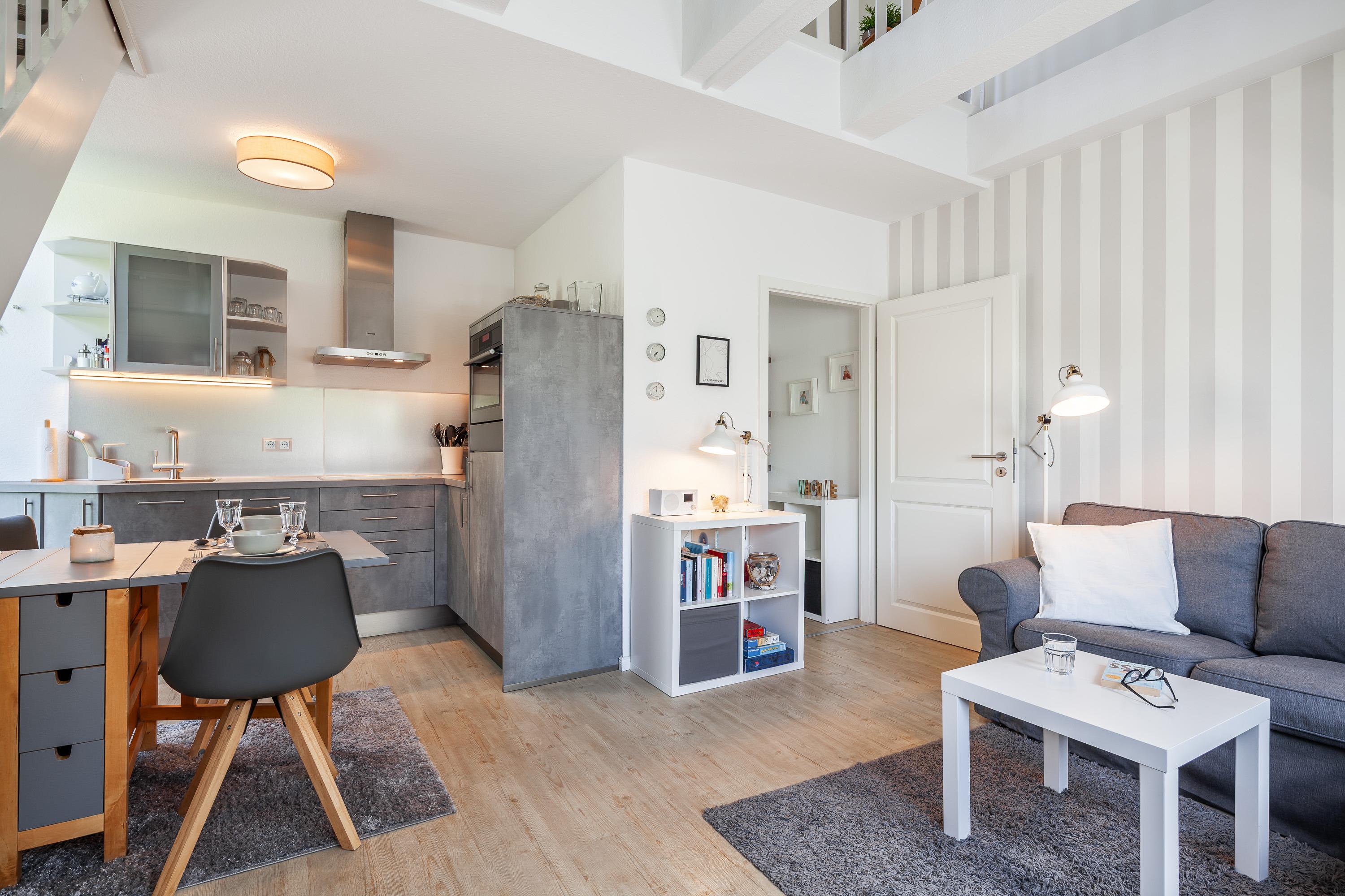 Der freundliche Wohnraum mit einer modernen Sitzgruppe (Sat-TV, DVD-Player, CD-Stereoanlage, Telefon und Internetanschluss ) und einem Esstisch macht den Aufenthalt noch angenehmer. Eine schicke Küchenecke in Betonoptik mit E-Herd, Backofen, Kühlschrank sowie Geschirrspülmaschine lässt keine Wünsche offen.