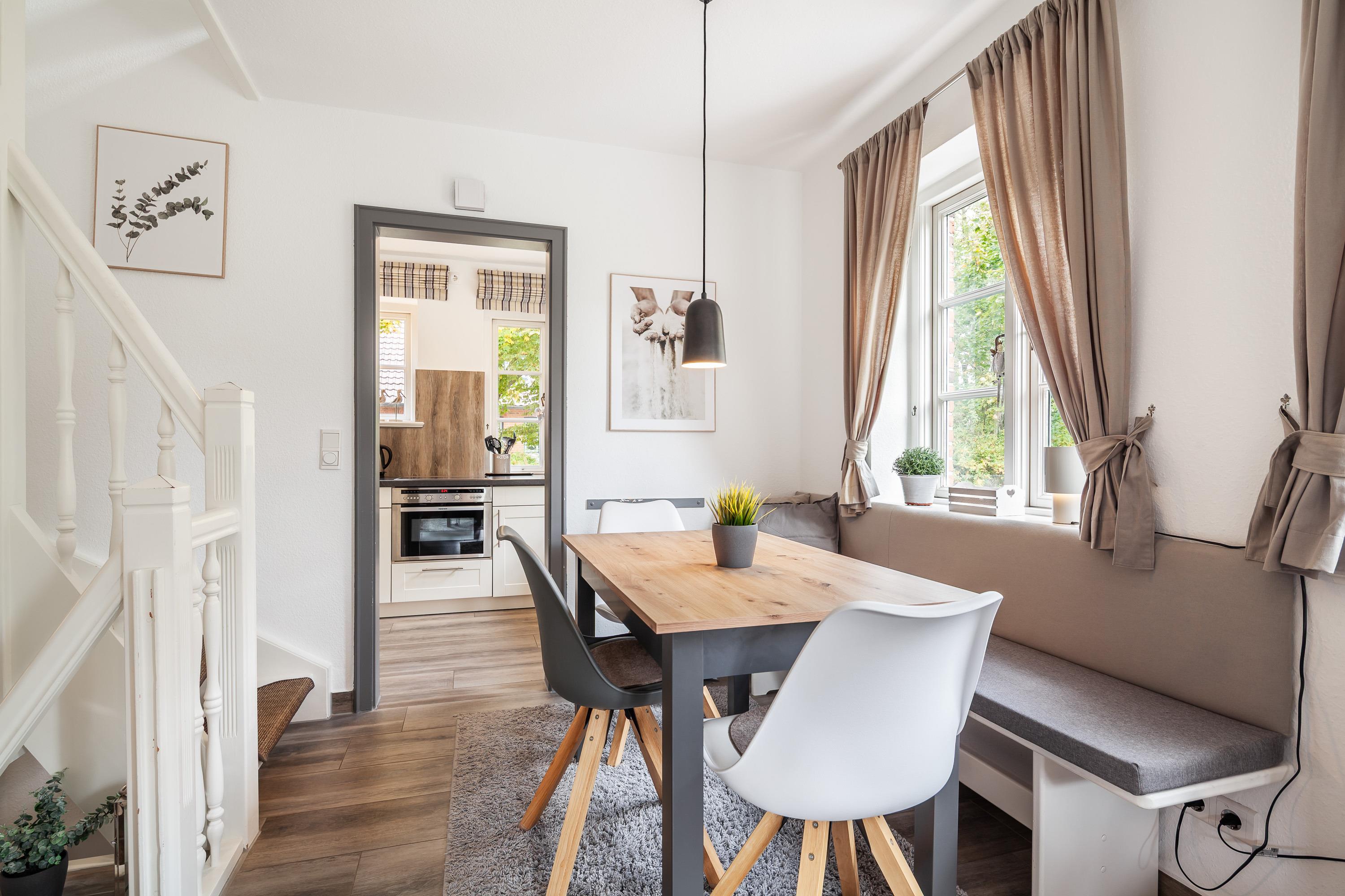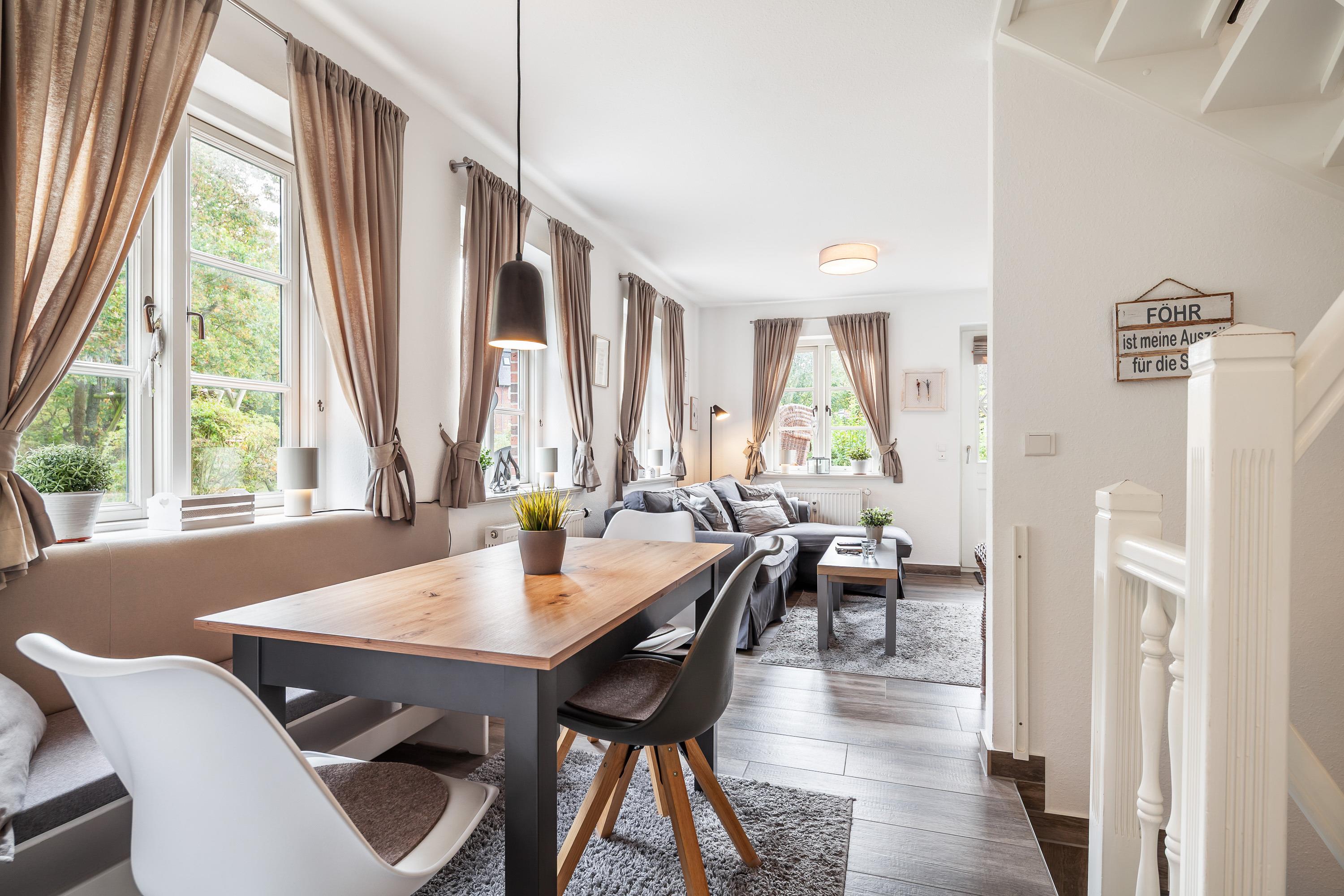 Der lichtdurchflutete Wohnraum mit einer gemütlichen Sitzgruppe und einem Esstisch lädt zum Verweilen ein.