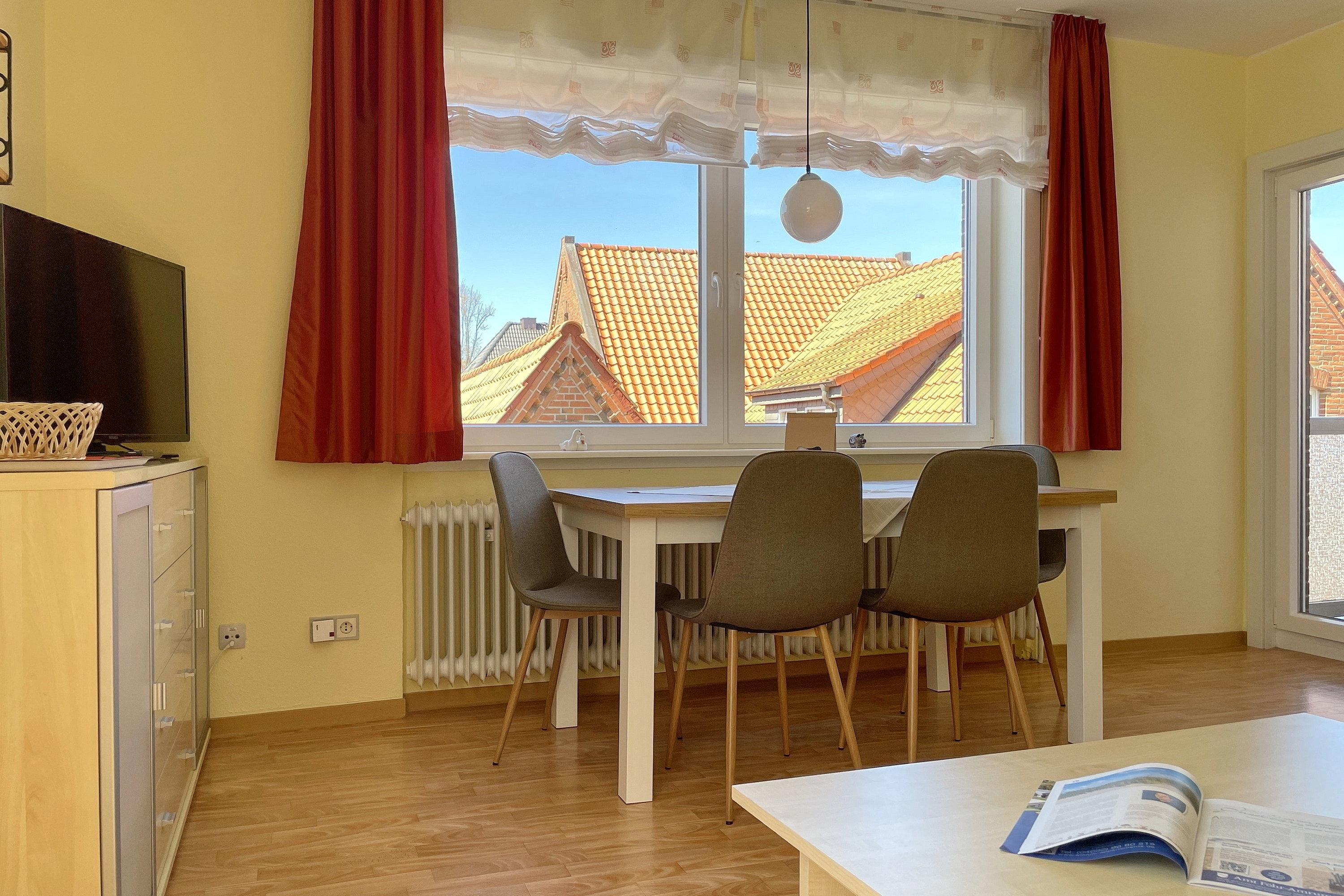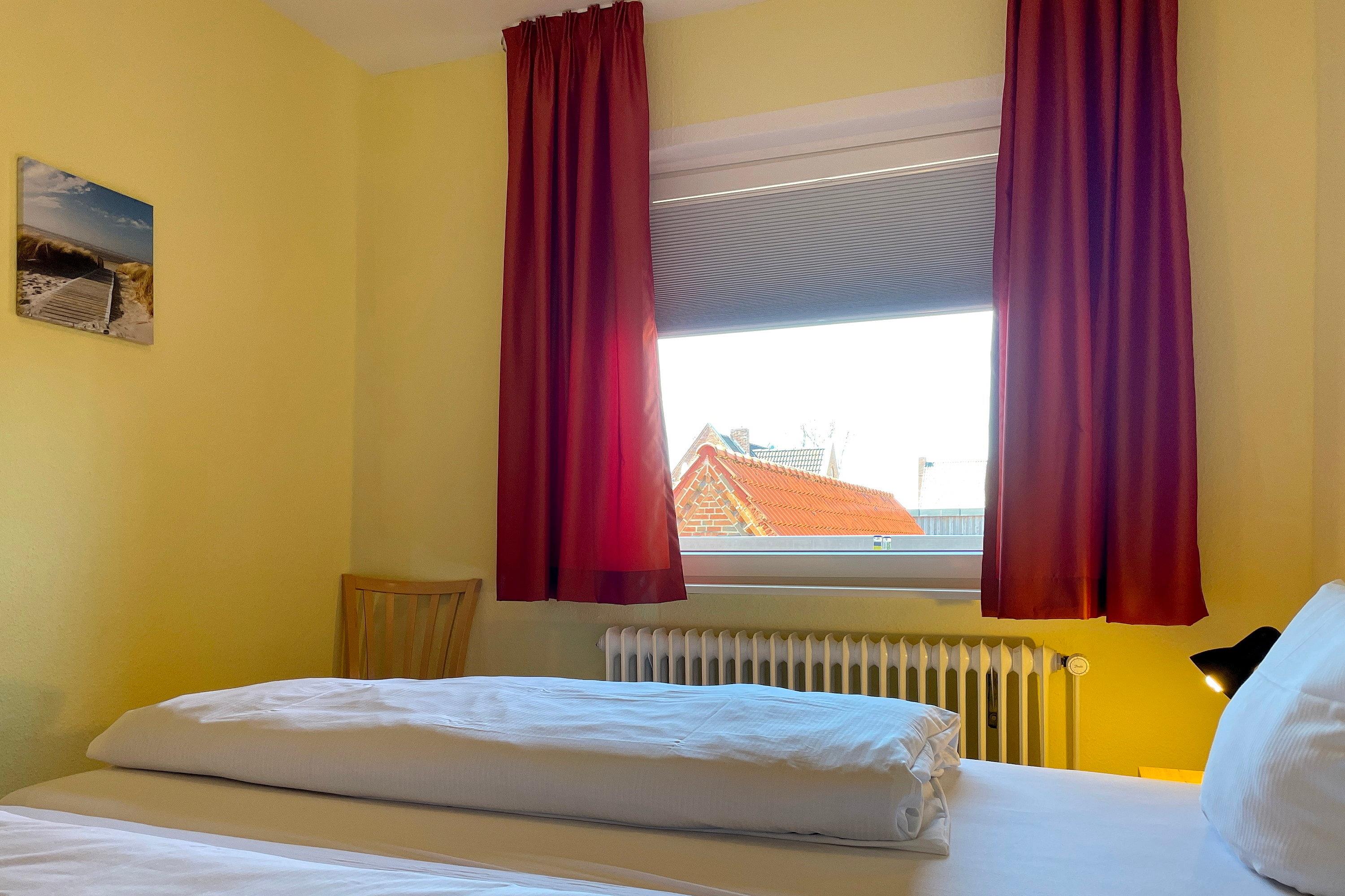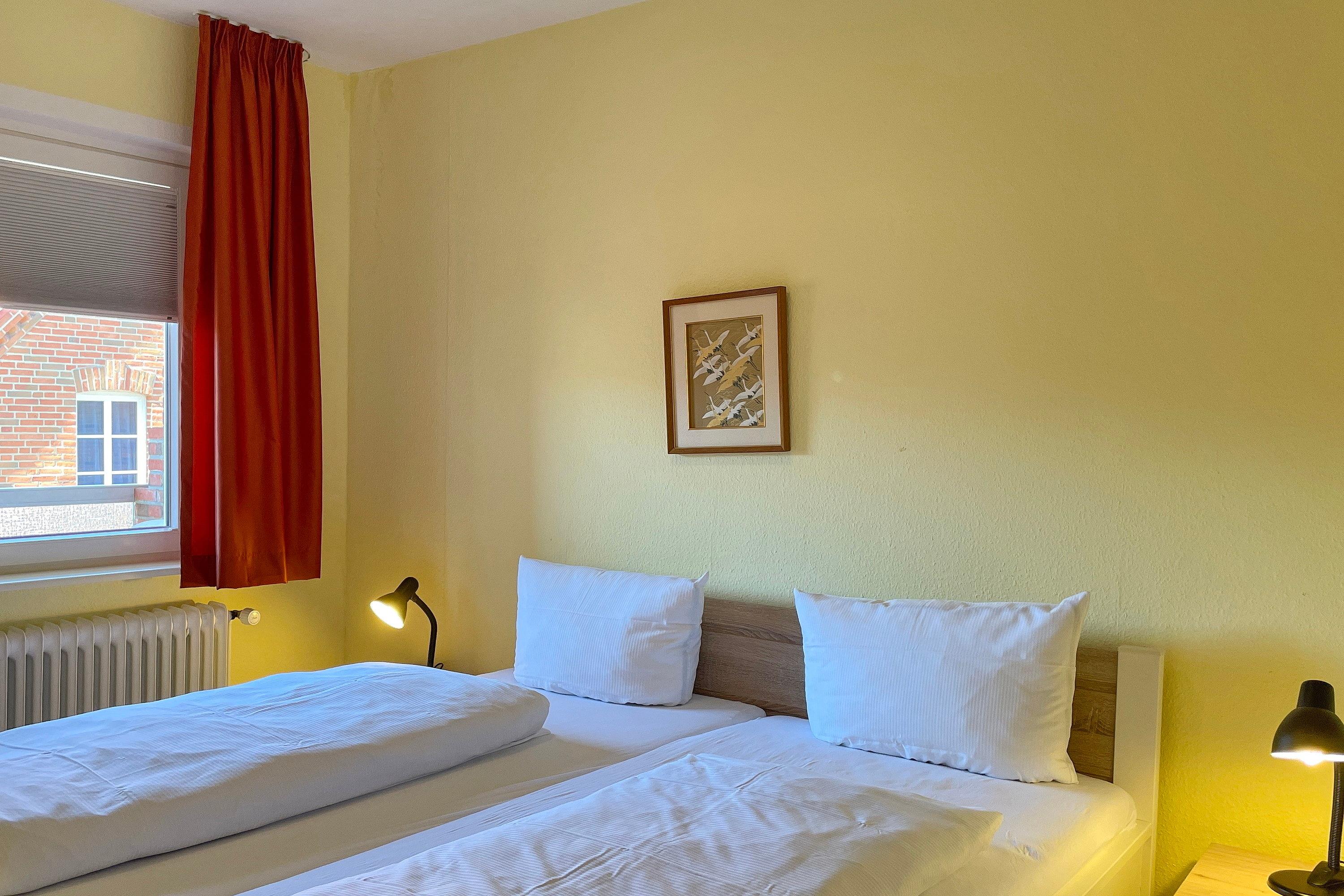 Im ersten Obergeschoß liegt die Altstadtwohnung 1 und ist mit zwei Schlafzimmern ideal geeignet für kleine Familien. So haben Kinder im Schlafzimmer mit zwei Einzelbetten ihr eigenes Reich, während Eltern im Schlafzimmer mit Doppelbett ausschlafen könnten. Das Bad ist mit einer Dusche ausgestattet. Das freundlich eingerichtete Wohnzimmer ist hell und geräumig, genießen Sie hier Zeit mit der ganzen Familie zusammen. Die integrierte Küchenzeile ist gut ausgestattet, so dass Sie sich wunderbar zu Hause versorgen möchte, wenn Sie nicht mal eben hinaus vor die Tür möchten, wo sich eine Vielzahl an Cafés und Restaurants befindet. Weiterhin gehört zu der Wohnung ein Südwestbalkon mit einem malerischen Blick auf die Wyker Altstadt..