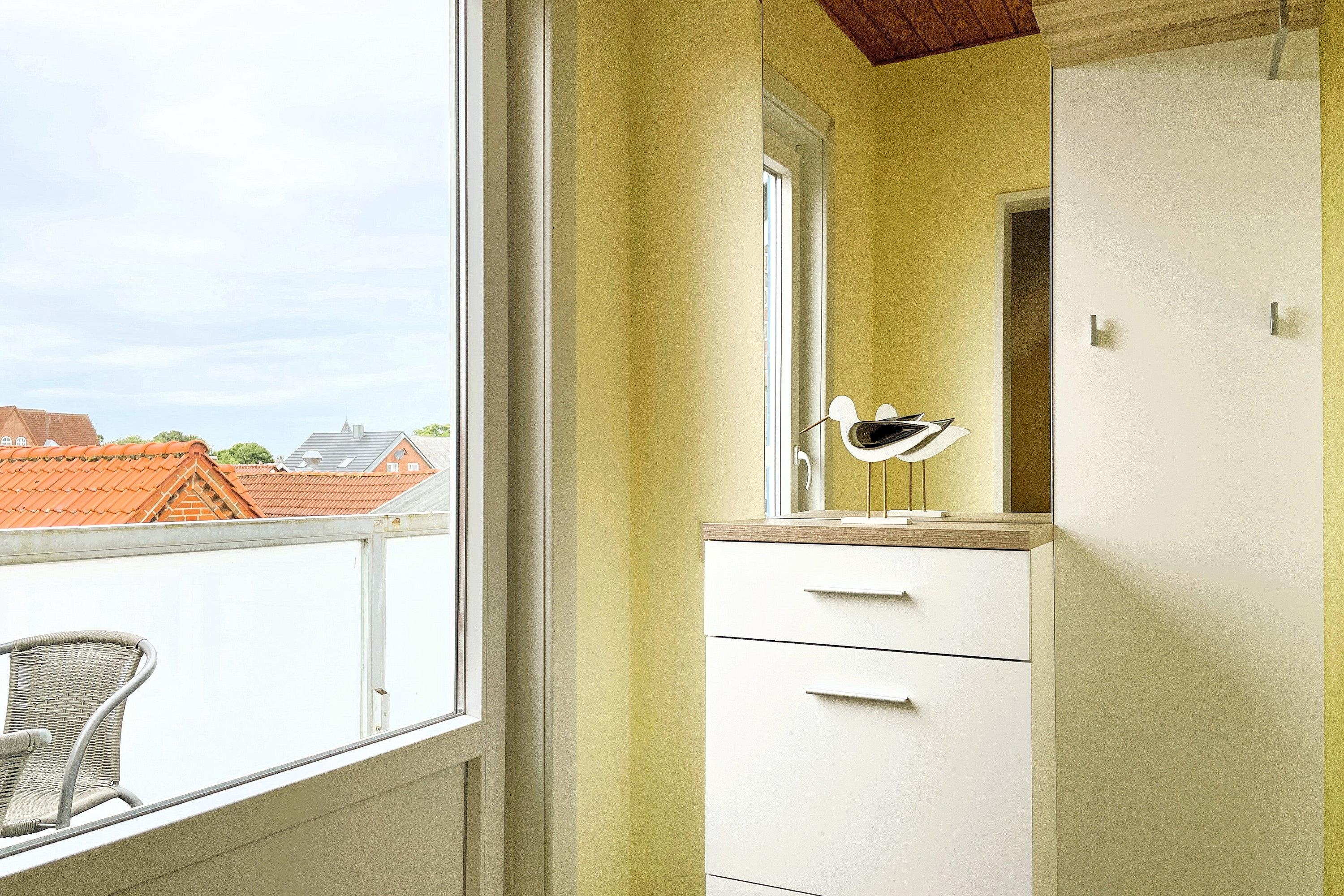 Im zweiten Obergeschoss befindet sich unsere hübsch eingerichtete Altastadtwohnung 4 auf 50 qm. Hier erwartet Sie ein gemütliches Domizil mit einem Wohnzimmer, welches über einen Flachbild-TV, WLAN, eine gemütliche Sitzgruppe und eine gut ausgestattete Küchenzeile verfügt und dabei hell und geräumig ist. Das Bad mit Dusche ist funktional und im separaten Schlafzimmer mit Doppelbett erleben Sie herrliche Träume. Von der Wohnung aus betreten Sie den Balkon, der zur Zeit noch gemeinschaftlich mit der Wohnung 5 genutzt wird. (Ein Sichtschutz ist für die Sommersaison 2021 in Planung). Von hier aus blicken Sie über die Dächer der Wyker Altstadt. Die Wohnung eignet sich ideal für 2 Personen, die gerne mitten im Geschehen Ihren Urlaub verbringen möchten und den Strand fußläufig in wenigen Minuten erreichen möchten.