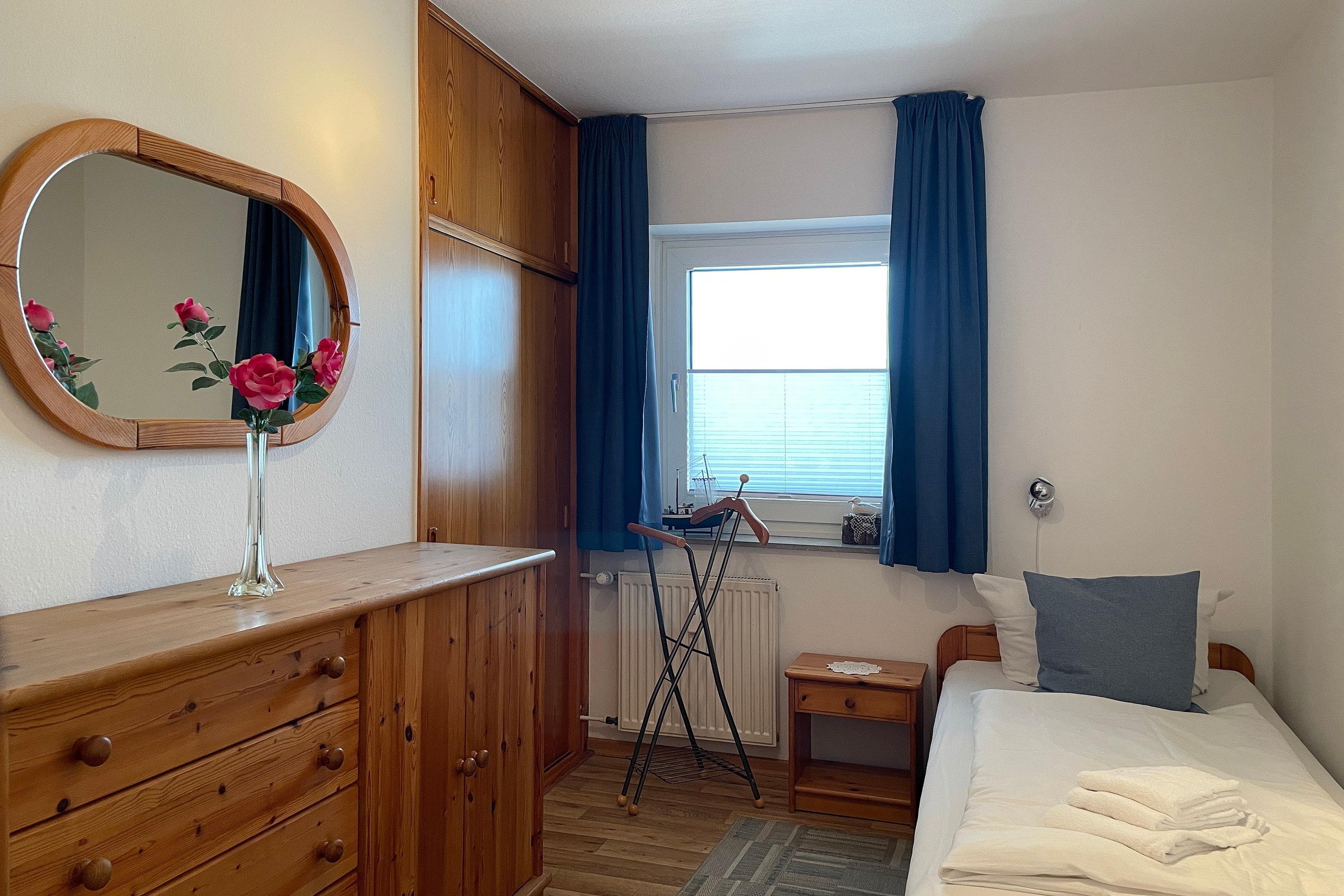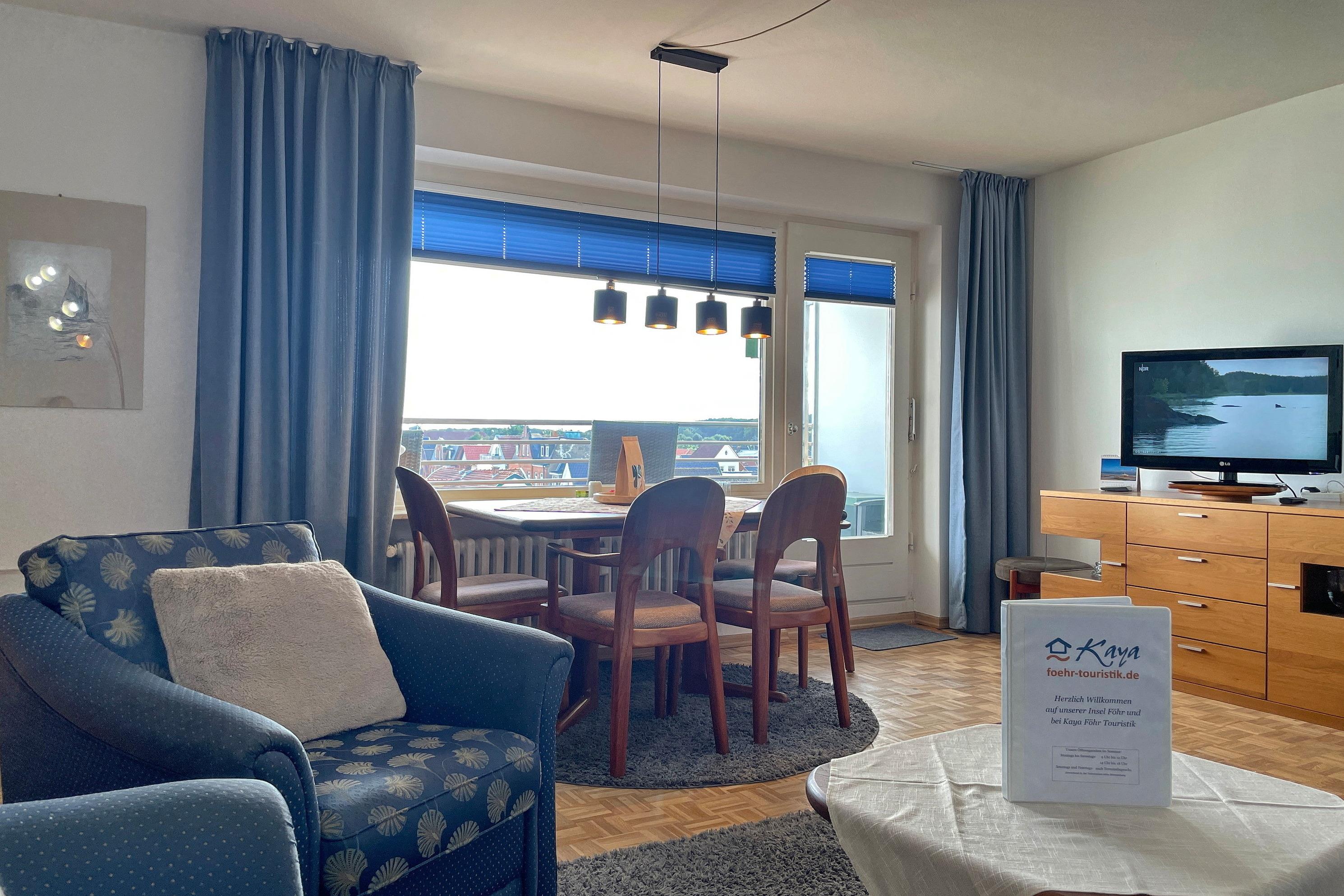 Warme Holzmöbel und eine bequeme Sitzgarnitur im Wohnbereich mit WLAN geben der Wohnung einen einladenden Charakter. Im Wohnzimmer befindet sich weiterhin eine gemütliche Essecke, die direkt am großen Fenster steht und ein Schrankbett (90 x 190 cm), welches eine weitere Schlafmöglichkeit für 1 Person anbietet. Von hier gelangen Sie auch auf den Südbalkon und können die Föhrer Nordseeluft atmen, den Möwen beim Fliegen zuschauen und das Meeresrauschen erleben. Das Schlafzimmer mit zwei Einzelbetten (90 x 200 cm) und Einbauschrank sorgt für eine angenehme Nachtruhe. Das kleine Bad mit Dusche ist hell und funktional und in der modern gestalteten separaten Küche mit Backofen, Ceranfeld und Geschirrspüler lassen sich kleine Gerichte wunderbar zubereiten, wenn Sie nicht in eines der vielen Cafés und leckeren Restaurants speisen möchten, die Sie überall in der Innenstadt finden werden. Kaum gehen Sie aus dem Haus haben Sie sämtliche Einkaufsmöglichkeiten, Cafés und Restaurants sowie natürlich Strand und Meer in unmittelbarer Nähe. Dem Haus stehen insgesamt 15 PKW-Stellplätze zur Verfügung, von denen Sie gerne einen Nutzen können falls er frei ist. Ansonsten ist fußläufig der große Inselparkplatz erreichbar. Genießen Sie den Erholungswert dieser Wohnung und schalten Sie vom Alltag ab. Erleben Sie entspannte Tage ohne Hektik sondern lassen Sie sich den Nordseewind ins Gesicht wehen und spüren Sie den feinen Sand des Strandes unter Ihren Füßen.