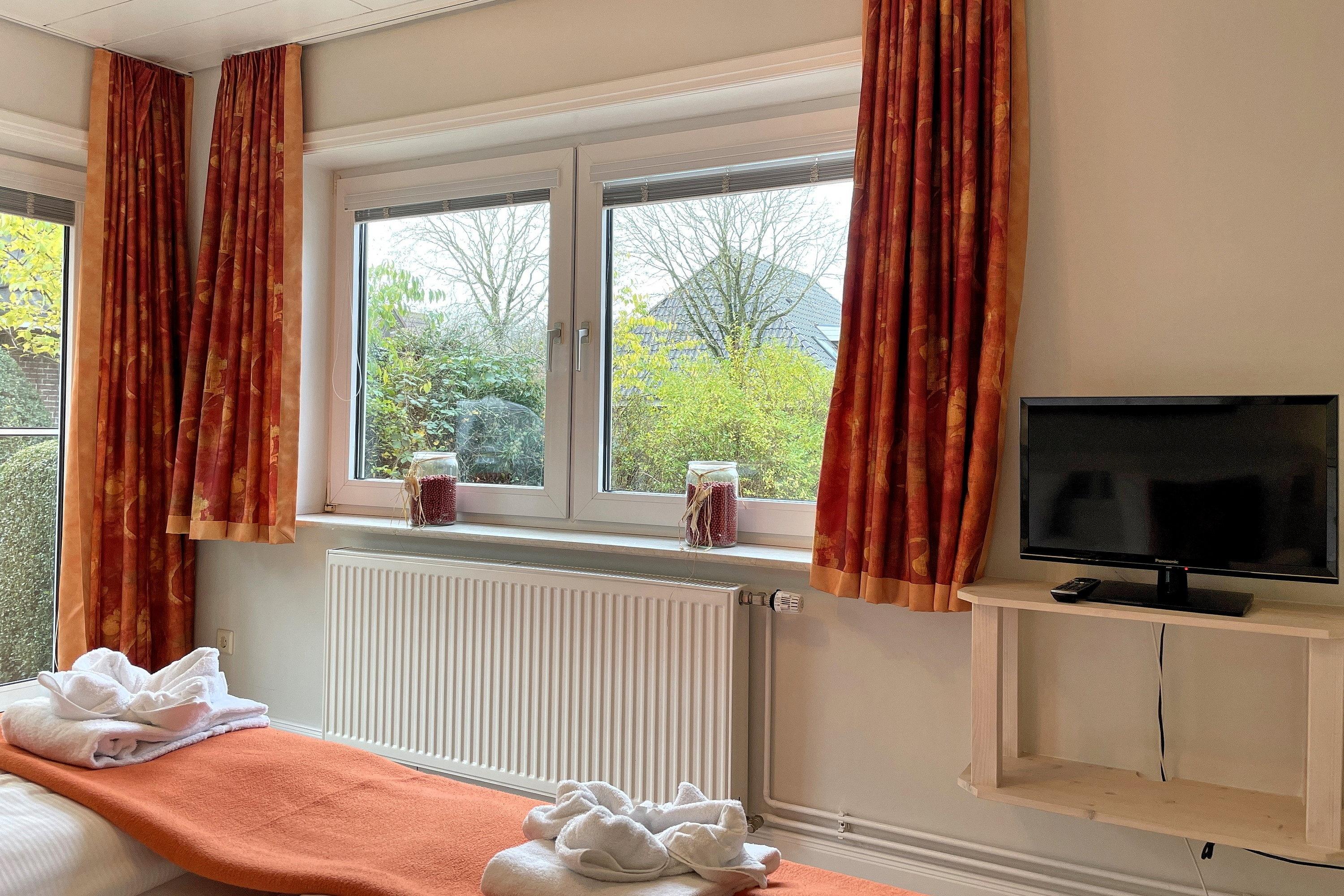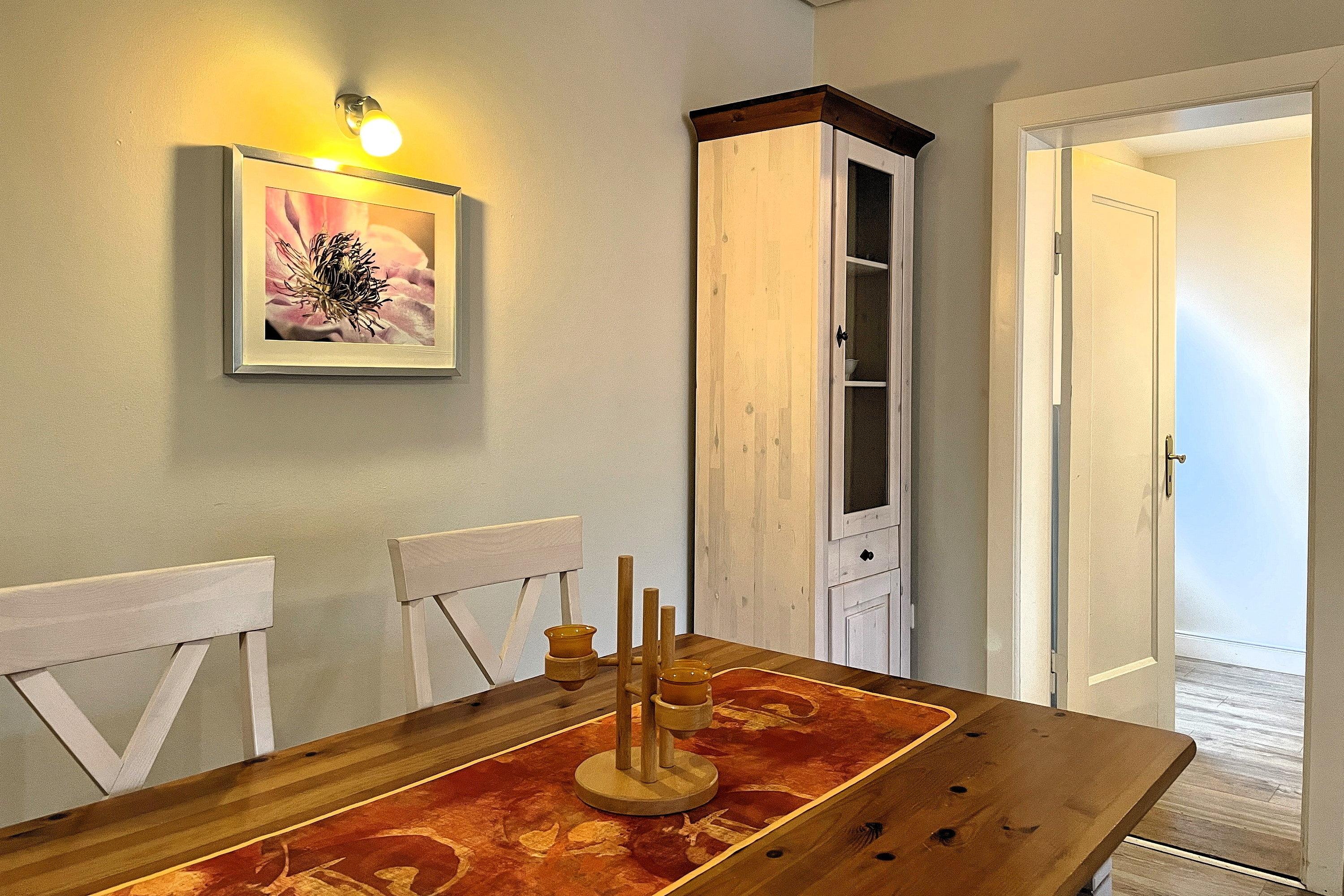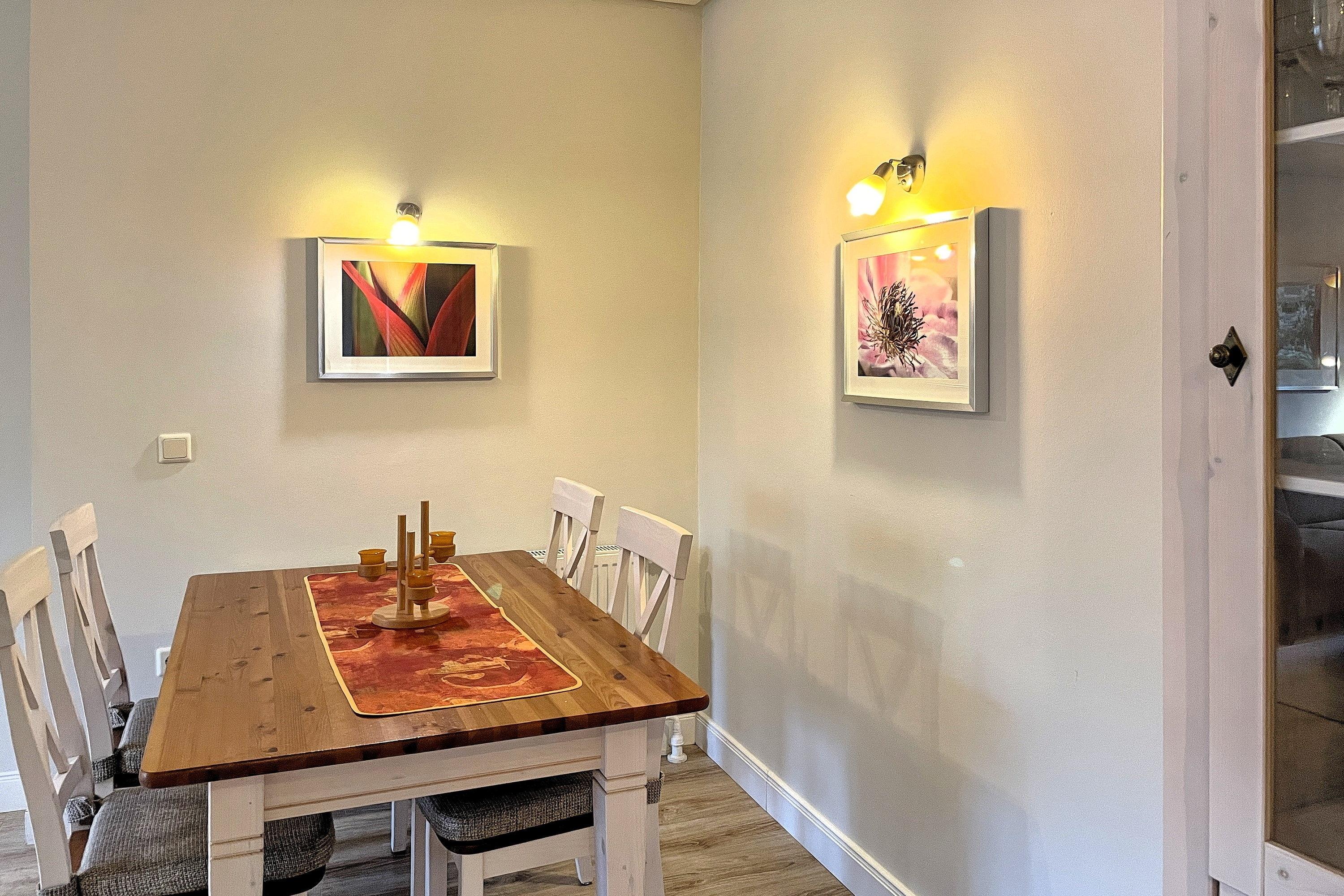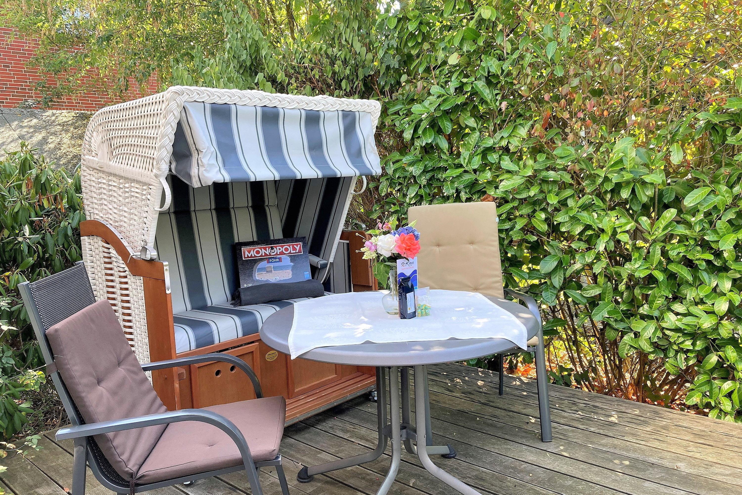 Das Haus Brossolat liegt zentral im Rebbelstieg unweit des bekannten Friesenmuseums. Das gepflegte Grundstück ist mit wunderschönen Blumen bewachsen und bietet Ihnen drei Wohnungen namens Brossolat EG, Brossolat EG2 und Brossolat OG jeweils mit separaten Eingängen. Die Wyker Innenstadt und der Stadtwald mit dem beliebten Abenteuerspielplatz sind nur wenige Gehminuten entfernt. Die nach hinten gelegene Erdgeschosswohnung Brossolat EG 2 liegt ruhig und eingebettet in dem gepflegten Garten des Hauses Brossolat. Durch einen separaten Eingang gelangen Sie in einen hellen und freundlichen Vorflur. Der Wohnbereich ist unterteilt in eine gemütliche Sitzecke mit Flachbild-TV, WLAN und großer Fensterfront sowie dem geräumigen Essplatz im nordischen Stil. Das großzügige Schlafzimmer mit einem zweiten Fernseher verfügt über einen eigenen Ankleideraum. Von hier gelangen Sie ebenfalls auf den Terrassenplatz mit Gartenmöbeln, der zum friedlichen Verweilen einlädt. In der voll Ausgestatten Küche mit Backofen, Ceranfeld, Mikrowelle und guter Ausstattung finden Sie eine weitere kleine Essmöglichkeit vor. Das helle Badezimmer mit Badewanne und Fenster ist im maritimen Stil gehalten. Die Wohnung Brossolat EG 2 ist ein Domizil, in welchem Sie sich schnell wohlfühlen und Ihre Urlaubstage genießen können. Liebevolle Details und warme orange-rötliche Farben geben dieser Wohnung einen ganz individuellen und luxuriösen Glanz.