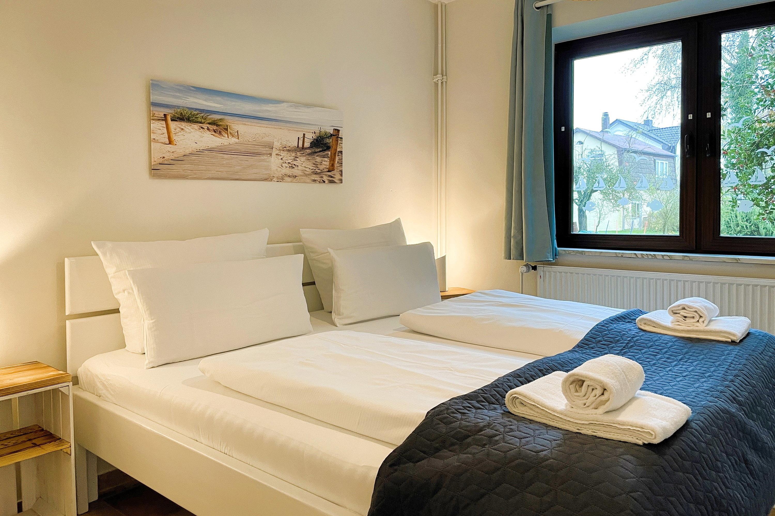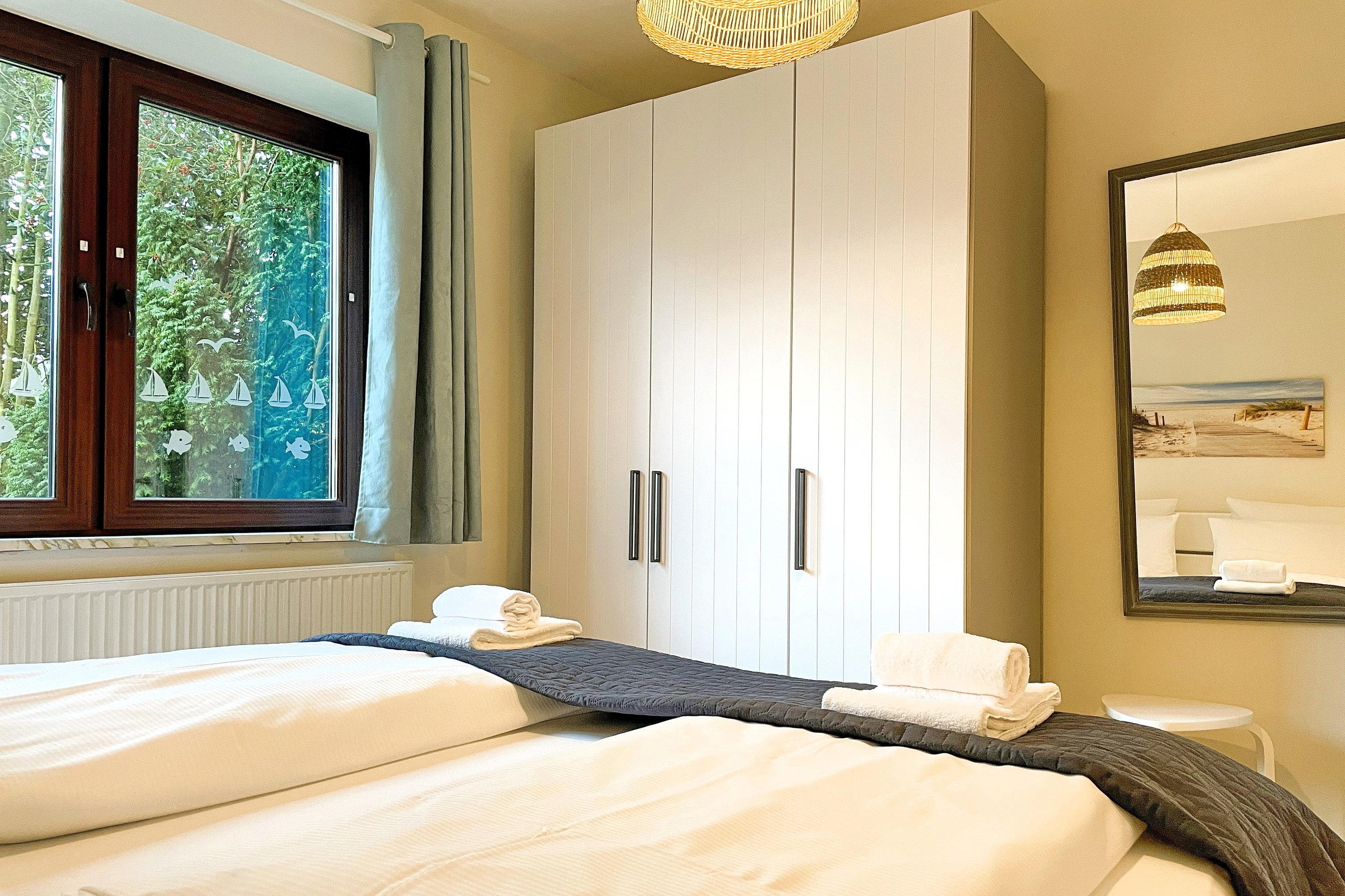 Das Hauptschlafzimmer ist mit einem Doppelbett ausgestattet, während das zweite Schlafzimmer ein Einzelbett sowie ein Etagenbett in Erwachsenengröße bietet. Das Badezimmer ist mit einem Vollbad, WC und zwei Waschplätzen ausgestattet und sorgt für zusätzlichen Komfort. Genießen Sie Ihren Aufenthalt in unserer komfortablen Ferienwohnung und erleben Sie Entspannung pur! Buchen Sie jetzt und sichern Sie sich Ihren perfekten Urlaub!