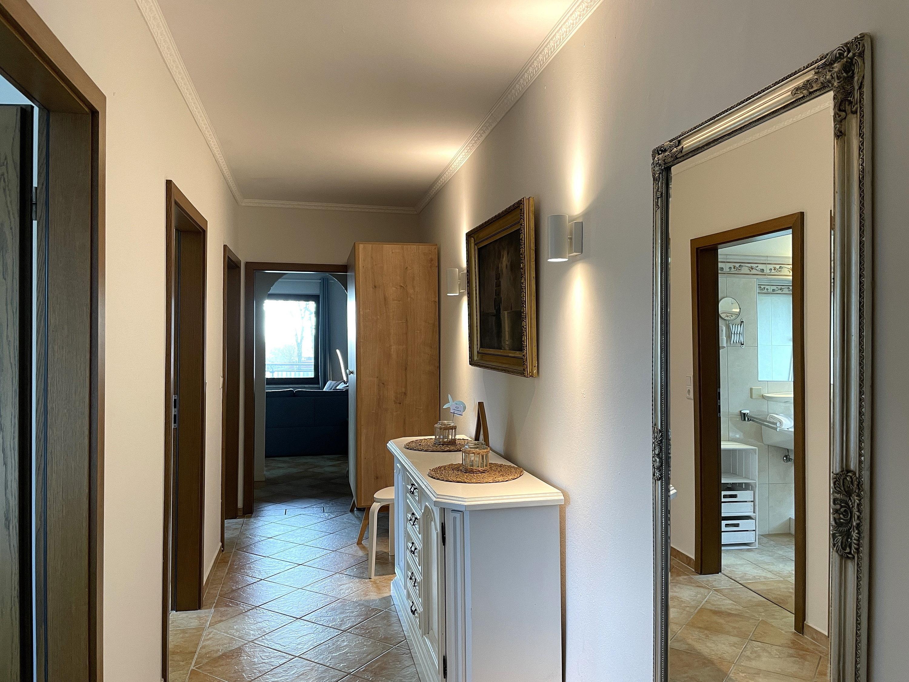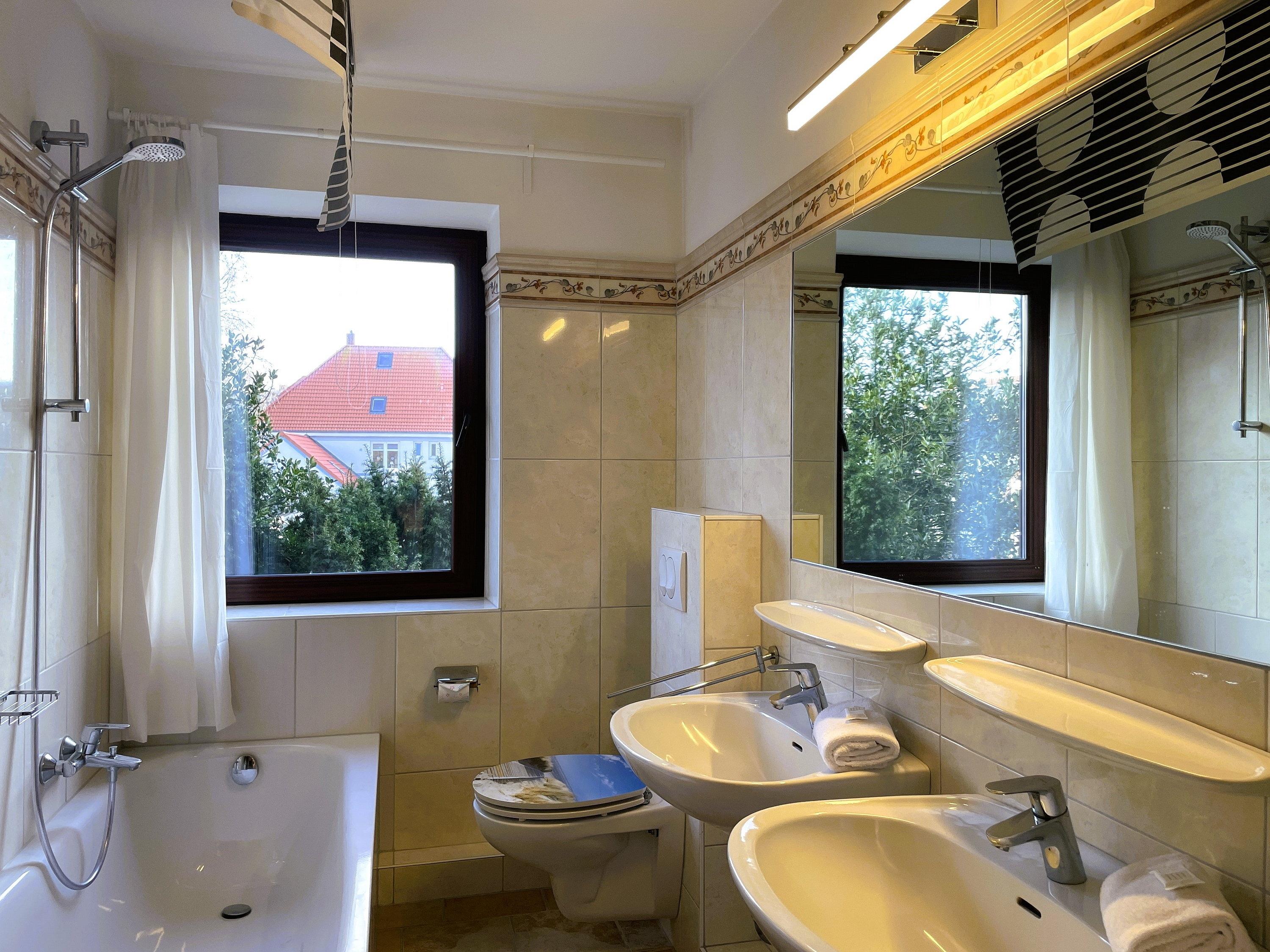 Das Herzstück der Wohnung ist das helle Wohnzimmer mit seiner voll ausgestatteten Küchenzeile. Hier können Sie gemeinsam kochen, essen und entspannen. Der Südbalkon lädt zum Verweilen ein und bietet einen wunderbaren Ausblick, besonders schön in den Abendstunden. Über einen zentralen Flur erreichen Sie die beiden Schlafzimmer: eines mit einem bequemen Doppelbett, das andere mit einem Einzel- und einem Etagenbett - alle in Erwachsenengröße. Das geräumige Badezimmer mit Vollbad, WC und zwei Waschplätzen komplettiert den Wohnkomfort. Unsere Ferienwohnung ist rauchfrei und tierfreundlich. Sie bietet kostenloses WLAN, Heizung und einen Privatparkplatz. Erleben Sie einen unvergesslichen Urlaub in unserer Ferienwohnung 5 - Ihr Zuhause fern von Zuhause!