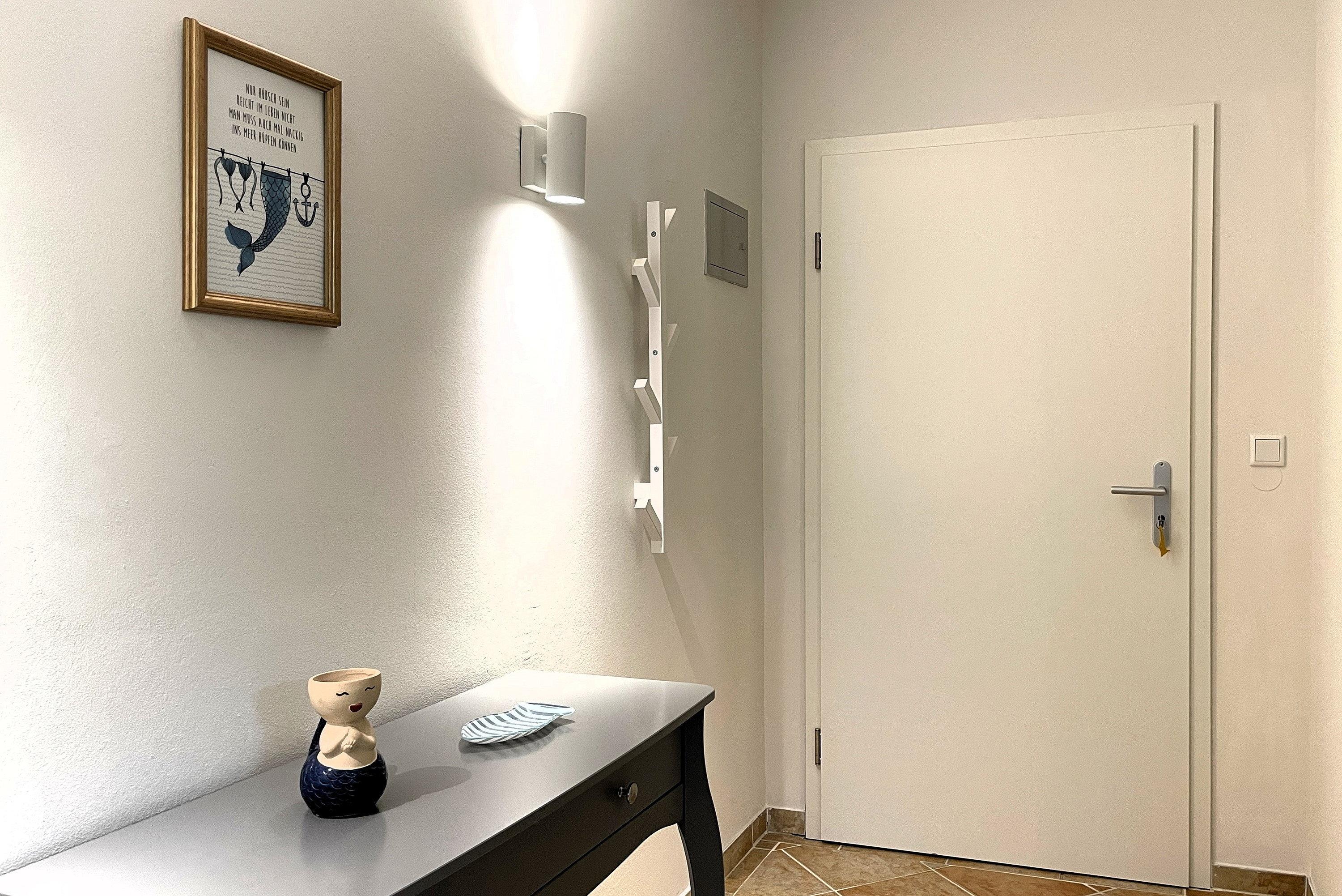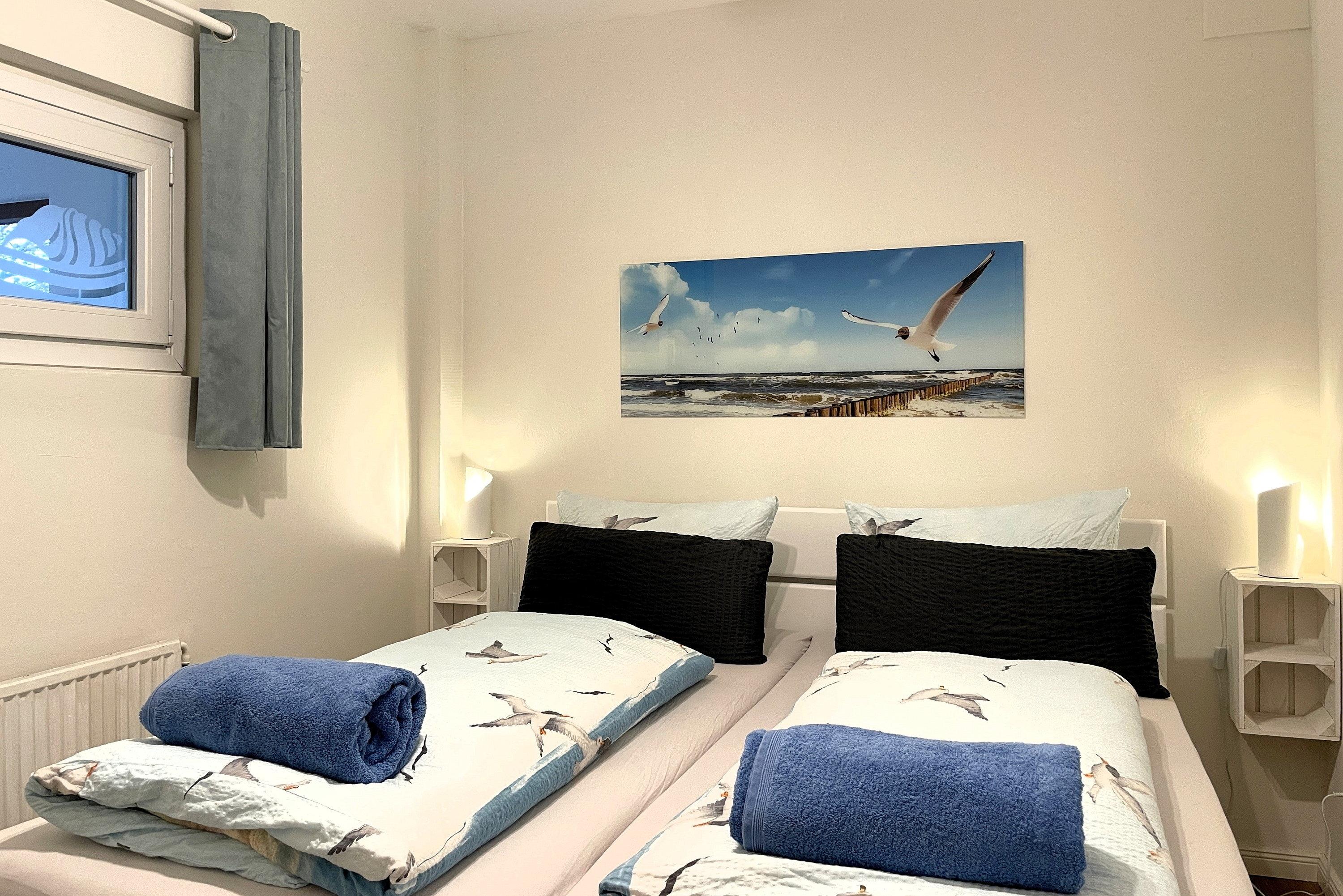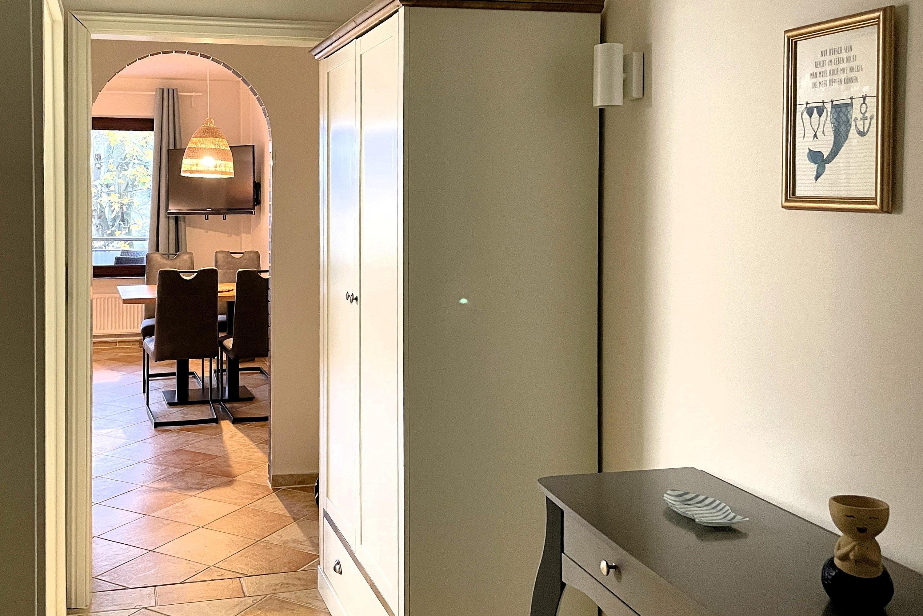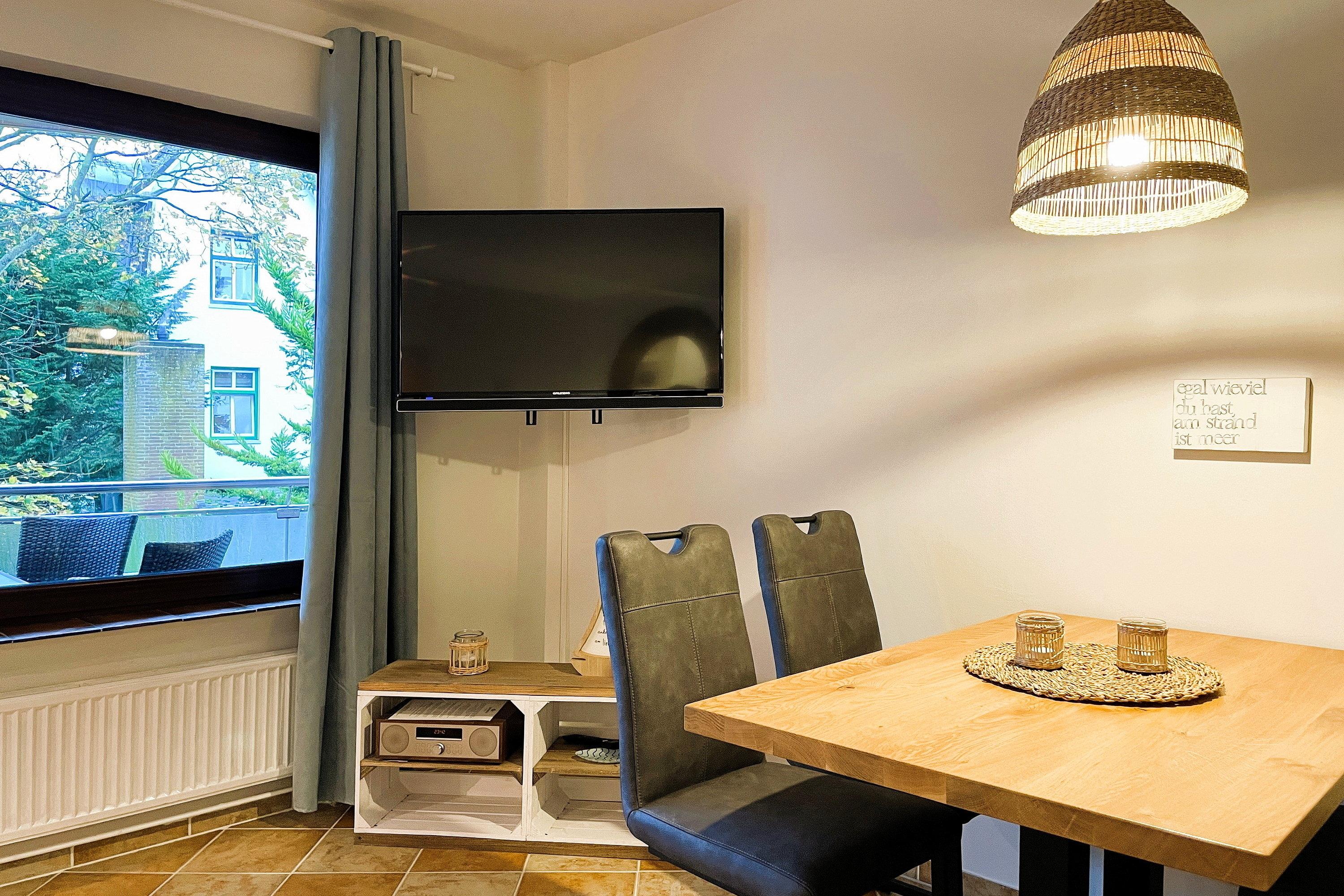 Das helle Wohnzimmer mit WLAN, Radio und TV mit angrenzender, gut ausgestatteter Küche lädt zum Verweilen ein. Von hier aus gelangen Sie auf den sonnigen Südbalkon - ideal für entspannte Momente im Freien. Das separate Schlafzimmer mit Doppelbett hat einen maritimen Flair und eine Lampe mit Ventilator. Das Fenster ist zum Flur ausgerichtet. Das Badezimmer ist funktional mit Wanne, WC und Lüftung ausgestattet. Familien mit Kindern und Haustierbesitzer sind in dieser rauchfreien Ferienwohnung herzlich willkommen. Die zentrale Lage auf Föhr ermöglicht Ihnen, die Schönheit der Insel mühelos zu erkunden.