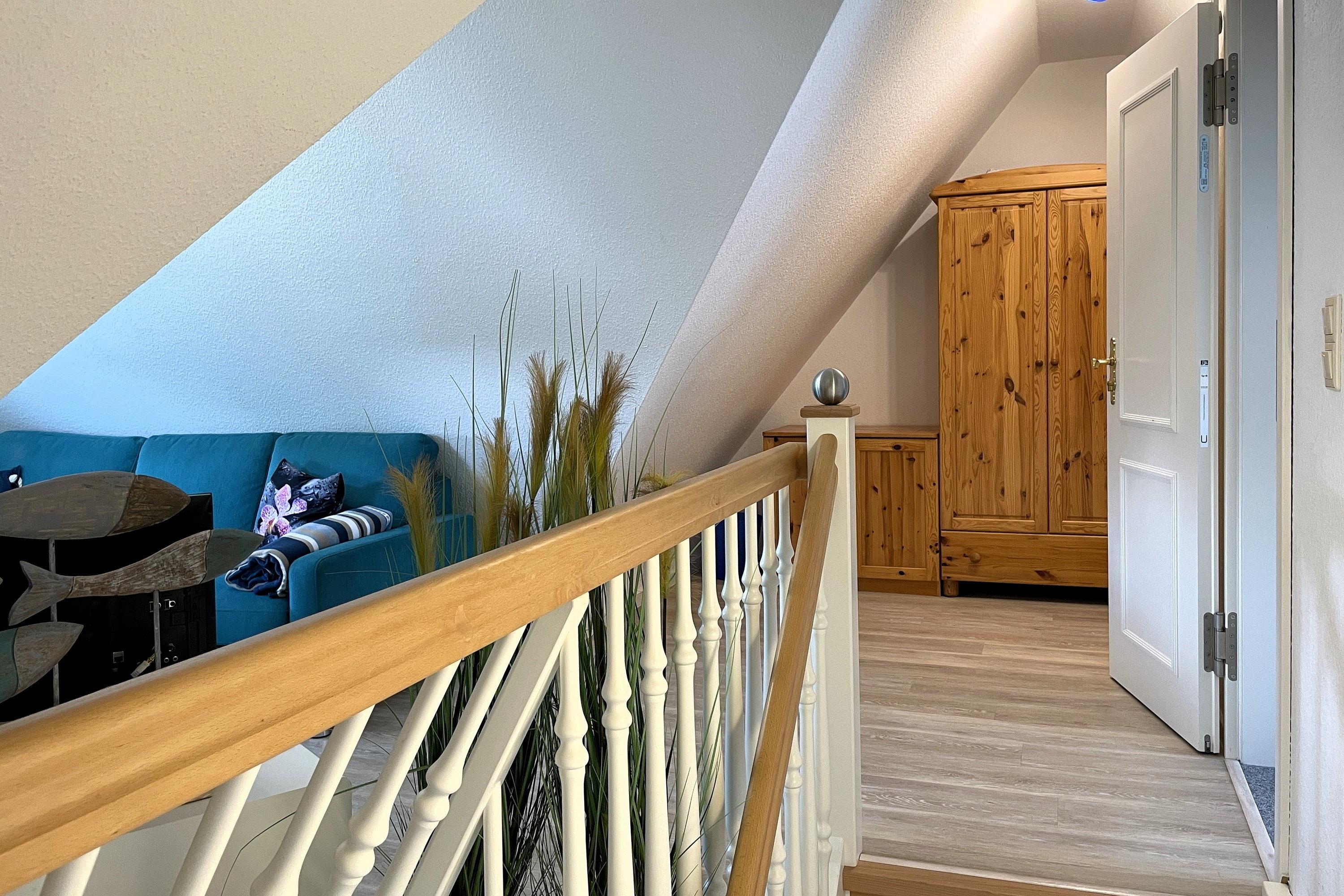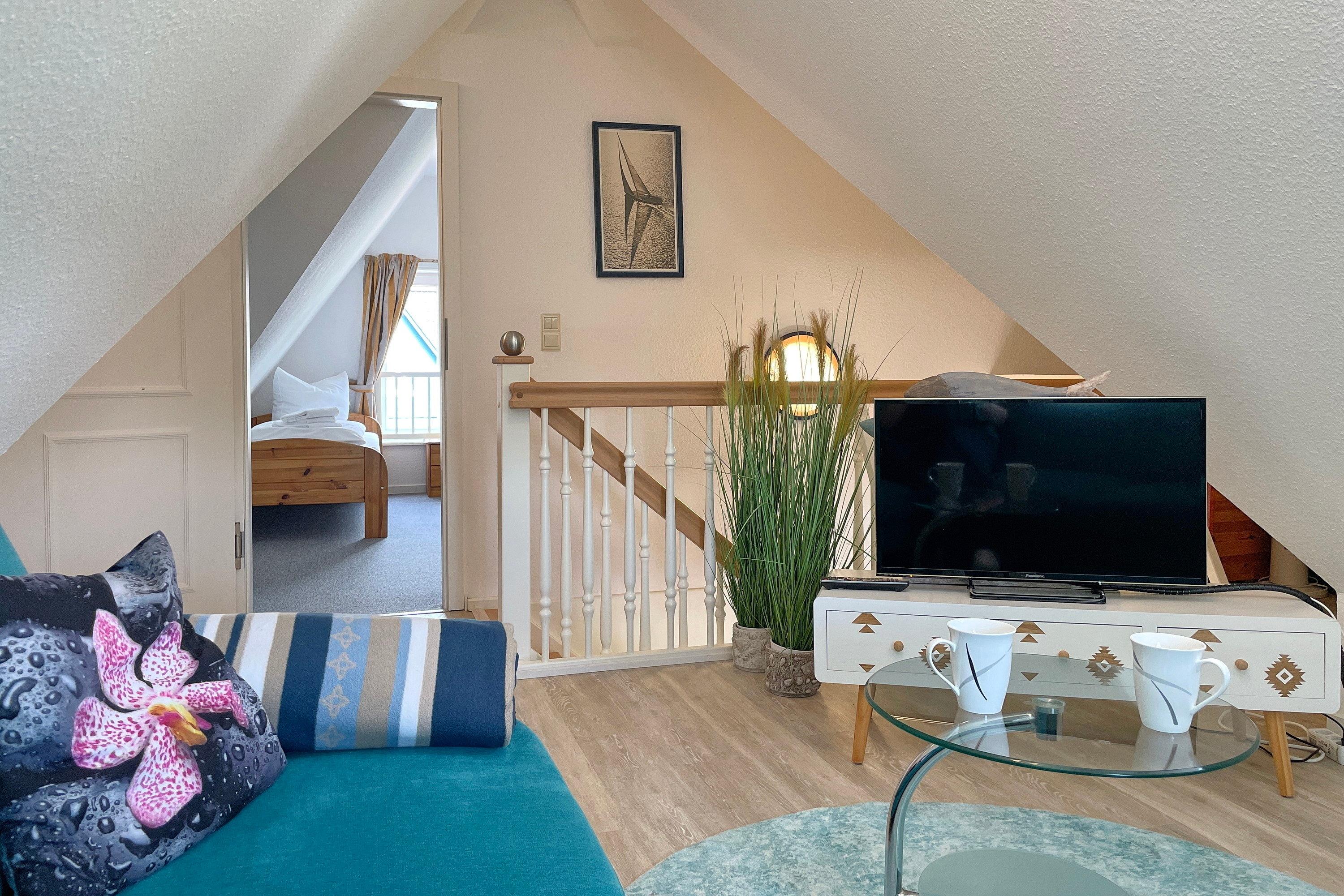 Die schöne Anlage Friesenperle in der Feldstraße 15 a und b besteht aus zwei Häusern mit jeweils 6 Wohneinheiten. Auf dem Grundstück befindet sich eine kleine Grillecke, Abstellmöglichkeiten für Ihre Fahrräder, für jede Wohnung ein eigener Parkplatz sowie für unsere kleinen Gäste eine Doppelschaukel mit Kletterleiter um sich auszutoben. Im vorderen Gebäude steht allen Gästen zur gemeinschaftlichen Nutzung im Keller ein Waschraum mit Waschmaschine und Trockner ( jeweils gegen Gebühr), Wäscheständer und Bügelbrett mit Bügeleisen sowie eine Sauna (gegen Gebühr) mit Duschmöglichkeit und Ruheraum zur Verfügung. Durch die Lage in zweiter Reihe zur Straße ist die Anlage besonders bei befreundeten Familien, die gerne gemeinsam verreisen möchten besonders beliebt, doch auch Pärchen verleben wunderbare Urlaubstage. Die zentrale Lage ermöglicht es in wenigen Minuten das Friesenmuseum, das Wellenbad Aqua Föhr und den Abenteuerspielplatz Löwenhöhle im nahe gelegenen Wald zu besuchen oder einen Spaziergang durch die hübschen Gassen der Wyker Innenstadt zu unternehmen, um die vielen freundlichen Cafés, Geschäfte und Restaurants kennenzulernen. Die gemütliche Obergeschosswohnung Friesenperle 11 (ca. 45 qm) erstreckt sich über das erste Obergeschoss und das Dachgeschoss. Die liebevolle Einrichtung und ausgewählte Accessoires verleihen der Wohnung eine einladende Gemütlichkeit. Im ersten Obergeschoss der Wohnung befindet sich die offene Küche mit dem einladenden Essbereich sowie dem Telefon und einem Fernseher, ein Schlafzimmer mit Doppelbett und das hellgeflieste Bad, welches über eine Dusche und einen Handtuchheizkörper verfügt. Sowohl über den Essbereich als auch über das Schlafzimmer können Sie auf den Südbalkon mit Gartenmöbeln (von ca. April bis Oktober) gelangen. Über eine Treppe zum offenen Dachgeschoss. Hier befindet sich ein gemütlicher Wohnbereich mit WLAN, Flachbild-TV, Stereoanlage, der zum Verweilen einlädt. Das zweite Schlafzimmer ist ausgestattet mit zwei Einzelbetten und mit einer Tür vom restlichen Wohnbereich abgeteilt ist. Verbringen Sie entspannte Urlaubstage in einer Wohnung, die sich ideal für Familie eignet. Wir freuen uns auf Ihren Anruf!