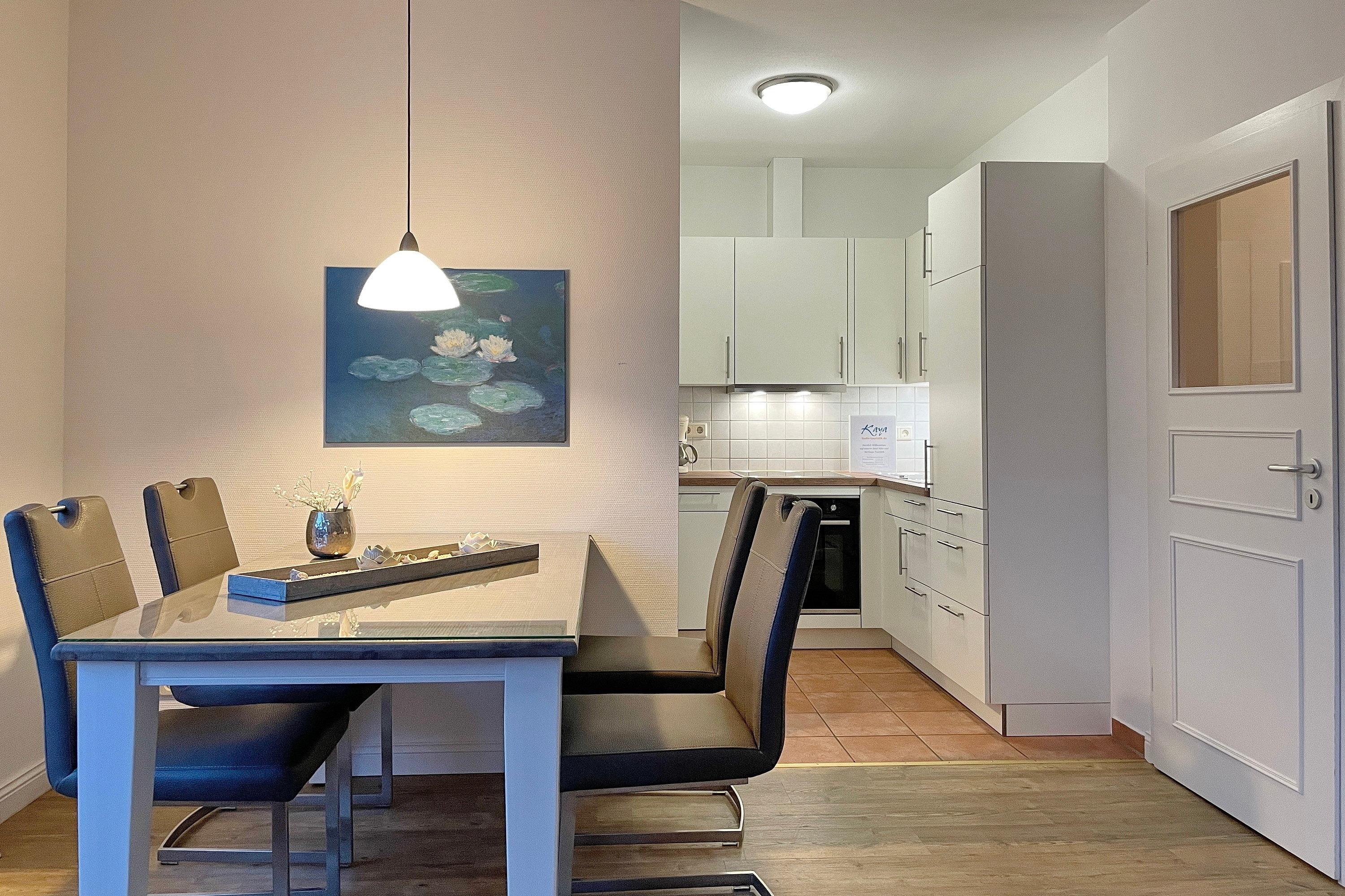 Das Galeriehaus ist ein historisches Gebäude von Wyk, welches außen immer noch den einstigen Charme von vergangenen Zeiten aufweist, doch innerhalb der Fassade umgebaut und renoviert wurde. Jetzt befinden sich im Galeriehaus 4 Wohnungen für je 2 Personen. Die zentrale Lage zur Innenstadt, dem Strand und der Nordsee, dem Meerwasserwellenbad Aqua Föhr und zu den Einkaufläden machen unsere Wohnungen im Galeriehaus sehr beliebt. Unsere kleine, hübsche Obergeschoßwohnung Monet eignet sich mit 40 qm ideal für 2 Personen. Der offene Wohnraum mit integrierter Küchenzeile und Essplatz ist hell und freundlich gestaltet. Die großzügige Essecke bietet Platz für ein reichhaltiges Frühstück am Morgen und abends lädt die bequeme Couch dazu ein, gemeinsam einen Film zu schauen oder ein gutes Buch zu lesen. Die kleine Küchenzeile ist gut ausgestattet und verfügt über einen Ceranfeldherd mit Backofen, einen Kühlschrank mit Gefrierfach; Wasserkocher und Kaffeemaschine sind natürlich ebenfalls vorhanden. Das Badezimmer ist funktional hergerichtet mit Dusche, Handtuchheizung, Schminkspiegel und Föhn. Das Schlafzimmer, ausgestattet mit Boxspringbett und geräumigem Kleiderschrank, ist nach hinten hinaus gelegen und lädt zu schönen Träumen ein.