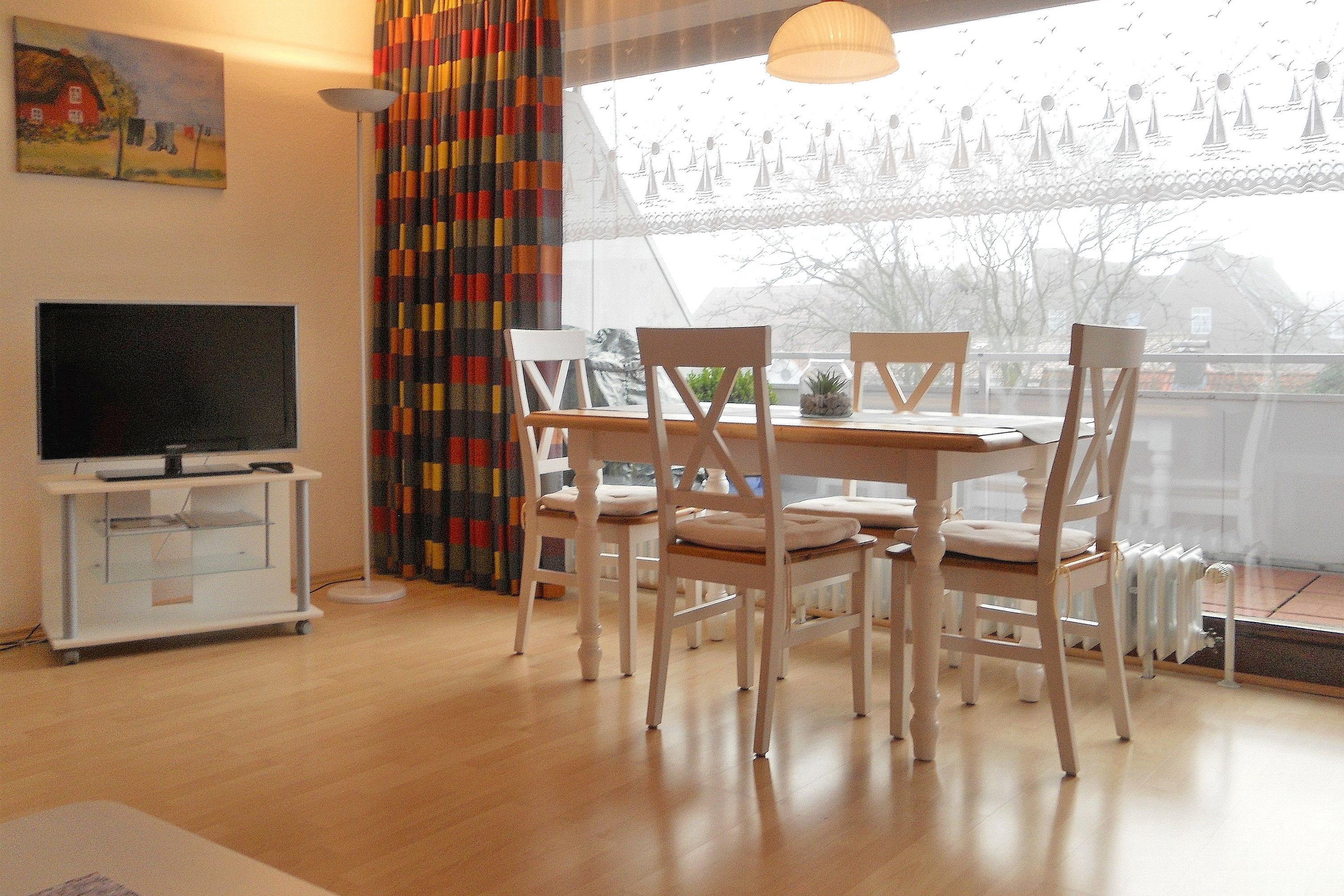 Einladend und in bester Lage bietet sich hier unsere Wohnung 7 ideal für 2 Personen als Urlaubsdomizil auf Föhr an. Sie sind mitten in der kleinen Wyker Innenstadt und natürlich ganz nah am Strand und dem Meer. Genießen Sie entspannte Stunden in unserer Wohnung "Große Straße Wohnung 7" nach oder vor einem erlebnisreichen Urlaubstag. Die Wohnung befindet sich im zweiten OG und bietet Dank des Panoramafensters im Wohnzimmers und Dank des großen Balkons einen herrlichen Ausblick über die Dächer und das Leben von Wyk. Mit viel Liebe wird die Wohnung gepflegt und die gute Ausstattung lässt keine Wünsche offen. Das gemütliche Schlafzimmer mit Doppelbett mit verstellbaren Lattenrosten, gelegen zur großen Straße, verfügt über einen geräumigen Kleiderschrank, das funktionale Bad mit Dusche, WC und Waschbecken ist hell gefliest und der großzügige Wohn- und Essbereich ist modern und geschmackvoll gestaltet. Die Küchenzeile ist klein, aber fein und verfügt über eine Mikrowelle, einen Kühlschrank mit Gefrierfach, Backofen mit Ceranfeld und einen Geschirrspüler. Der Tag startet bereits fantastisch, wenn Sie bereits morgens auf dem großen 5 m breiten Südbalkon ihr Frühstück genießen können und die frische Nordseeluft einatmen.. Schauen Sie also am Betsen gleich nach, ob Ihr Wunschtermin noch frei verfügbar ist und wir erstellen Ihnen gerne ein unverbindliches Angebot.
