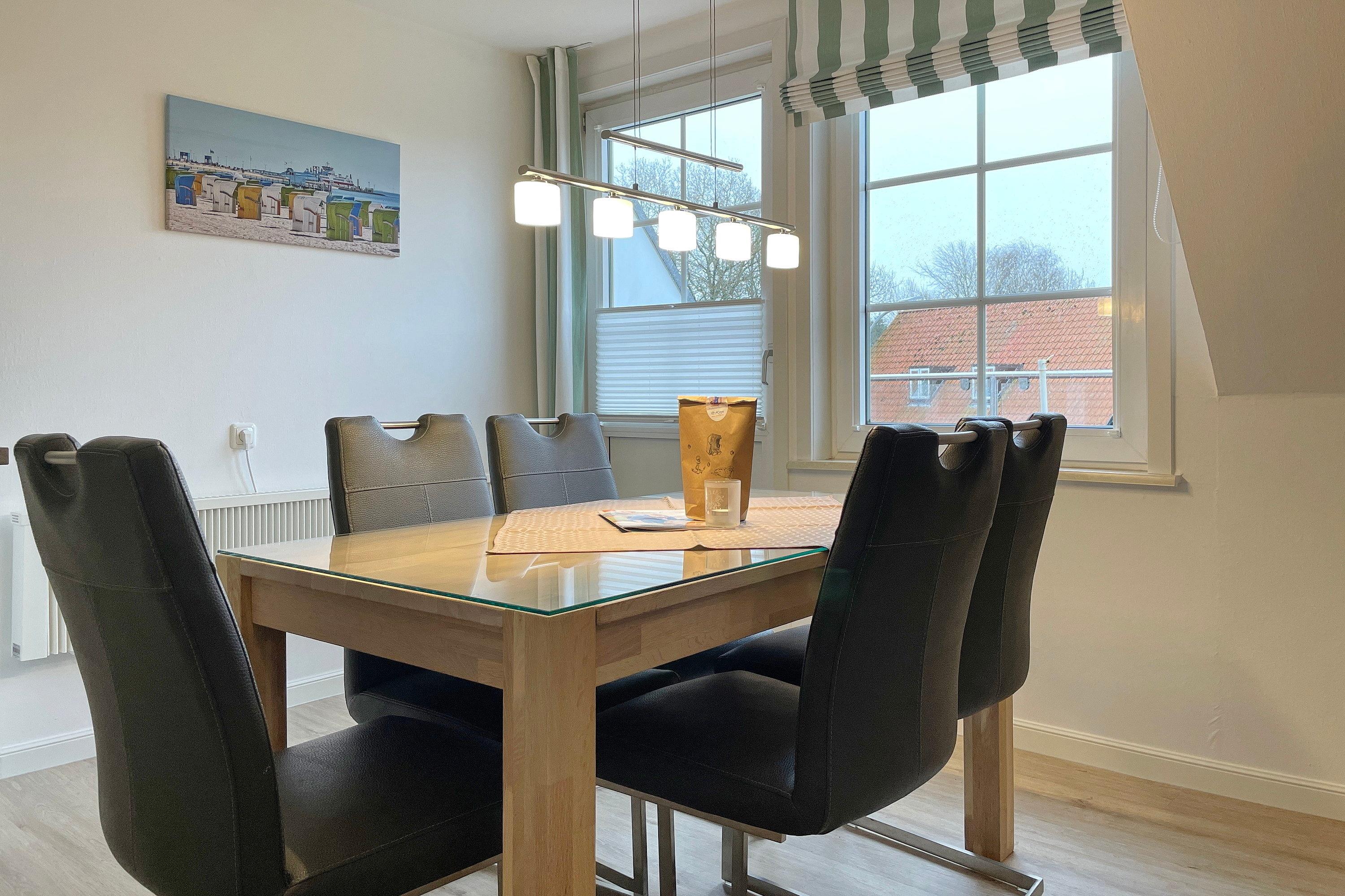 Das Haus am Stadtpark gelegen im Grünstreifen unweit des Stadtparkes mit seinen schönen Waldwegen und dem Abenteuerspielplatz Löwenhöhle ist eine gepflegte Anlage mit einem weitläufigen Grundstück. Hier befindet sich für alle Gäste der Anlage neben einem kleinen Spielplatz und einer Sitzecke auch die Möglichkeit gegen eine geringe Gebühr Waschmaschine und Trockner zu benutzen und die Fahrräder in dem Keller unterzustellen. Eine finnische Dampfsauna (gegen Gebühr) und ein kleiner Fitnessraum laden zum Verweilen ein. Viele Gäste genießen die ruhige Lage, wobei Sie einen Bäcker, einen Schlachter, den kleinen gut sortierten Einkaufsladen und natürlich den Strand und das Meer fußläufig erreichen können. Die Obergeschosswohnung im Haus am Stadtpark ist eine ideale Wohnung für Familien, welche sich über zwei Etagen erstreckt. Im 1. Obergeschoss befindet sich das moderne Badezimmer mit großzügiger Dusche, die beiden Schlafräume und der geräumige Wohnschlafraum mit integrierter Küche und Essplatz. Das Wohnzimmer verfügt über eine Sitzgarnitur (Schlafcouch 170 x 190 cm), einen elektrisch verstellbaren Relax Sessels , Smart-TV, WLAN und auf der anderen Seite des Raumes befindet sich die gut ausgestattete Küche mit einem Essplatz. Von hier aus gelangen Sie auf einen kleinen Balkon, der für 2 bis 3 Personen ausgerichtet ist. Ruhige Nächte verbringen Sie in den beiden Schlafzimmern. Das Elternschlafzimmer ist mit einem Doppelbett (180 x 200 cm) und einem Kleiderschrank ausgestattet, wobei das kleine Kinderzimmer ein Bett (90 x 200 cm) sowie eine Kommode vorweist.