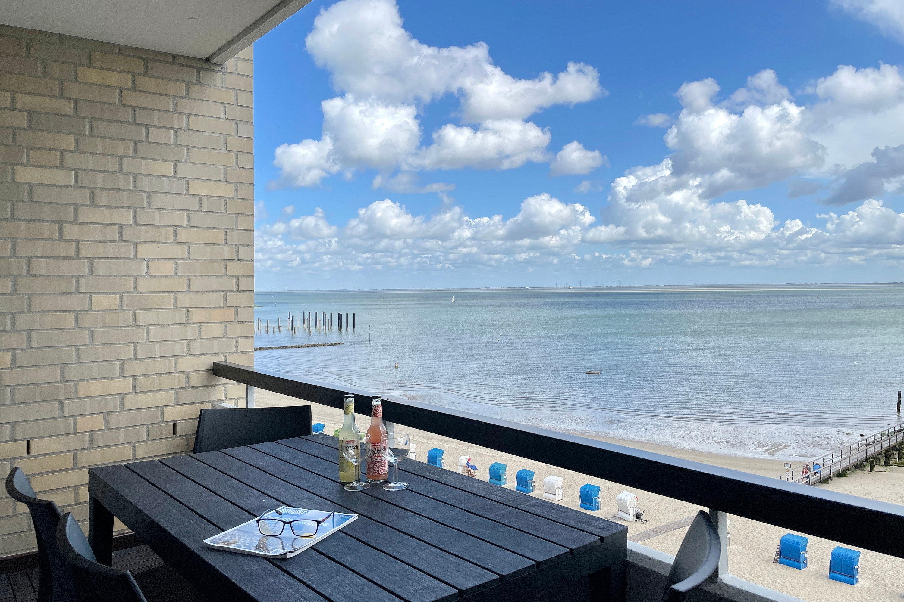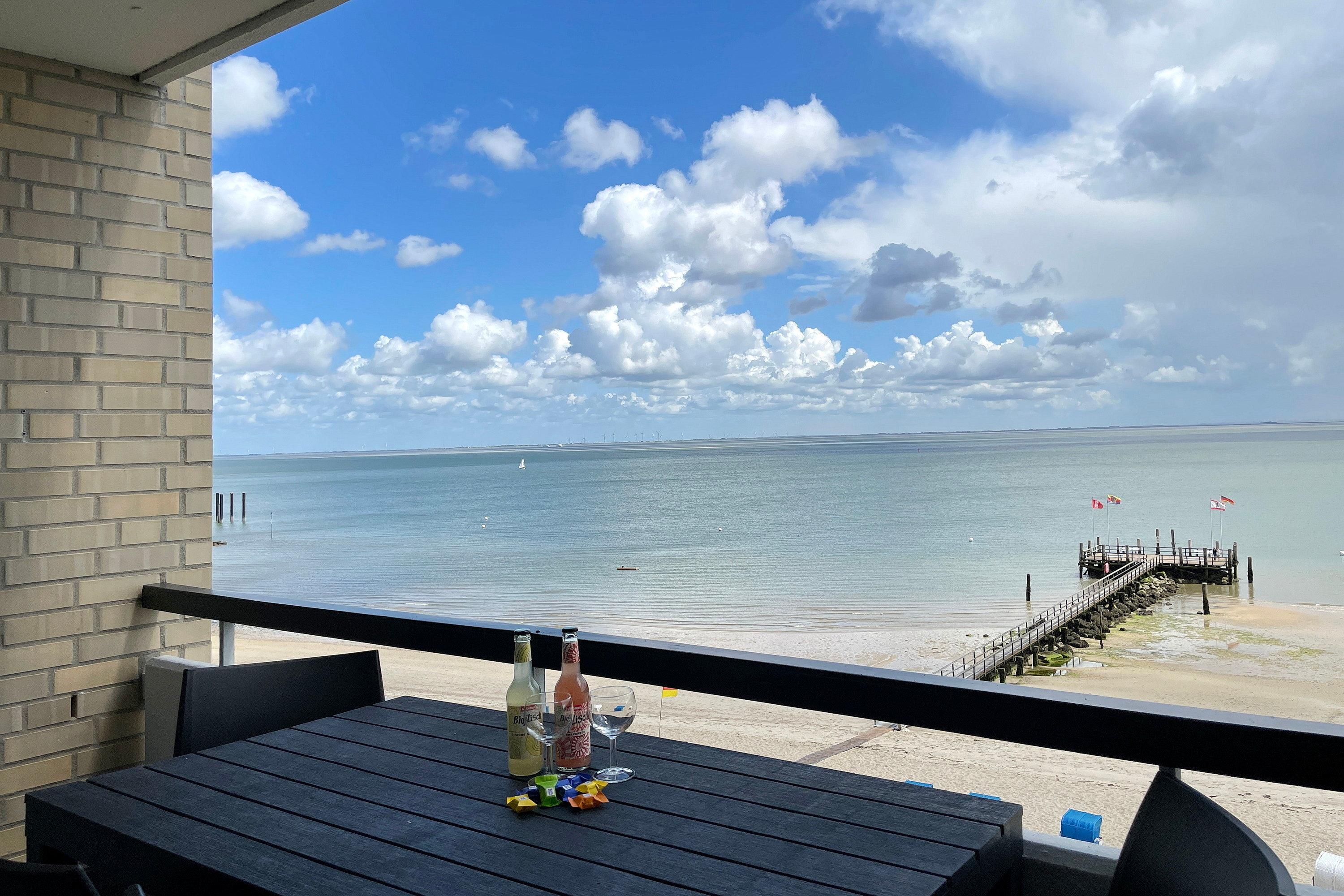 Windgeschützt in der Logia des Hauses Irma am Sandwall in Wyk genießen Sie bei jedem Wetter die Aussicht auf den Strand und das Wattenmeer. Ein besonders schöner Moment ist, wenn die Sonne am Meereshorizont erwacht..