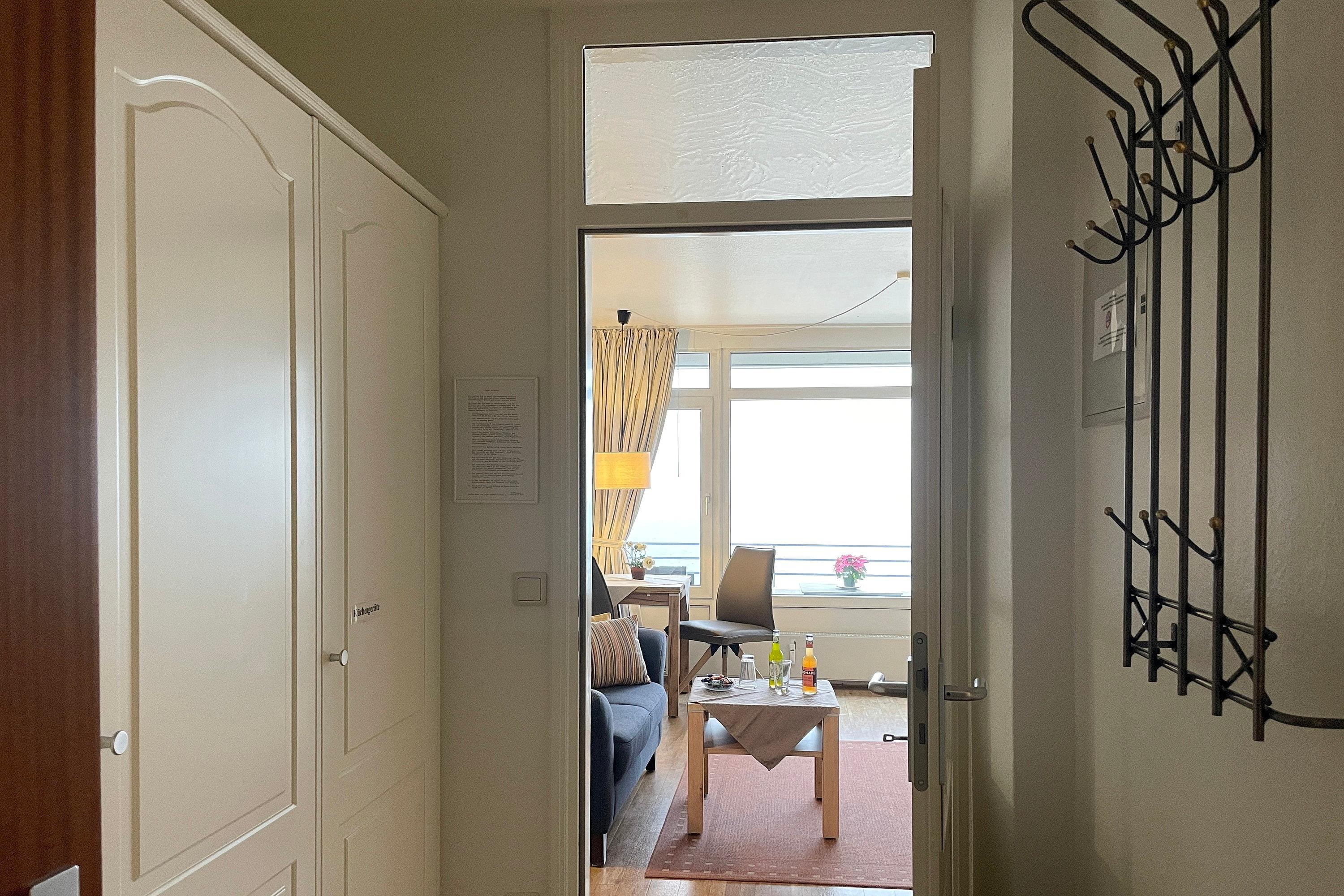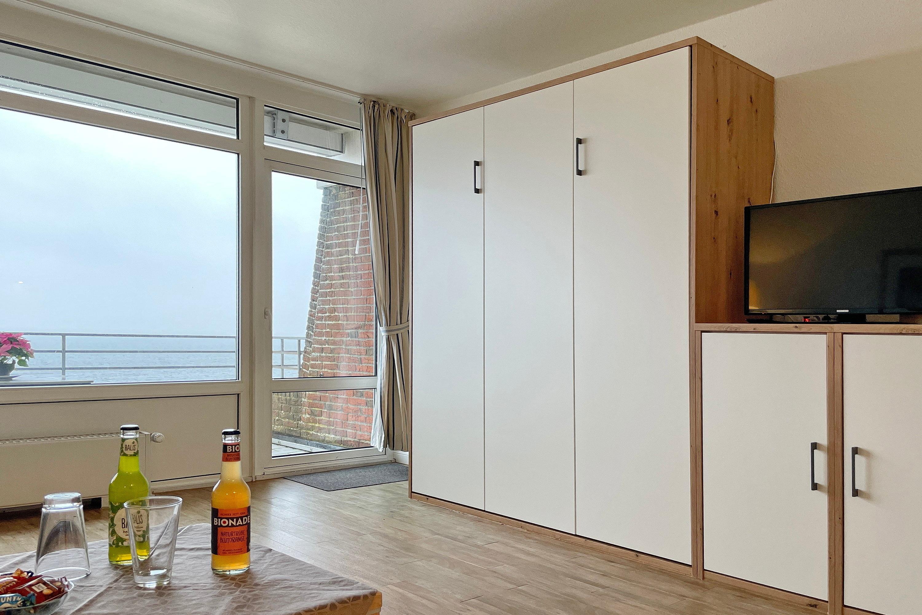 Im ruhigeren Abschnitt des belebten Sandwalls befindet sich das Haus Klaar Kiming direkt vor der Strandpromenade. In wenigen Minuten sind Sie mitten im Geschehen und können die vielen freundlichen Cafés und Restaurants besuchen, in den kleinen Geschäften bummeln gehen oder sich im Aqua Föhr vergnügen. Im Haus befindet sich eine Waschmaschine und Trockner, die gegen eine geringe Gebühr zur gemeinschaftlichen Nutzung bereitsteht. Vom Keller aus gelangen Sie durch einen zweiten Eingang (Ostern bis Ende Oktober wetterabhängig) auch direkt an die Promenade und den Strand. Die Wohnungen bieten hier einen herrlichen Blick über das Meer und Sie können die Fähren, die Möwen und Ebbe und Flut vom Balkon oder der Terrasse aus beobachten. Unsere gemütliche Wohnung Klaar Kiming 5b befindet sich im 5. Obergeschoss des Hauses, welche Sie bequem mit dem Aufzug oder sportlich über die Treppe erreichen können. Der lichtdurchflutete Wohnschlafraum mit integrierter Küchenzeile ist ausgestattet mit WLAN, Flachbild-TV, einer bequemen Sitzgruppe und einem Esstisch, der sich direkt vor der Fensterfront befindet und Sie schon beim Frühstück mit dem Anblick des Meeres verwöhnt. Die im Wohnzimmer integrierte Küchenzeile ist ausgestattet mit einem Ceranfeldherd, einer Mikrowelle mit Grillfunktion, Geschirrspüler und einem Kühlschrank mit Gefrierfach. Das Doppelschrankbett (160x200cm) verspricht ruhige Nächte und das kleine Badezimmer mit Dusche ist funktional und freundlich gestaltet. Der Balkon mit Markise bietet Ihnen den unvergleichbaren Blick über den Strand und das Meer, der zum Träumen einlädt. Des Weiteren können Sie direkt durch das Untergeschoss des Hauses auf die Strandpromenade gelangen und zwischen einem erlebnisreichen Arbeitstag und dem Abendessen noch eine Runde in der Nordsee schwimmen. Erleben Sie entspannte Urlaubstage auf unserer herrlichen Insel!