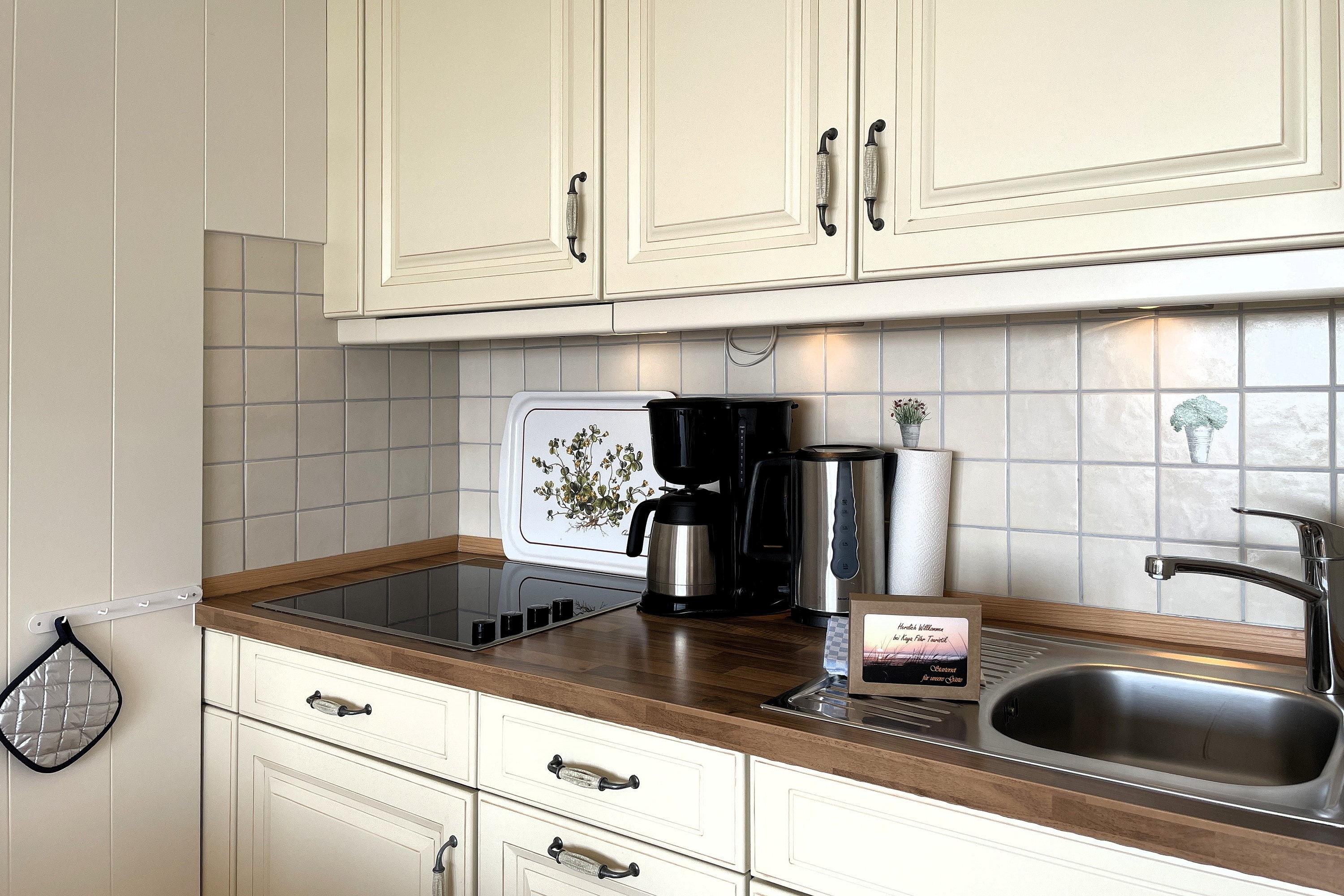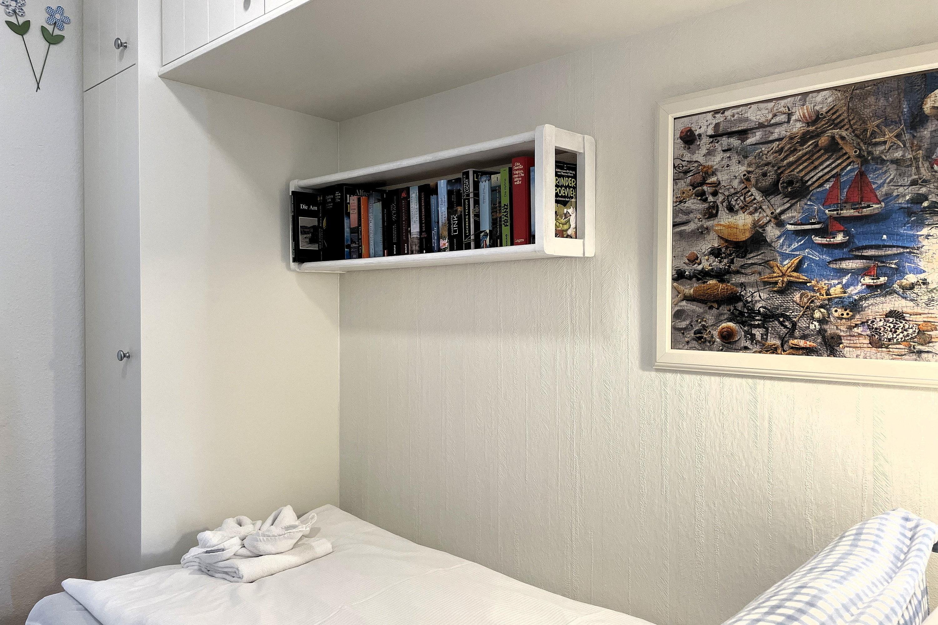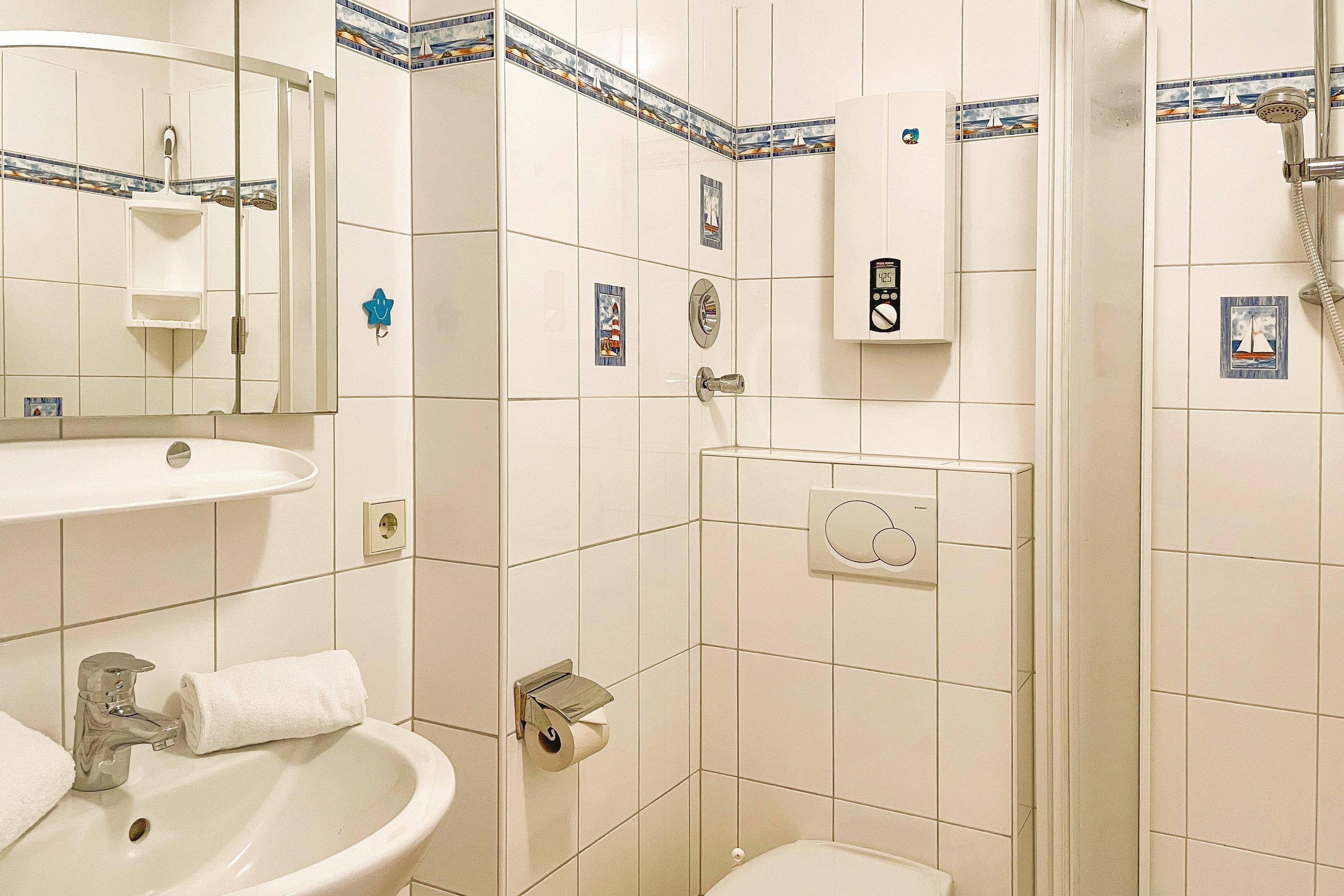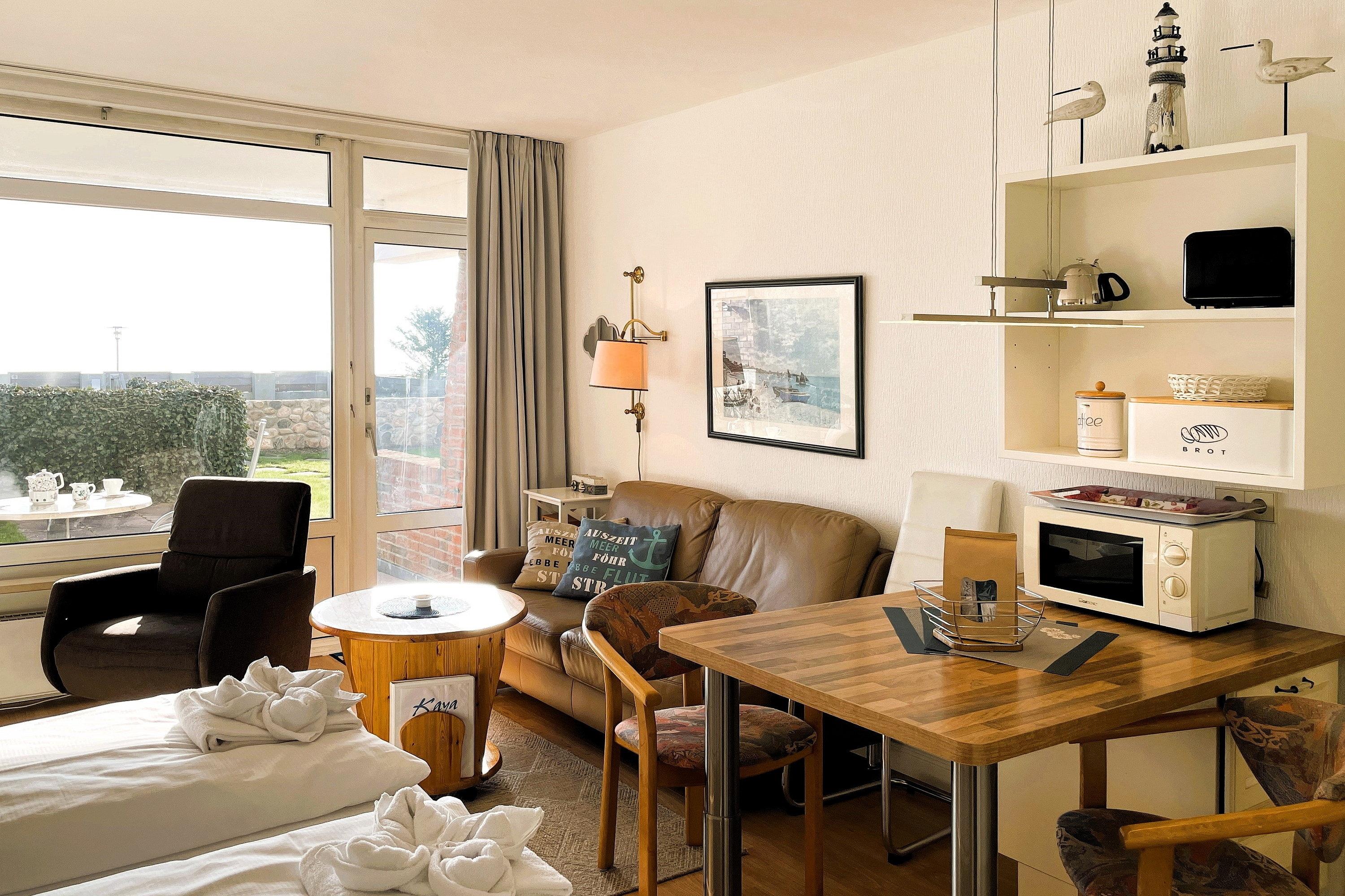 Das Appartement Meerblick 1b (ca. 33m) liegt im Erdgeschoss des Hauses und lädt zu herrlichen Urlaubstagen direkt am Strand ein. Genießen Sie das Frühstück auf der Terrasse mit großer Wiese und Blick auf das Meer. Der lichtdurchflutete Wohnraum ist freundlich gehalten und besteht aus einer gemütlichen Sitzecke, einem hochwertigen Schrankbett (160x200cm) und einer Küchenzeile mit angrenzendem Essplatz. Liebevolle Details schenken der Wohnung Ihren besonderen Flair. Im Flur befindet sich ein weiteres Bett 90x190cm) für eine Person falls Sie dort Ihren Mittagschlaf genießen möchten oder als Ausweichmöglichkeit für die Nächte. Das Bad ist hell gefliest und funktional. Genießen Sie ein Appartement in exklusiver Lage!