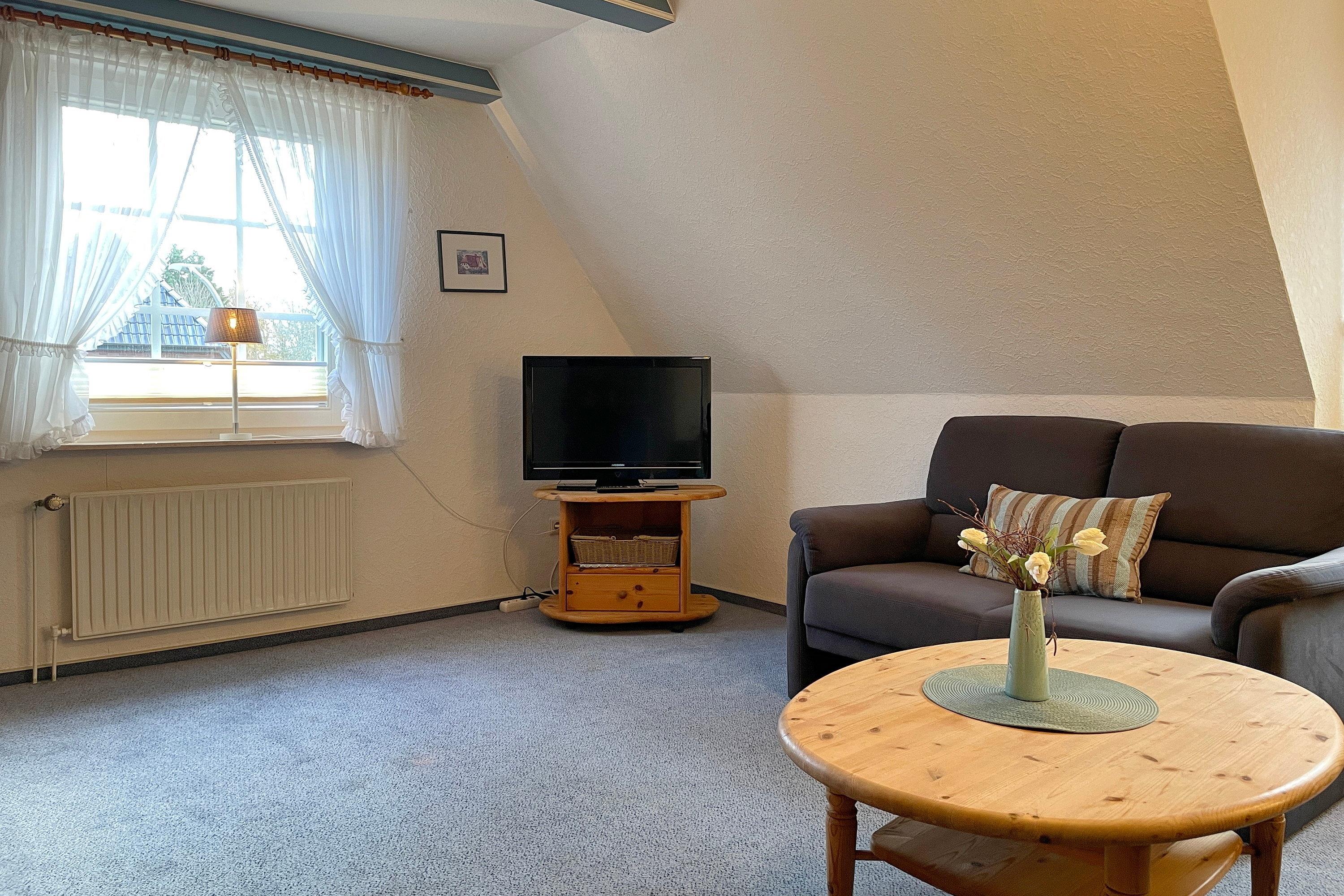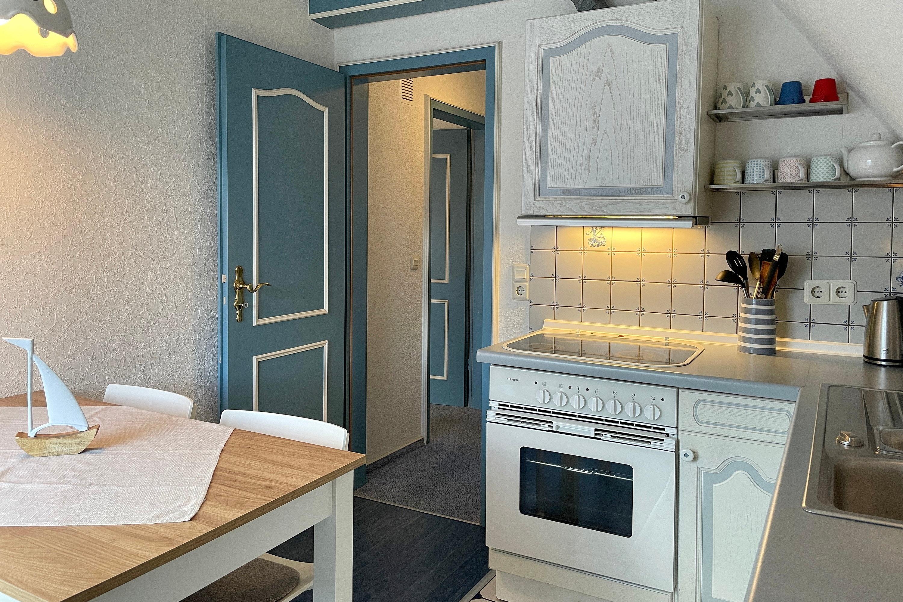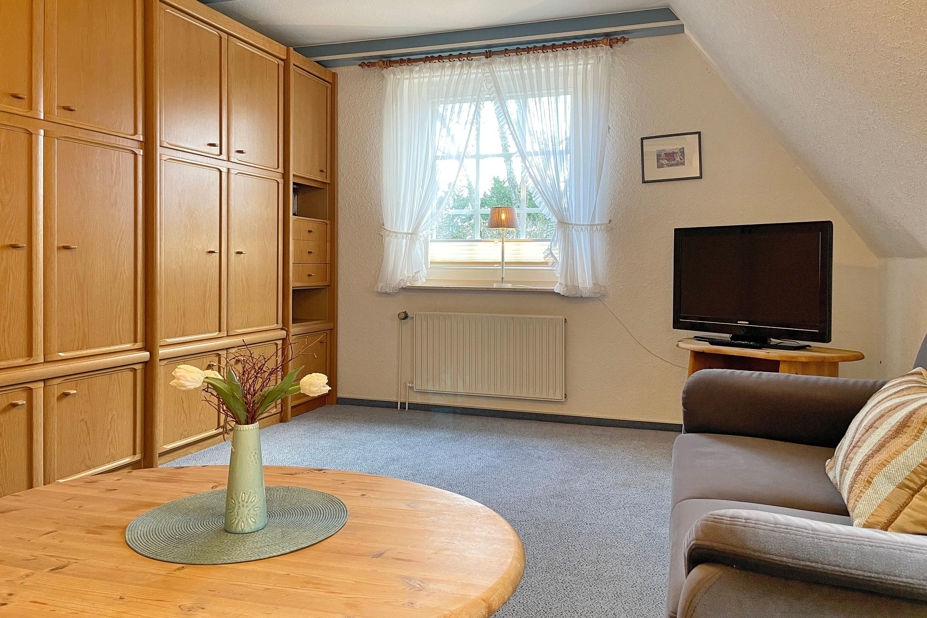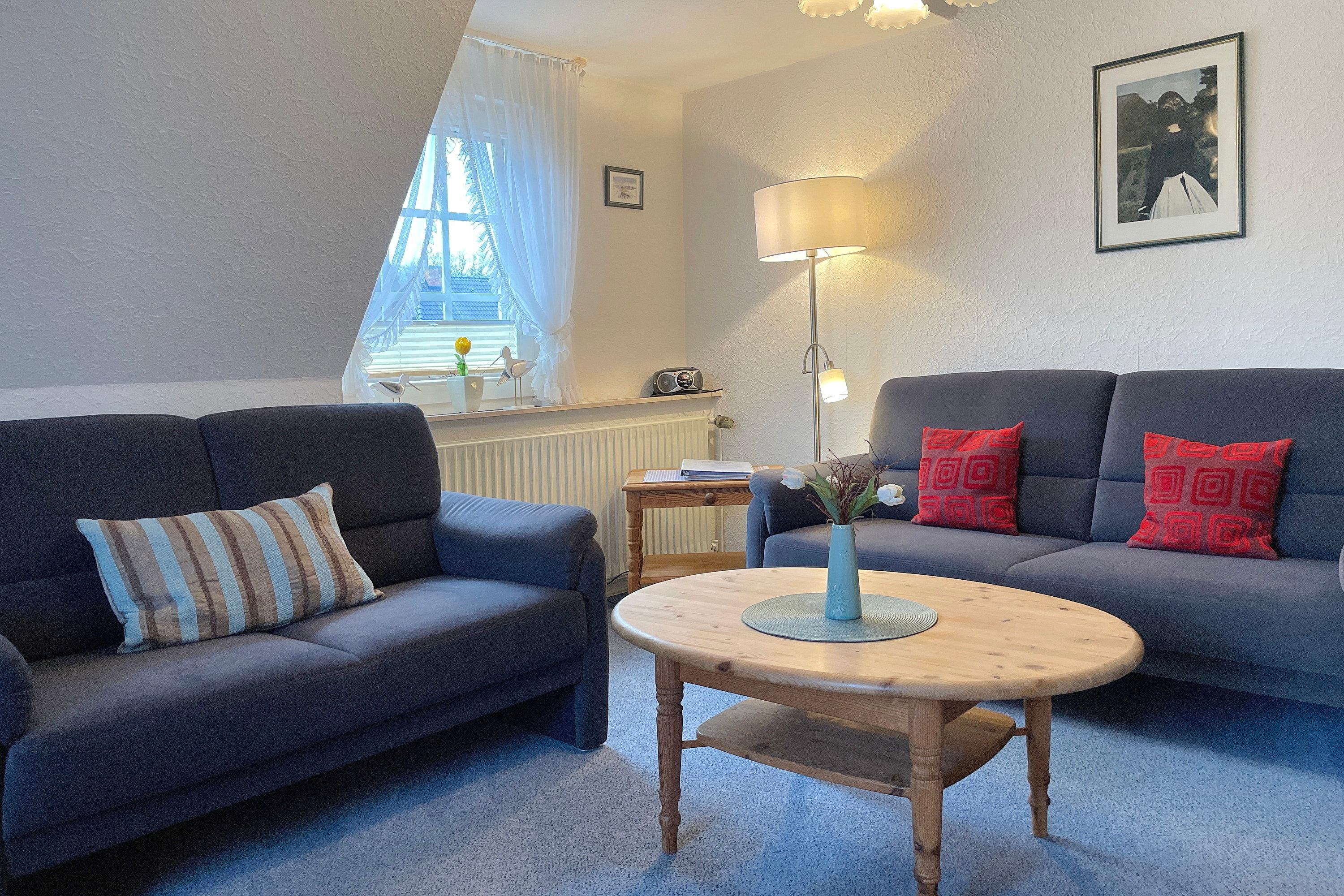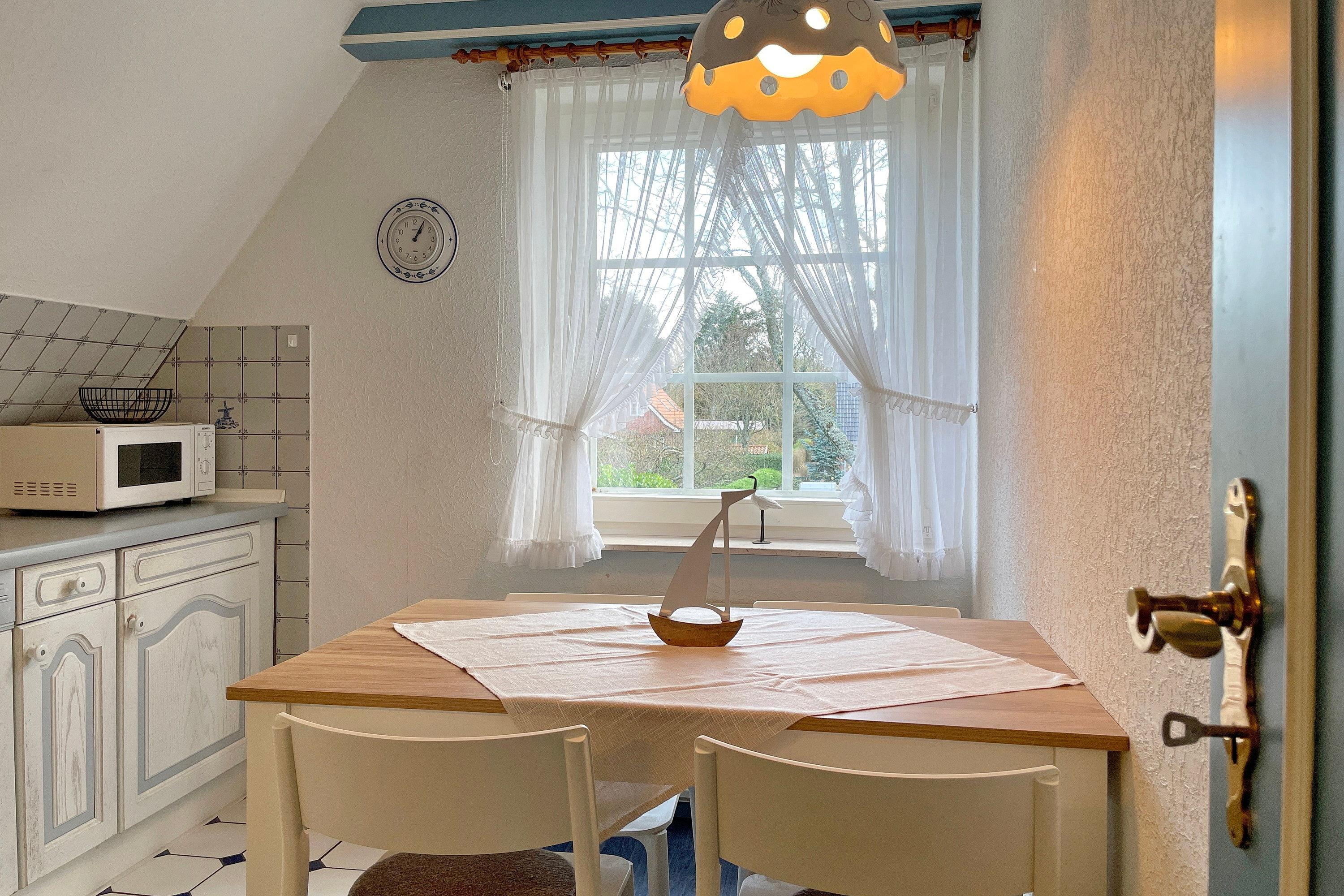 Die Obergeschosswohnung Manuela Sieck OG bietet bis zu 4 Personen schöne Urlaubstage. Das freundlich gestaltete Wohnzimmer mit zwei hochwertigen Sofas, WLAN, Flachbild-TV und zwei einzelnen Schrankbetten (je 90x 200 cm) ist lichtdurchflutet und lädt zu geselligen Abenden ein. Die Wohnküche mit integriertem Essplatz, Ceranfeldherd mit Backofen, Geschirrspüler, Kühlschrank mit Gefrierfach und Mikrowelle ist gut ausgestattet, so dass das Kochen Spaß macht. Ein geräumiges Bad mit Fenstern und ein zusätzliches WC, ebenfalls mit Fenster, sind hell gefliest. Nach einem erlebnisreichen Urlaubstag können Sie ruhige Träume im Schlafzimmer genießen, welches mit Doppelbett (180x200cm), geräumigen Kleiderschrank und einem zusätzlichen Gästebett (90x190cm)ausgestattet ist. Der individuelle und maritime Charme der Wohnung macht dieses Domizil bei seinen Gästen sehr beliebt. Wir freuen uns auf Ihren Anruf!