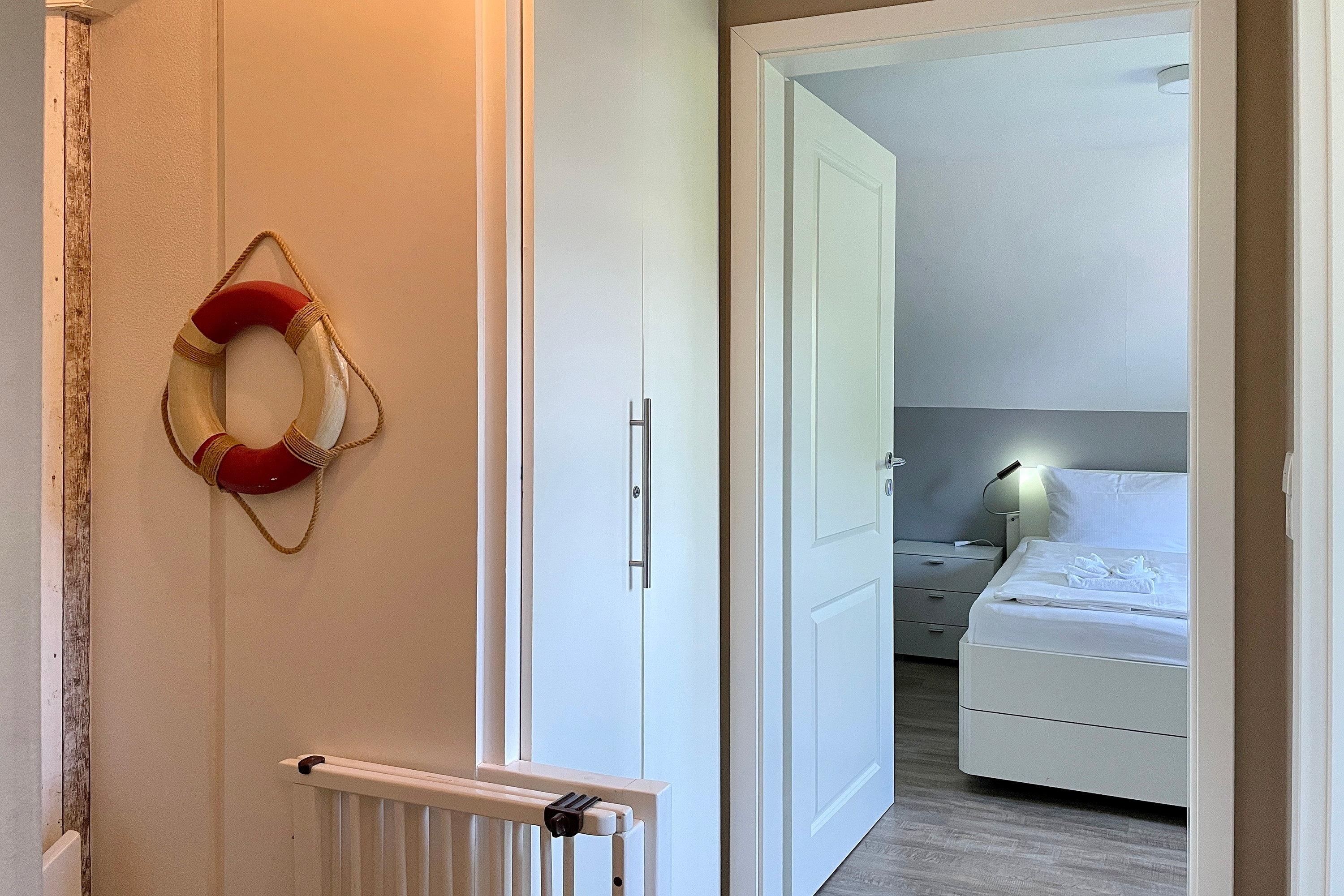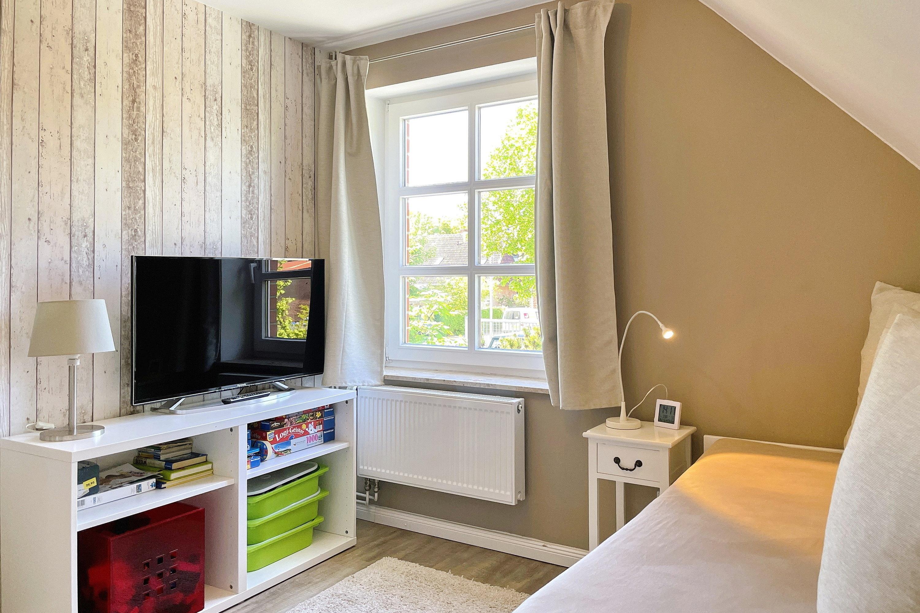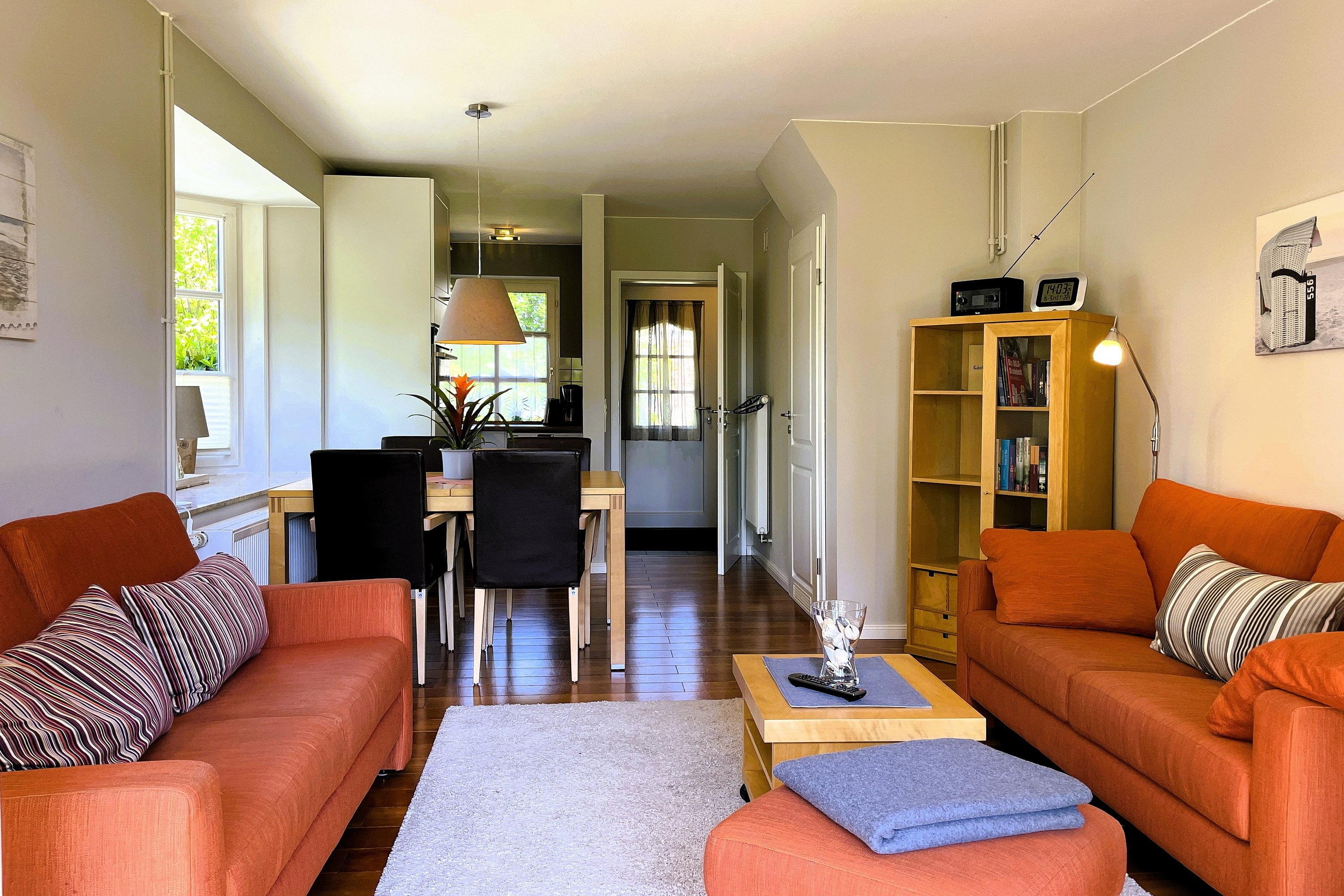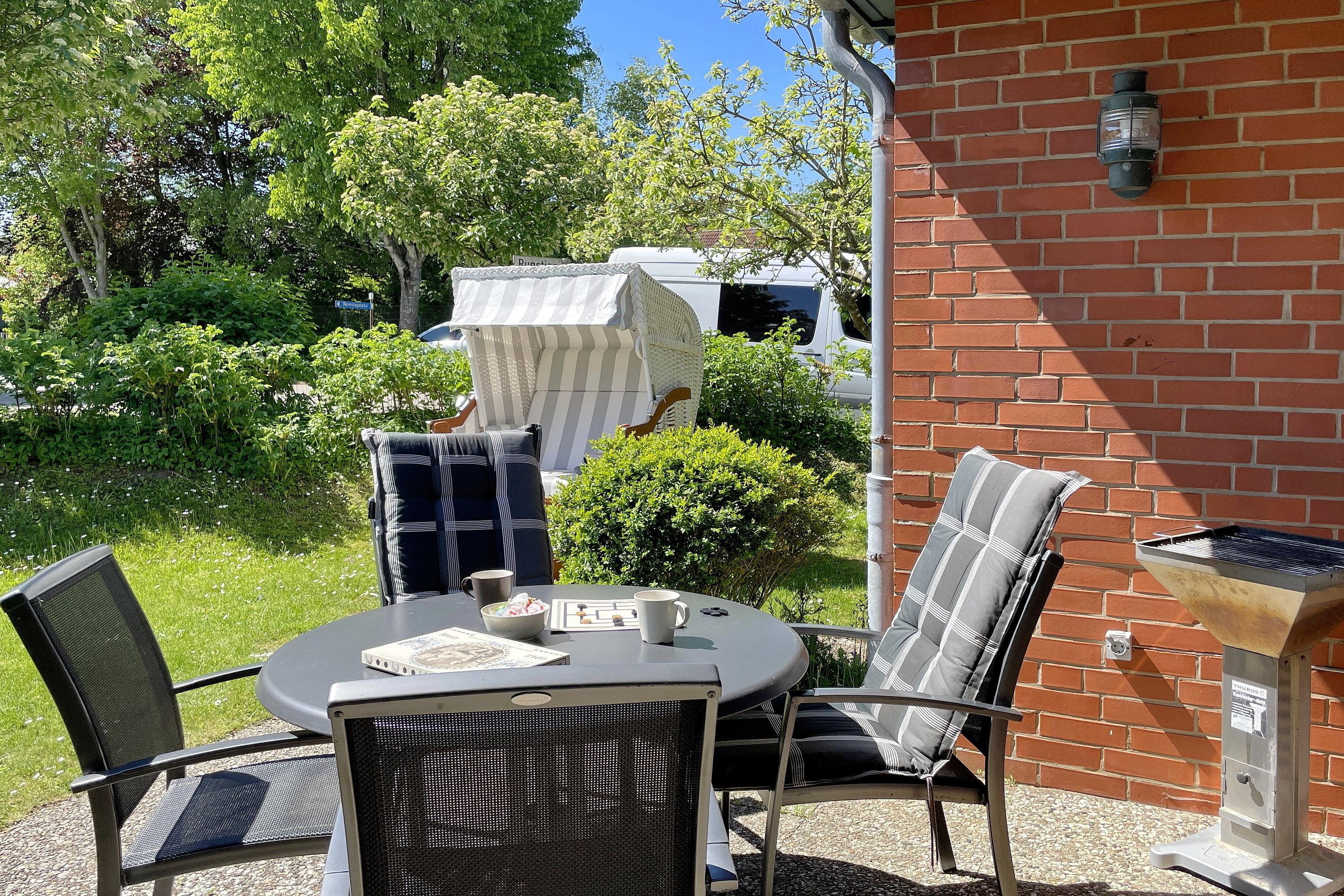Herzlich willkommen in unserem Reihenendhaus "Meine Insel", Ihrem perfekten Rückzugsort für Paare und Familien. Auf ca. 60 qm bietet die Nichtraucher-Wohnung Platz für 1 bis 4 Gäste und besticht durch eine gemütliche Ausstattung mit Inselflair. Im Erdgeschoss erwartet Sie ein heller Wohnbereich mit integrierter Essecke sowie eine offene, gut ausgestattete Küche mit Backofen, Ceranherd, Spülmaschine und einer kostenfreien Waschmaschine – ideal für einen längeren Urlaub. Es stehen ein Flachbildfernseher (3 im gesamten Haus, davon 2 Smart-TVs) und ein Internetradio (mit Spotify-Connect) zur Verfügung. Vom Wohnzimmer gelangen Sie direkt auf die teilüberdachte Südwest-Terrasse, die in den Sommermonaten mit Gartenmöbeln, Sonnenschirm und Strandkorb zum Sonnen und Relaxen einlädt während Kinder sich im angrenzenden Gemeinschaftsgarten austoben und sich am Spielgerät mit Schaukel erfreuen können. Über eine Treppe erreichen Sie die Schlafbereiche und das Bad. Das Elternschlafzimmer ist mit einem komfortablen Doppelbett (180 cm x 200 cm mit 2 Einzelmatratzen) ausgestattet, während das Kinderreich mit zwei Einzelbetten (90 cm x 200 cm) , einer Auswahl an Gesellschaftsspielen und Büchern sowie eine Spielkiste (Lego/Playmobil) kleine Gäste begeistert. Hier befindet sich auch ein gemütliches Tagesbett für eine kleine Auszeit. Das moderne Badezimmer verfügt über eine Dusche, einen Handtuchheizkörper und ein Fenster, das für Tageslicht und Frischluft sorgt. Ihr Auto können Sie direkt auf dem eigenen Parkplatz abstellen.