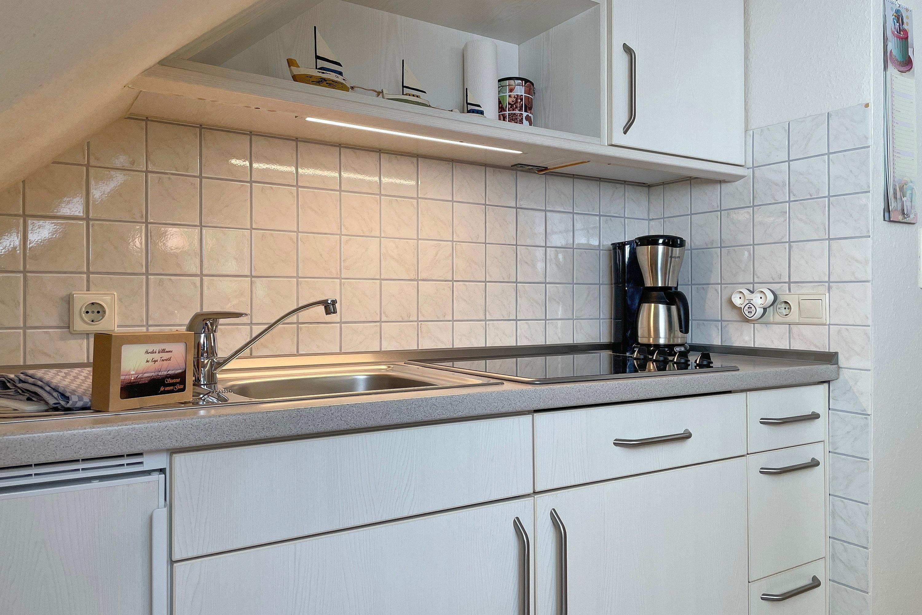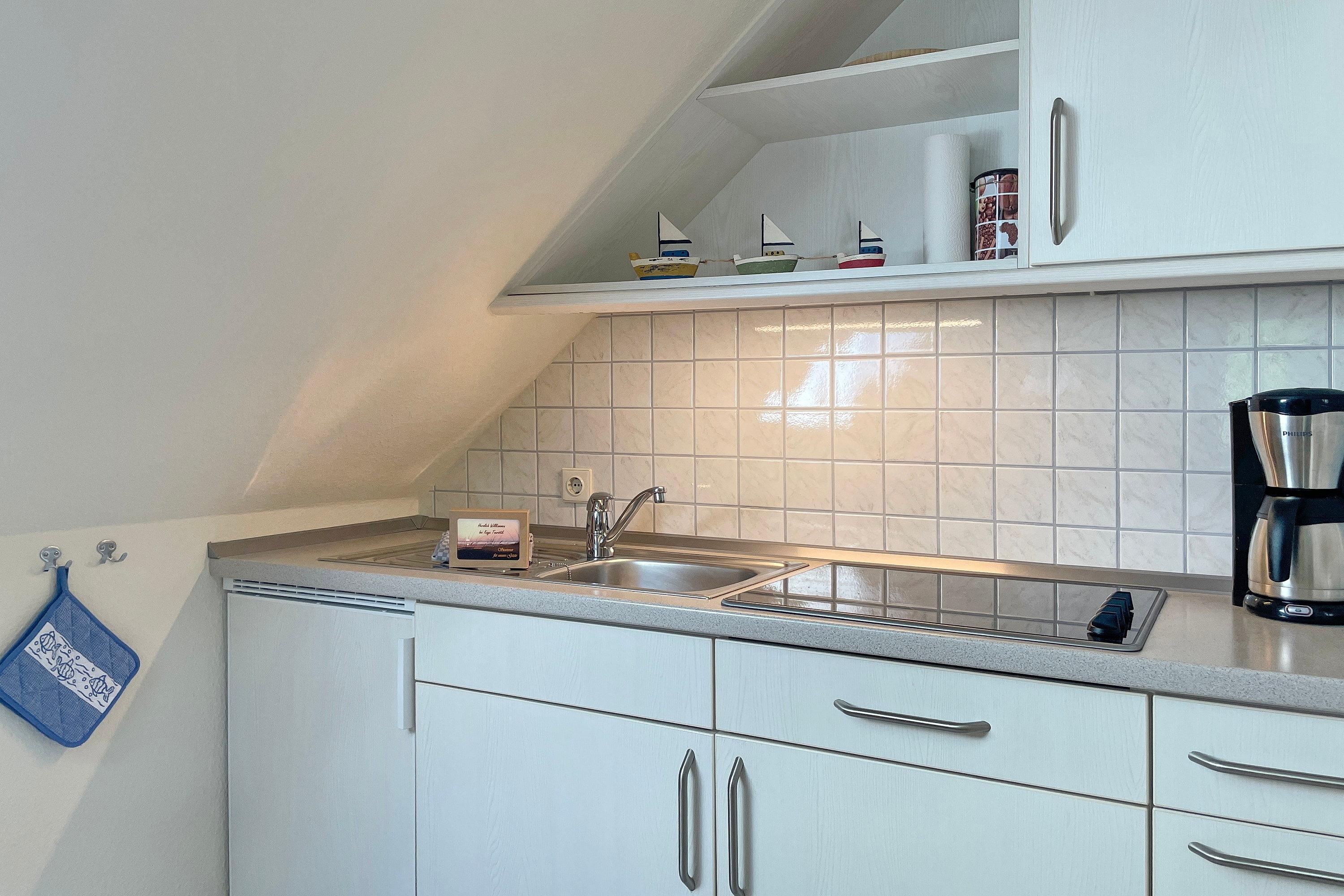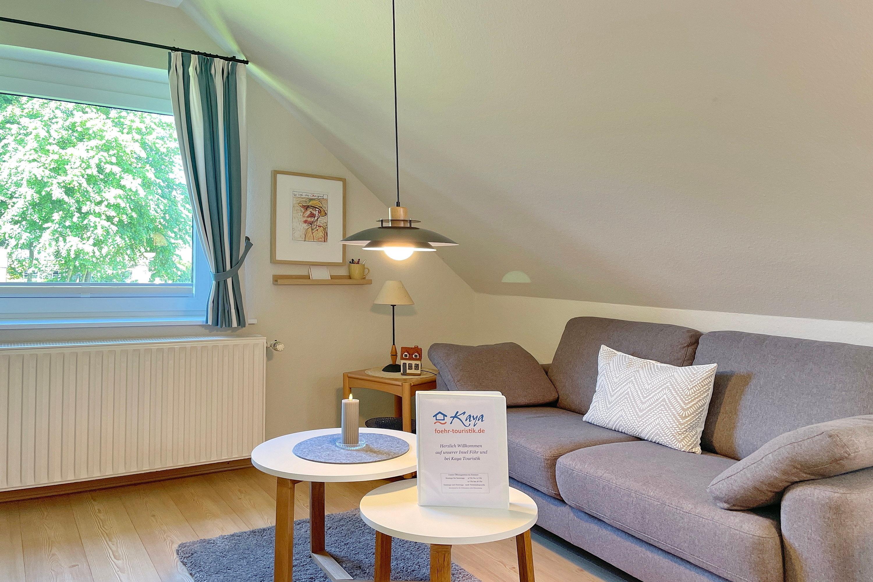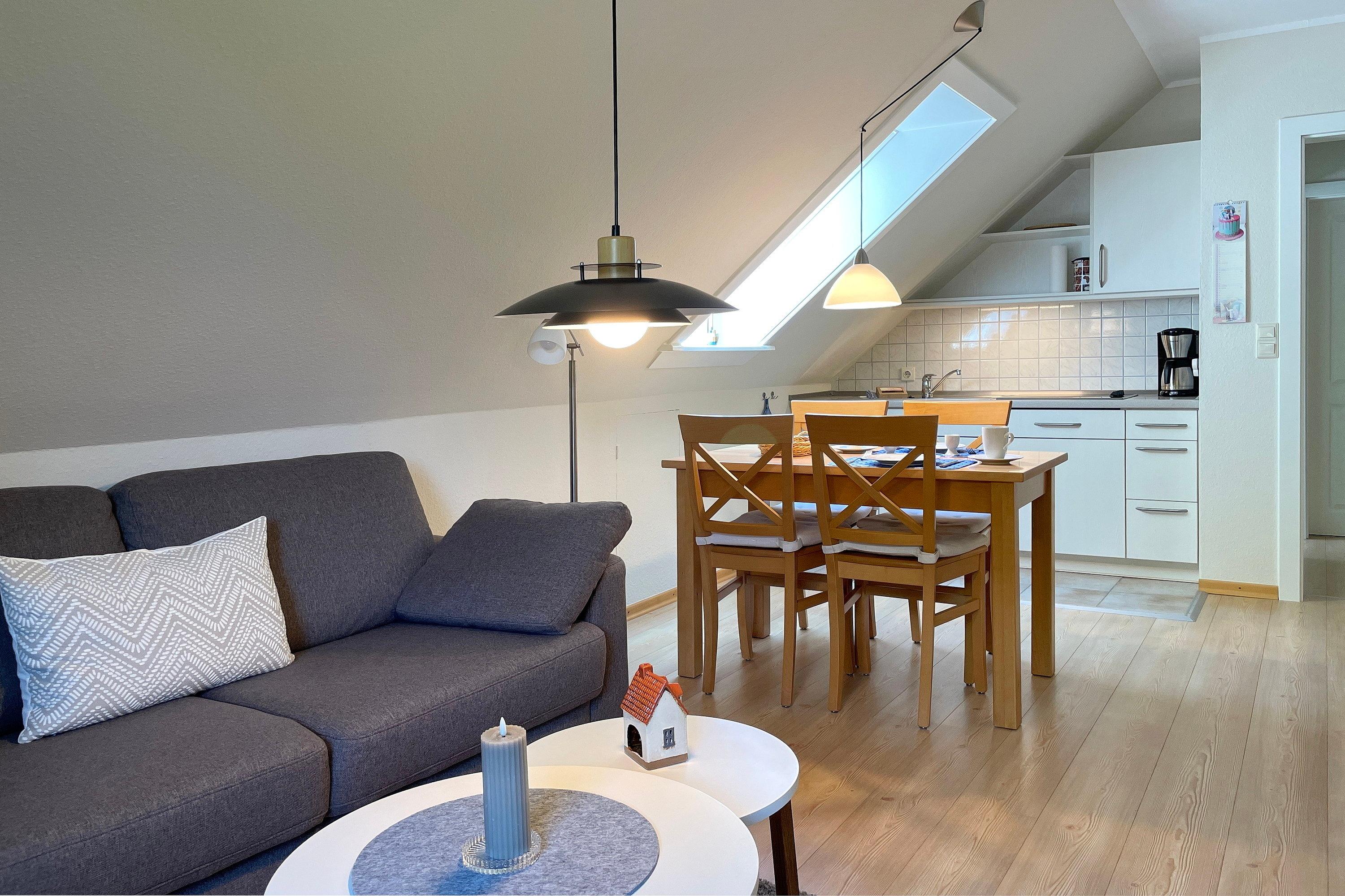 Die Wohnung Rungholt bietet auf ca. 40 qm Platz für 2 Personen und befindet sich in der ersten Etage. Der offene Wohnraum mit einer bequemen Couch und einem gemütlichem Sessel schließt an die gut ausgestattete Küchenzeile an und lädt zum Verweilen ein. Die Küchenzeile mit Ceranfeld, Kühlschrank mit Gefrierfach und natürlich einer Kaffeemaschine wird durch eine großzügige Essgruppe ergänzt. Warme Holztöne und liebevolle Accessoires runden das Ambiente ab. Vom Schlafzimmer aus schauen Sie direkt auf die Wyker Windmühle. Das Schlafzimmer mit einem Doppelbett in Komforthöhe und einem geräumigen Kleiderschrank ist einladend und freundlich gestaltet. Vom Flur gelangen Sie in das hellgeflieste Badezimmer, welches mit einer Dusche und einem Fenster ausgestattet ist. Eine herzliche Gastfreundschaft erwartet Sie und wir freuen uns auf Ihren Besuch!