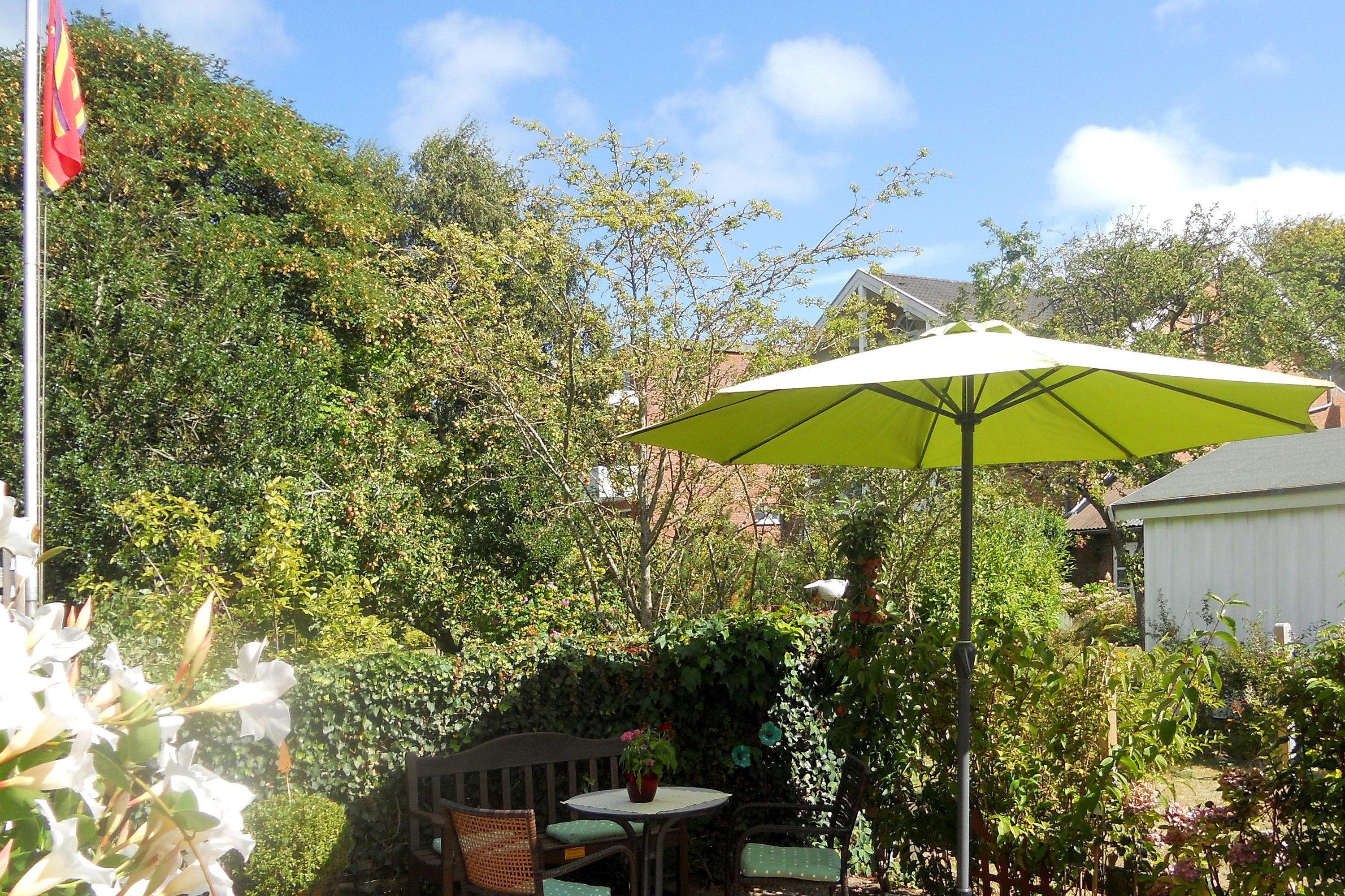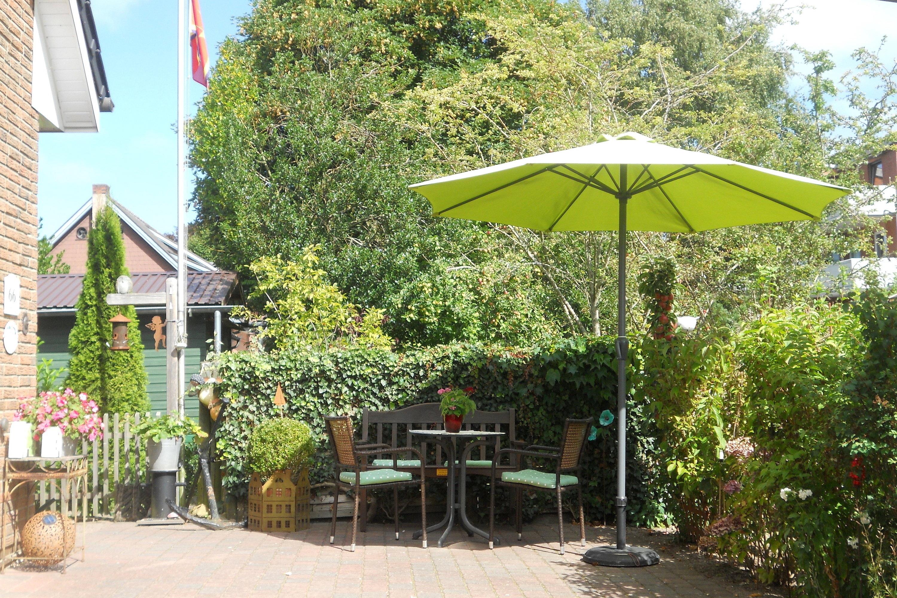 Im Garten befindet sich zur gemeinsamen Nutzung eine Sitzgelegenheit für die Wohnungen Störtebecker und Rungholt.