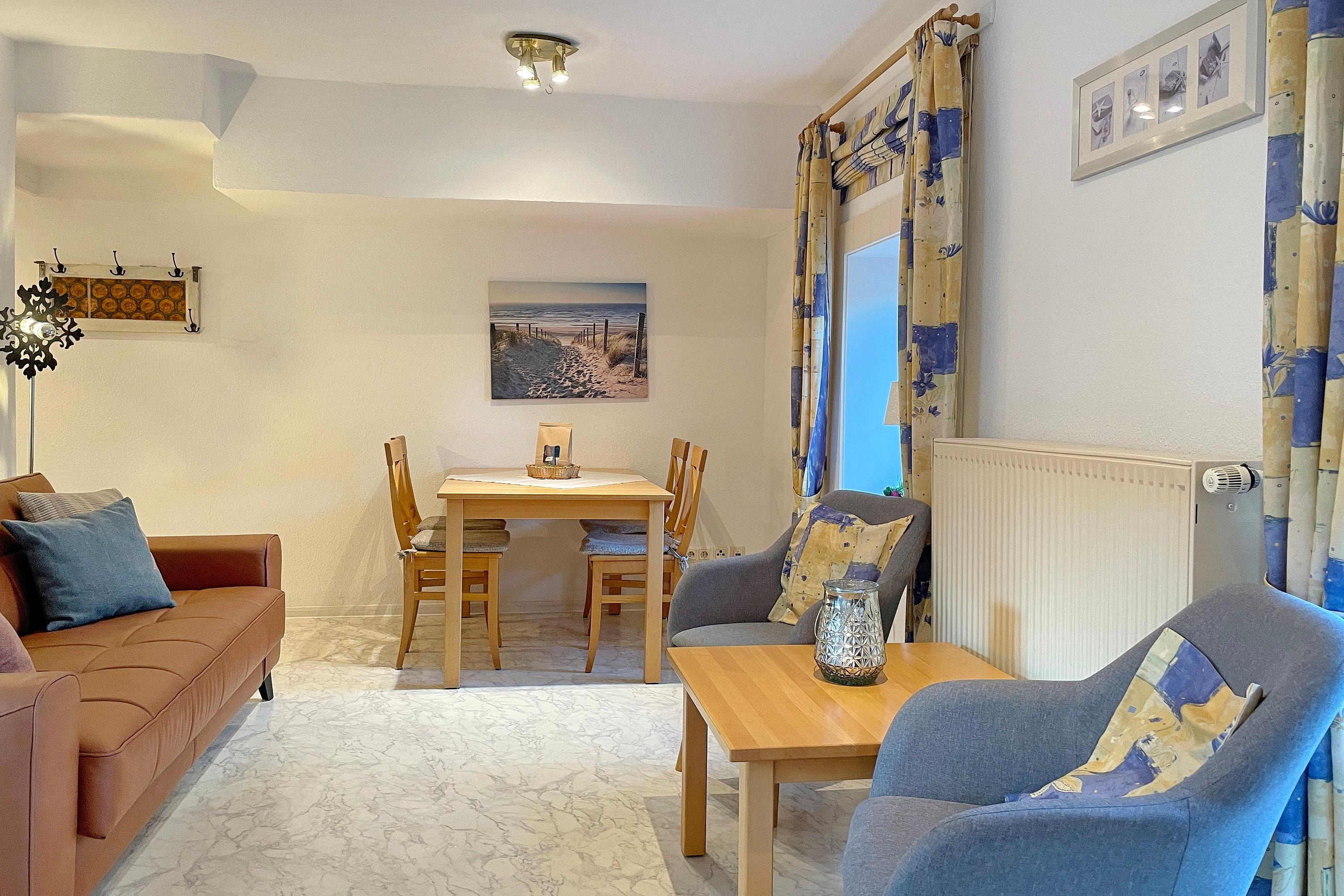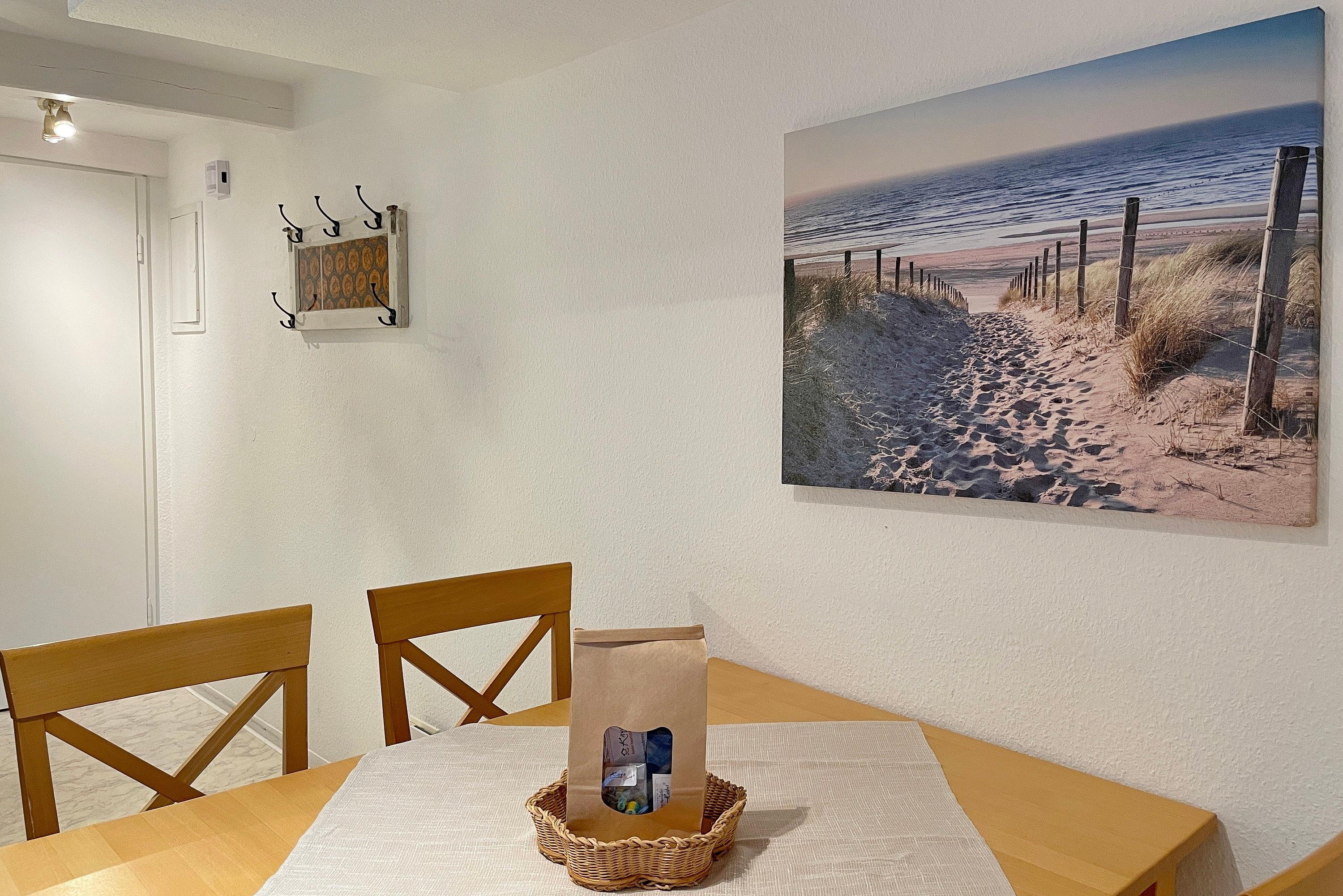 Die gemütlich eingerichtete Wohnung Nordstern ist hell und freundlich gestaltet und befindet sich im ersten Obergeschoss. Vom kleinen Flur aus gelangen Sie in das funktionale Duschbad mit Fenster und in den Wohn-, Essbereich. Warme Holztöne und schöne Farben verleihen der Wohnung eine besondere Note. Das Sofa ist bequem und kann für eine dritte und vierte Person zu einem Schlafsofa (160 cm x 200 cm) ausgezogen werden. Der Esstisch bietet genügend Platz. WLAN, Flachbild-TV und CD-Player finden Sie natürlich vor. Von hier aus gelangen Sie auch auf den Balkon, die separate vollausgestatteter Küche mit Geschirrspüler, Kühlschrank, Kaffeemaschine (Senseo Duo) Ceranfeld-Herd mit Backofen und das geräumige Schlafzimmer mit Doppelbett (180x200 cm) und großem Kleiderschrank. Die Bäckerei, das Kino, gemütliche Cafés und Restaurants, der Edeka-Markt und viele kleine und größere Geschäfte befinden sich in unmittelbarer Umgebung genauso wie der Strand und das Meer natürlich..